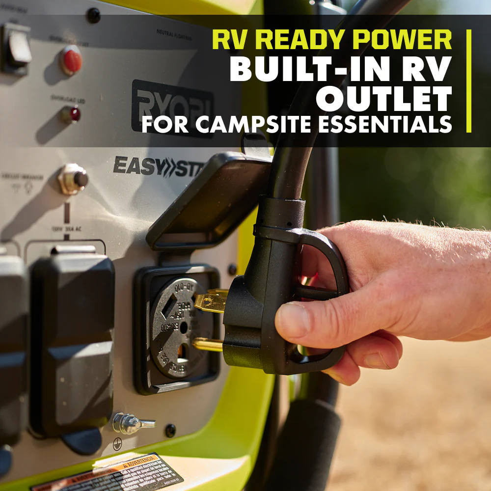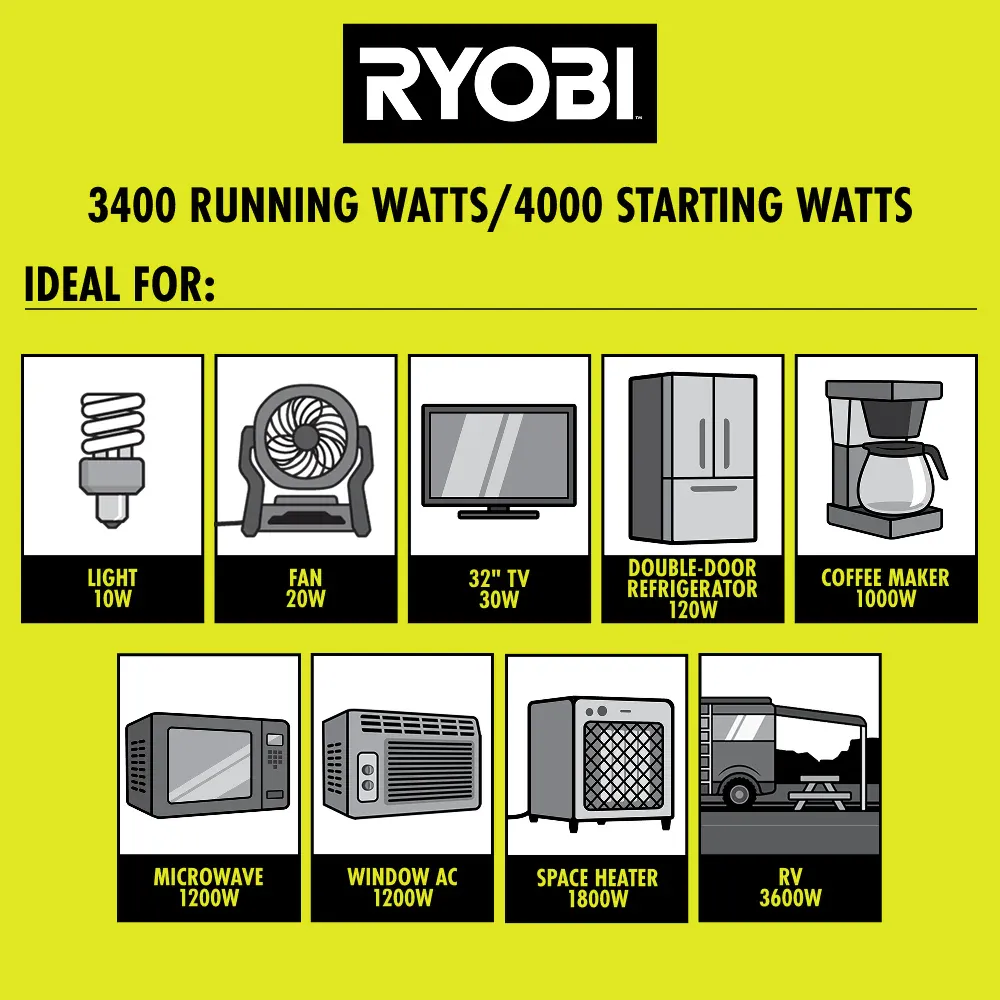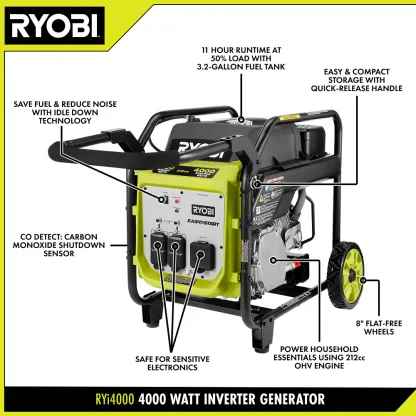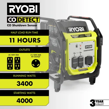 The RYOBI 4000 Watt Inverter Generator is built to power your lifestyle, whether enjoying the outdoors, running your RV, or staying prepared for storms. Equipped with a 212cc OHV engine, this generator delivers 4000 starting watts and 3400 running watts, making it ideal for electronics, RV equipment, household essentials, and more. With pure sine wave technology, it is safe for sensitive devices like laptops or TVs. Power multiple devices simultaneously using four 120V 20A household outlets. The 120V 30A RV outlet lets you plug in your RV directly, great for powering portable air conditioners or small appliances. The large 3.2 gallon fuel tank offers up to 11 hours of runtime at 50% load, providing extended runtime without the need for frequent refueling. Featuring idle down technology, your generator automatically reduces its engine speed when less power is needed, maximizing fuel efficiency and minimizing noise. The built-in CO Detect carbon monoxide shutdown sensor automatically shuts down the generator when dangerous carbon monoxide levels are detected. Designed for convenience, the generator features a durable hand truck frame, 8” flat-free wheels, and fold-down quick-release handles for easy mobility and compact storage. This tool is backed by the RYOBI 3-Year Manufacturer’s Tool Warranty and includes 4000 Watt Inverter Generator, 8” Flat-Free Wheels, Feet, Engine Lubricant, Assembly Hardware, and Operator’s Manual.