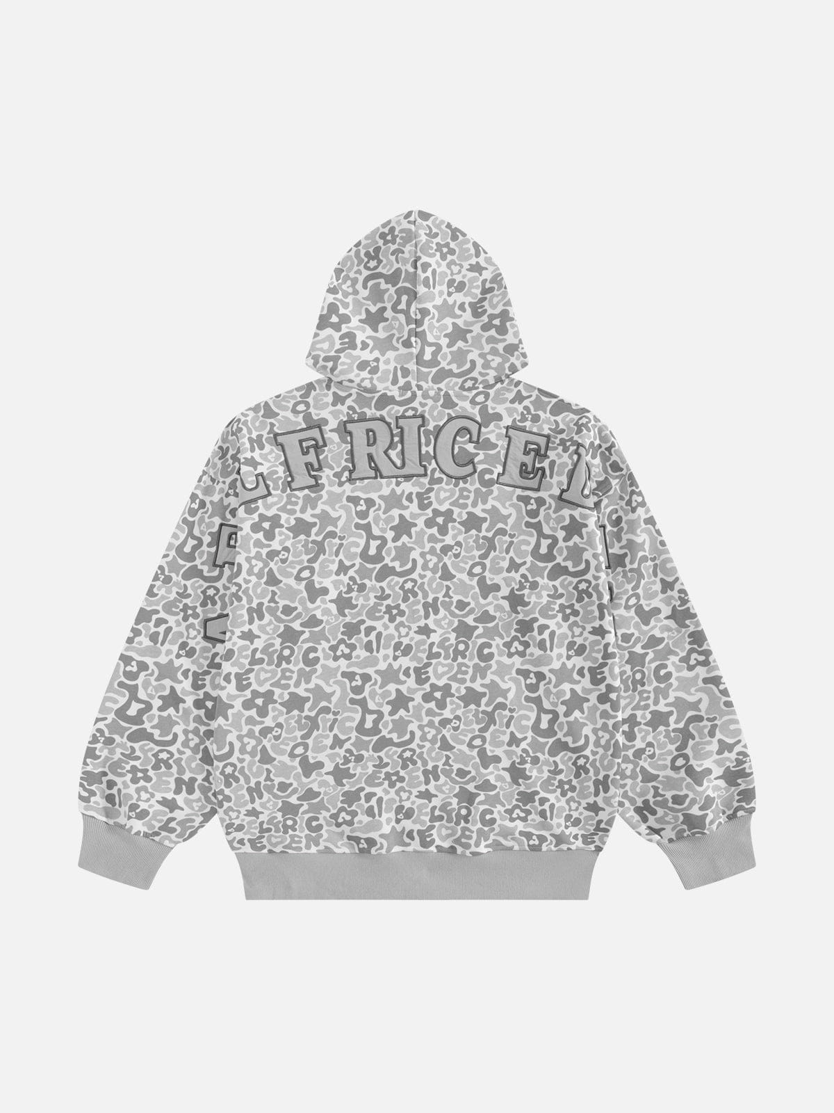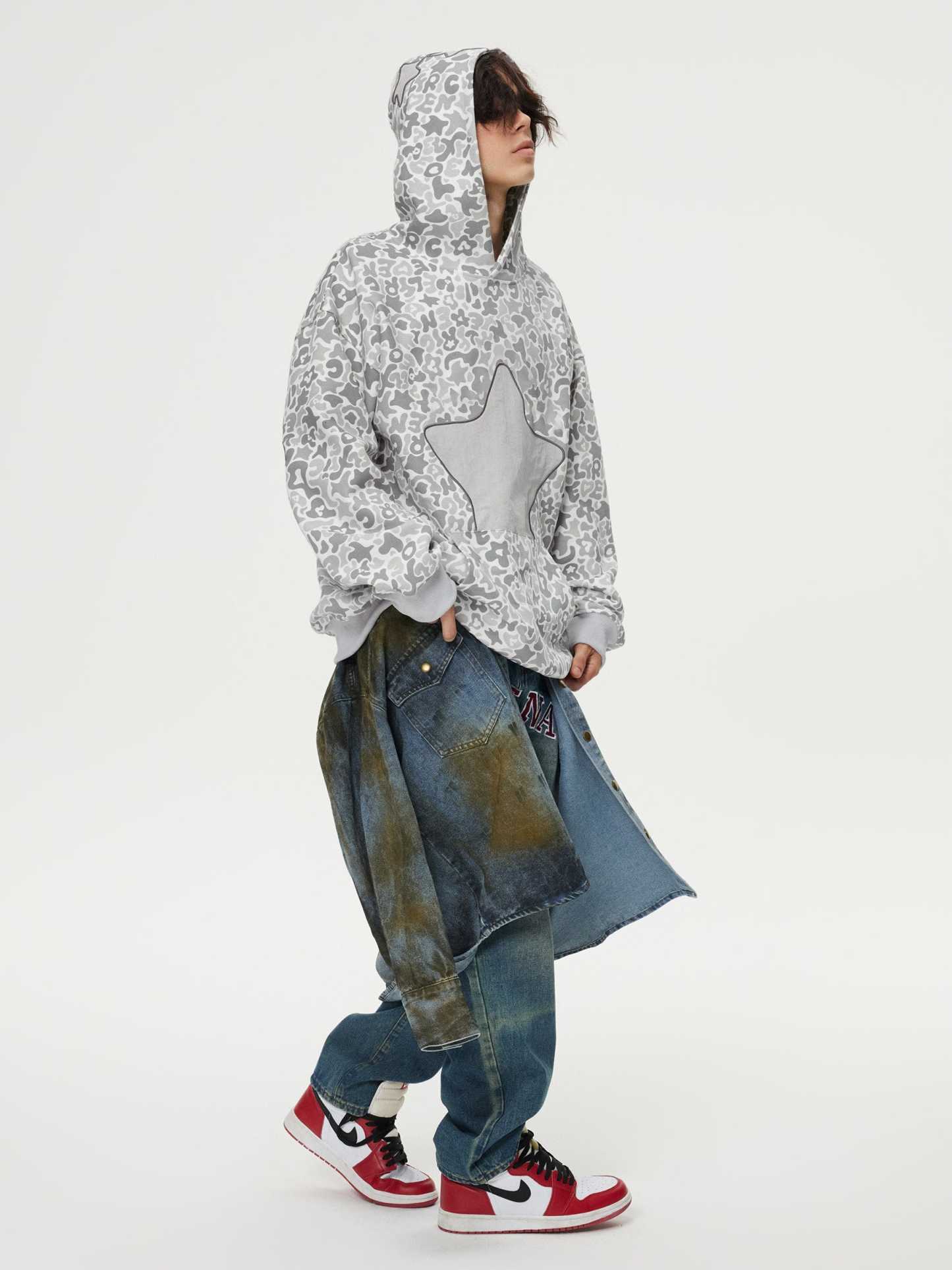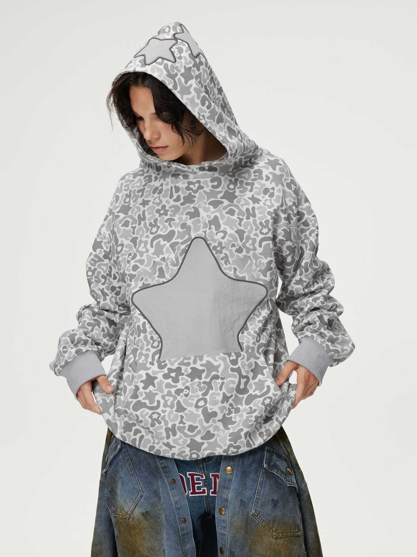 The embroidery star camouflage hoodie blends street style with bold design. Featuring intricate star embroidery over a camo pattern, this hoodie offers a unique, edgy look. Made with soft, durable fabric, it ensures fashion and warmth.