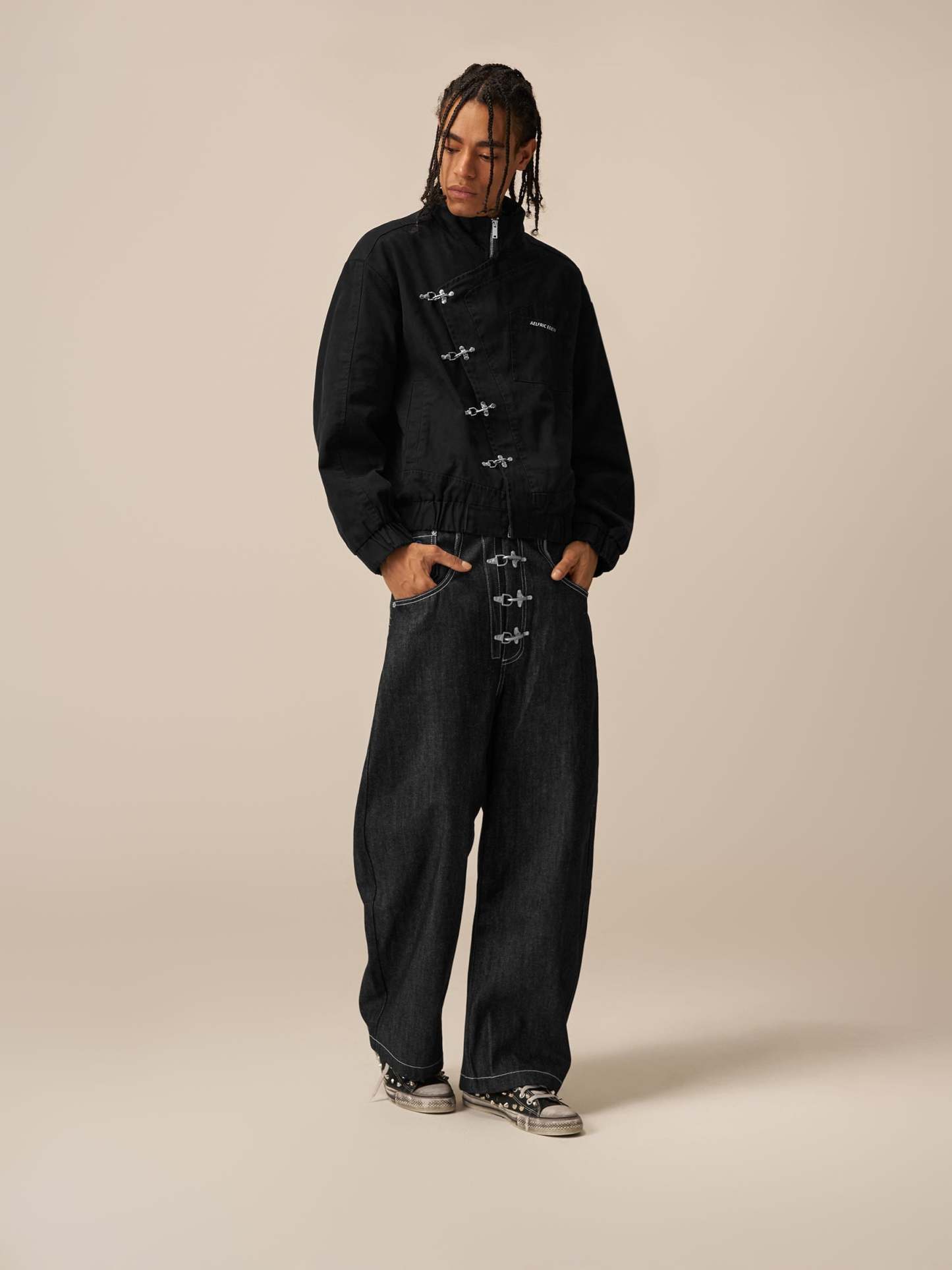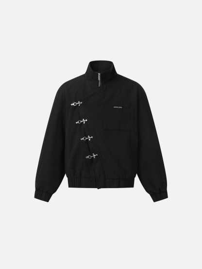 Clothing details: Slant Placket, Metal Button.