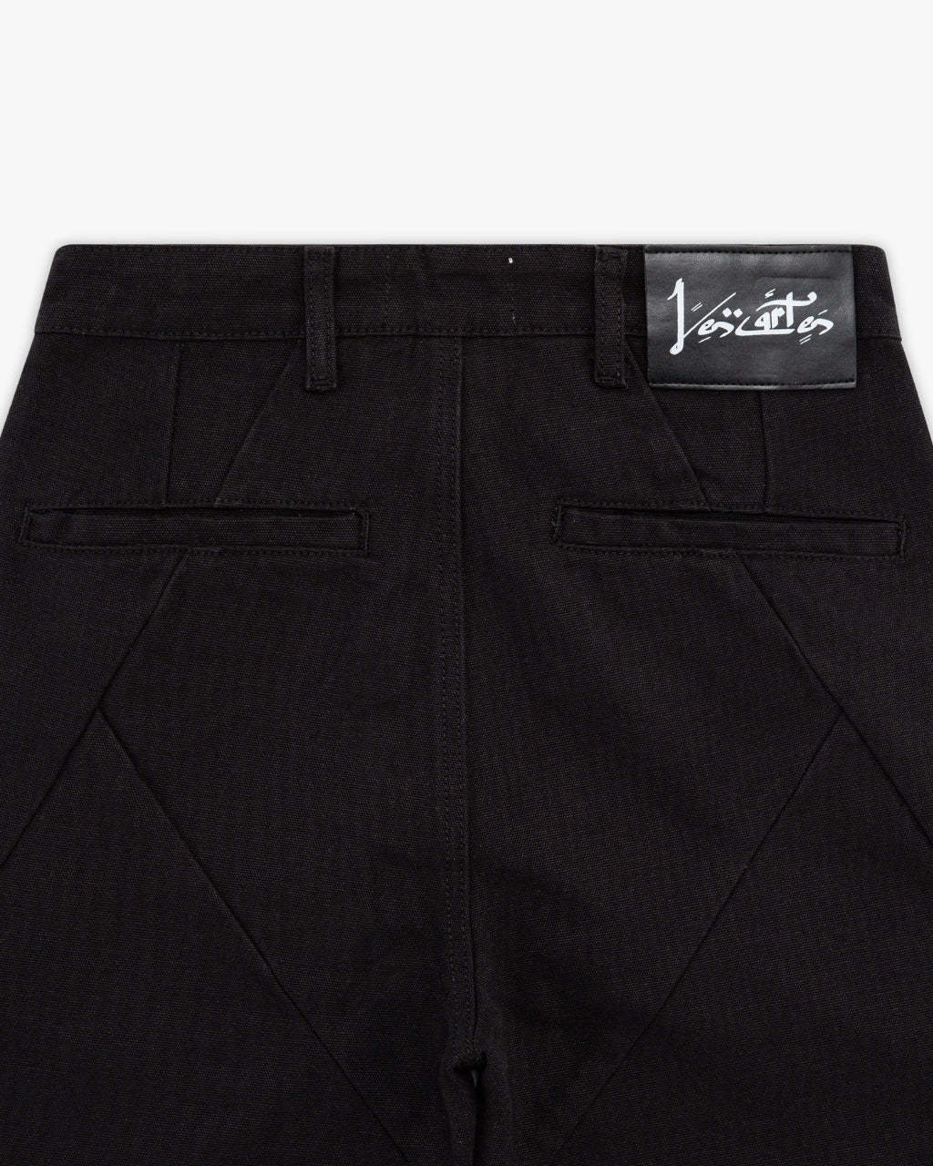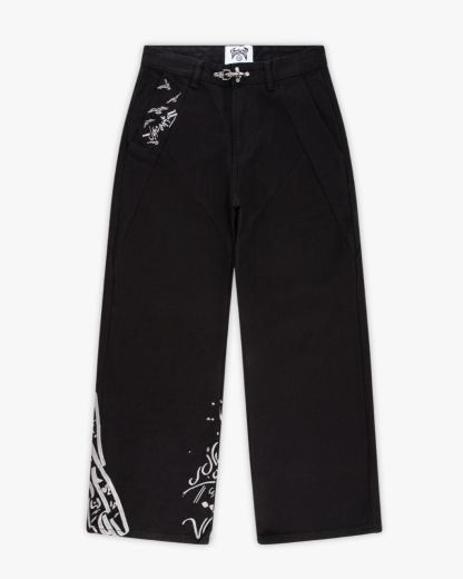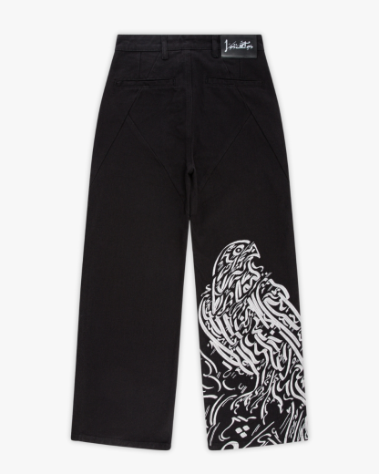 A jet-black canvas silhouette elevated with structured pleats and calligraphic detail. Carries a sweeping eagle motif across the back leg that wraps subtly to the front. A fireman-clasp buckle and tonal construction keep the look sharp, while the embroidery introduces depth and identity.