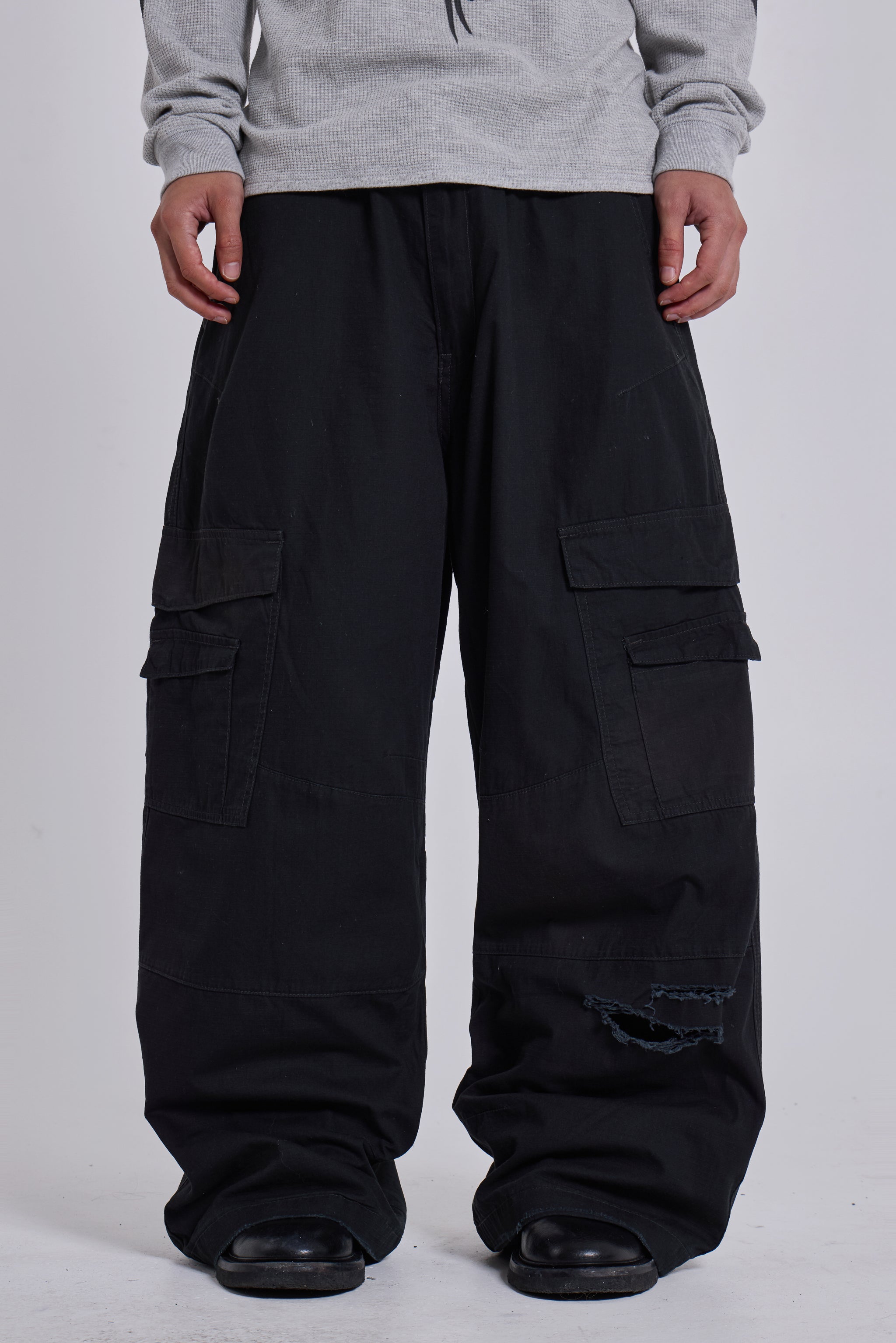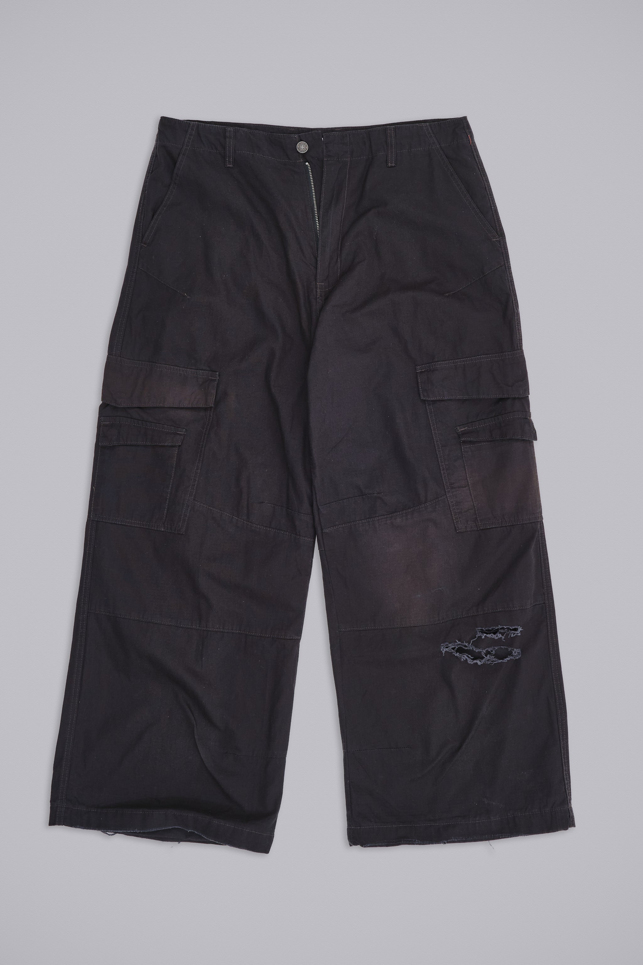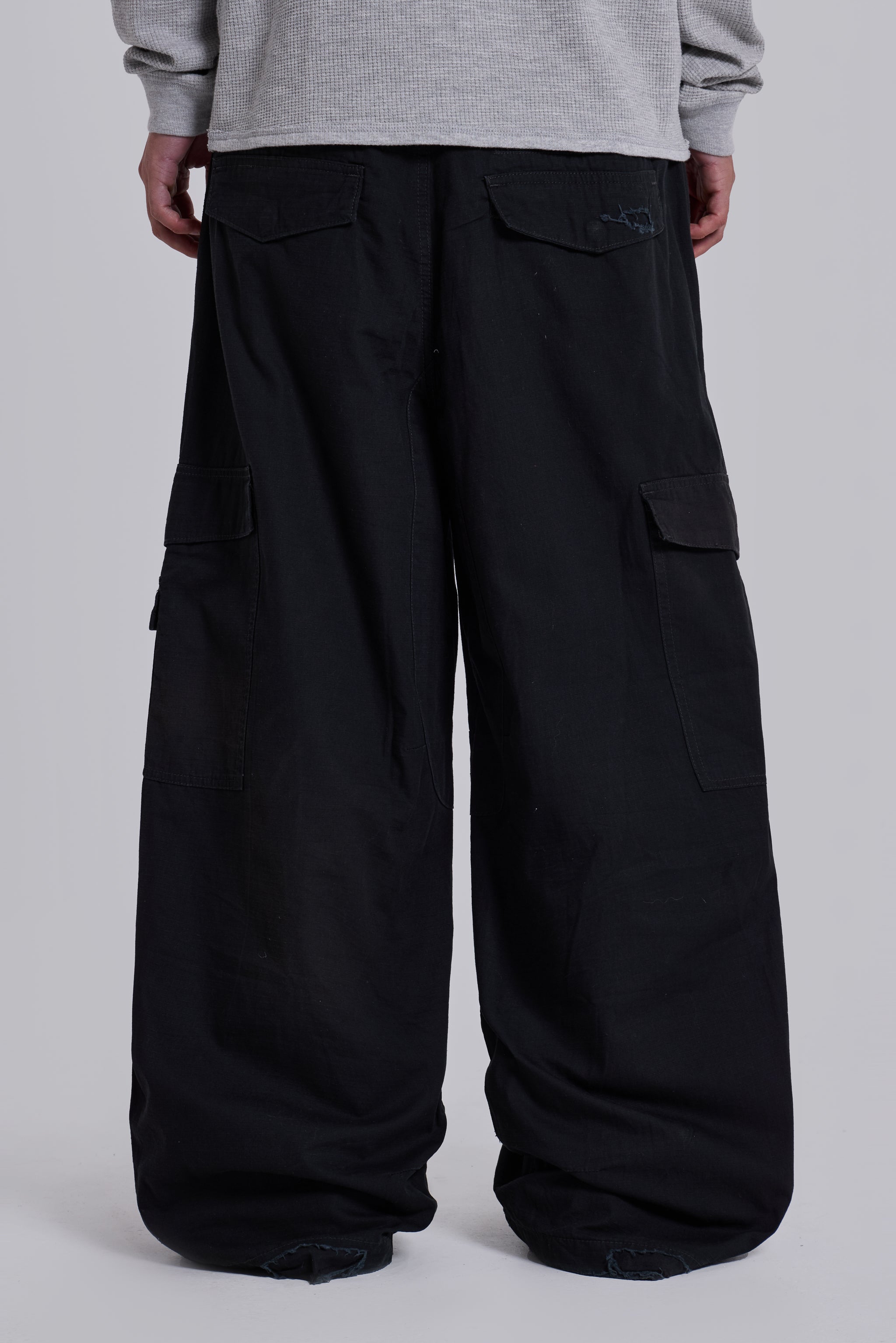 The Black Titan Cargos feature an oversized, low-rise silhouette in cotton fabric with a sunfaded black wash.
