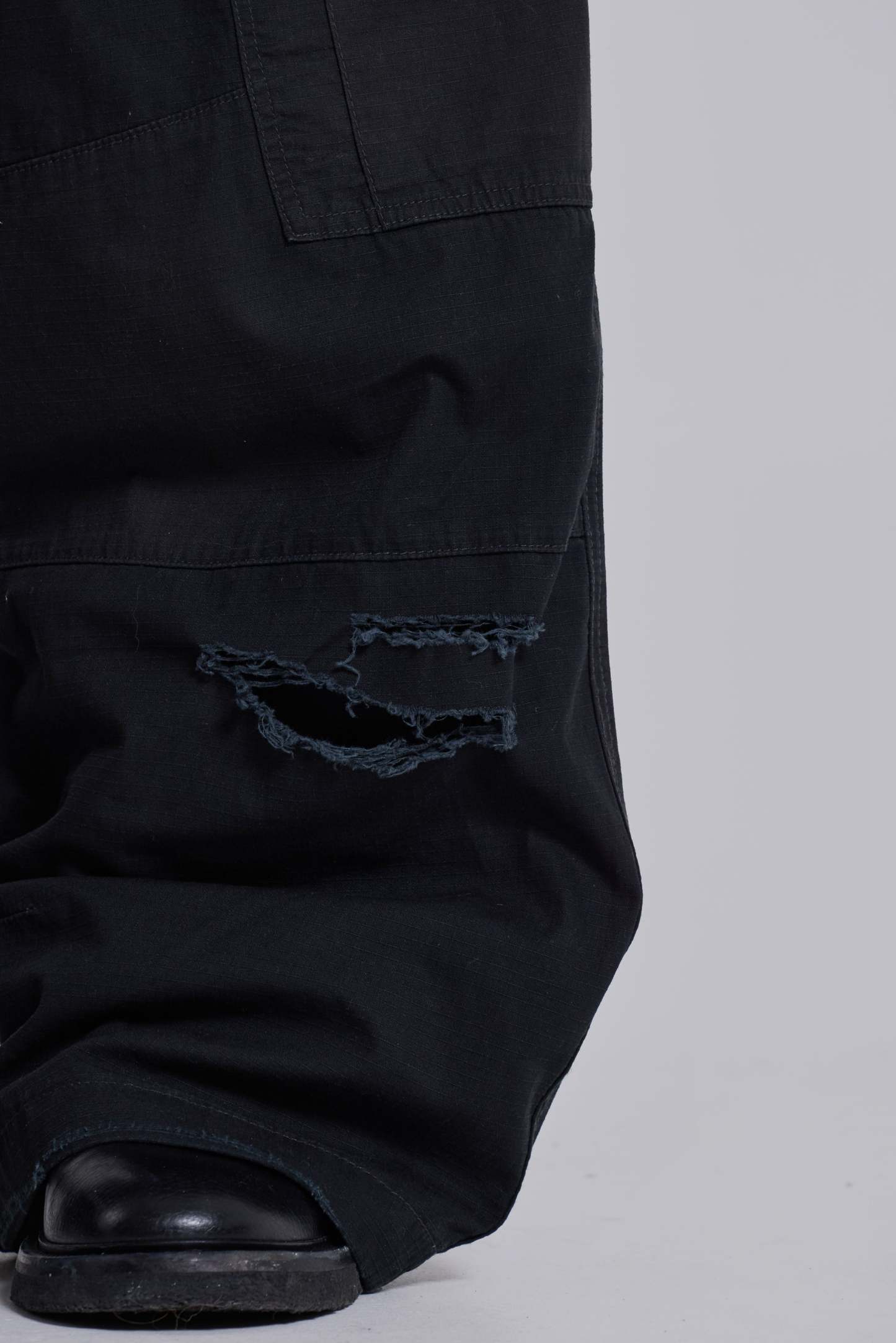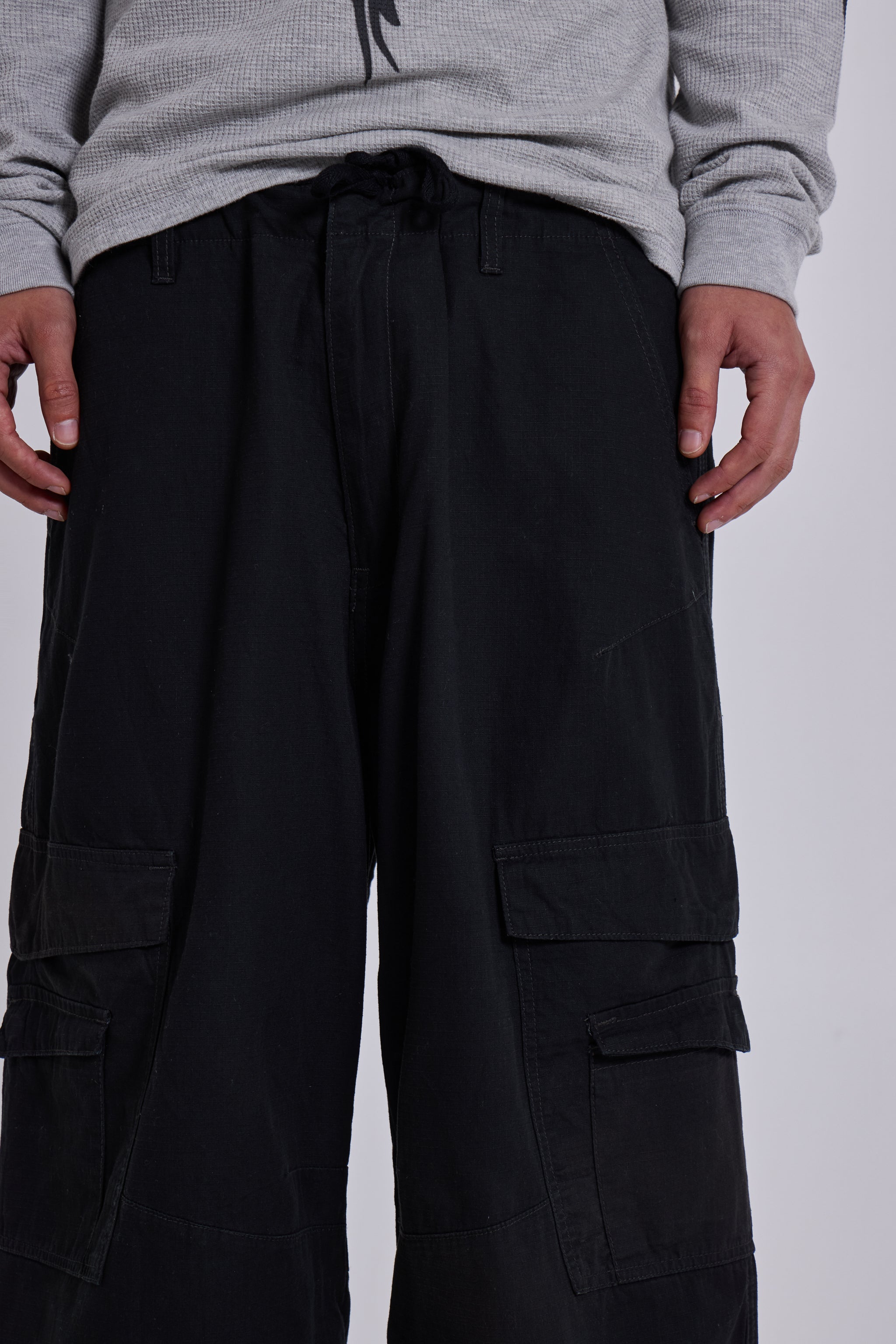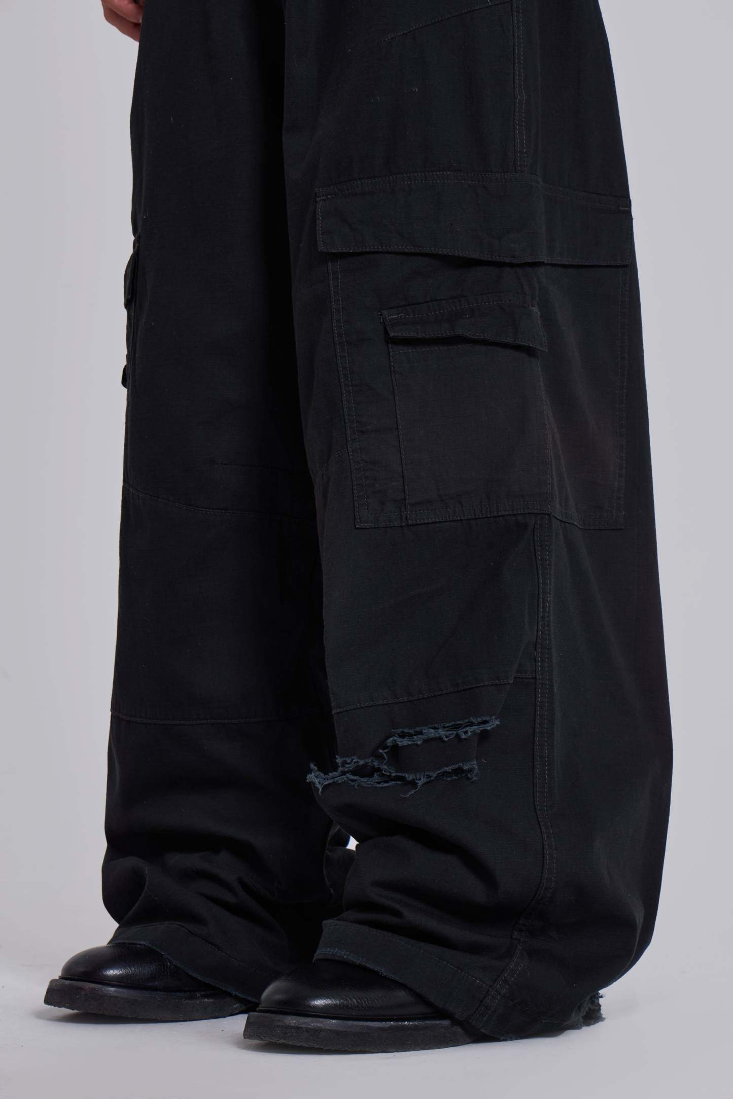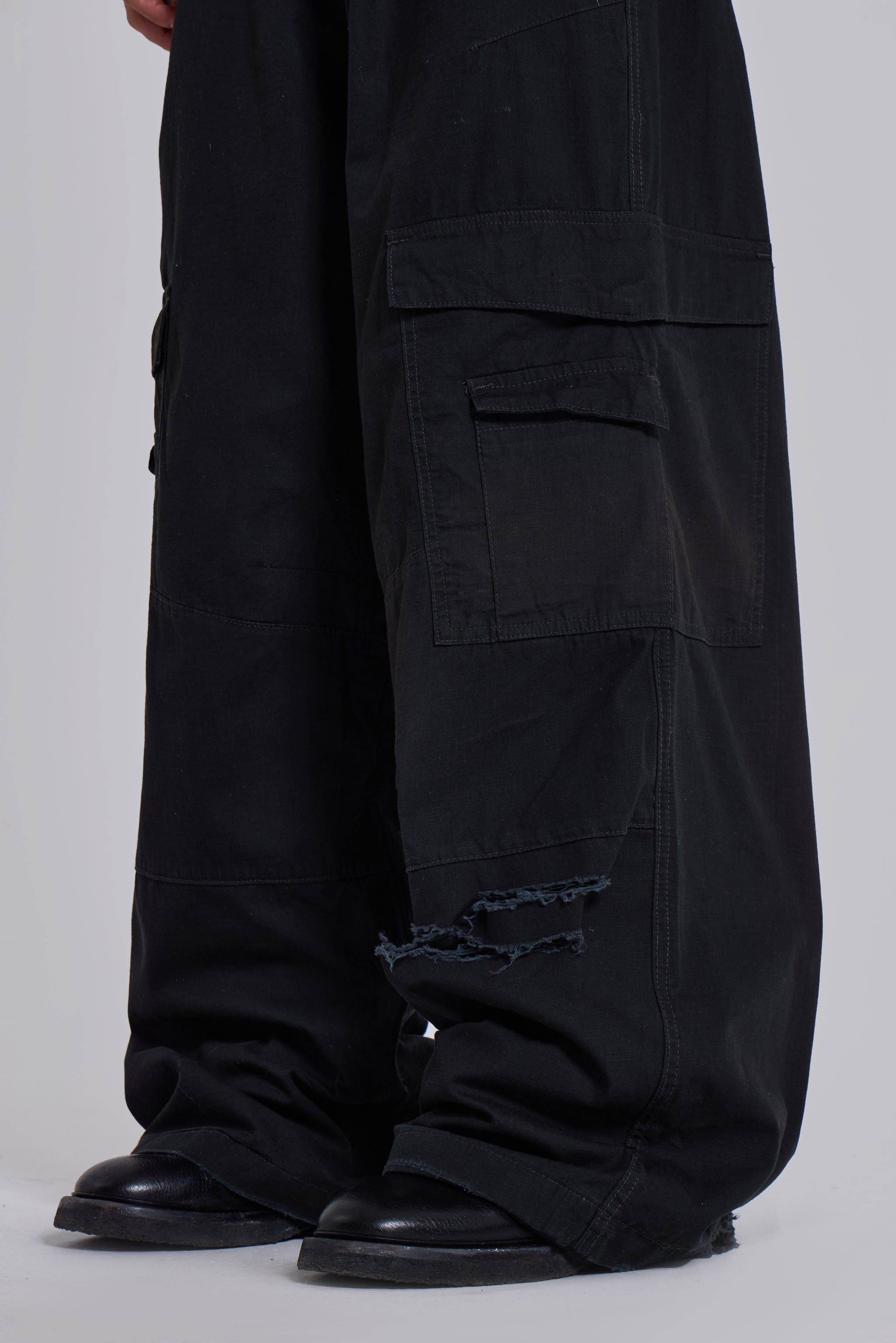 The Black Titan Cargos feature an oversized, low-rise silhouette in cotton fabric with a sunfaded black wash.