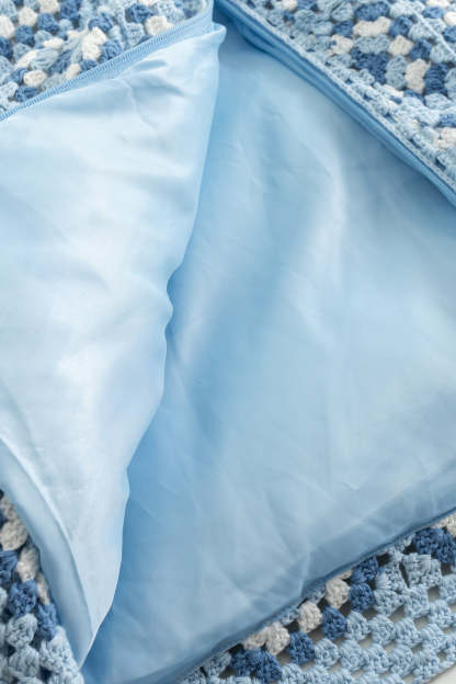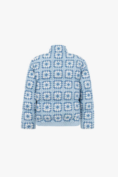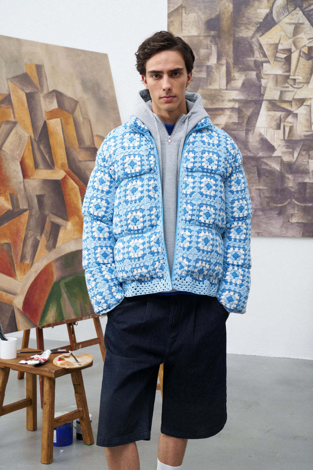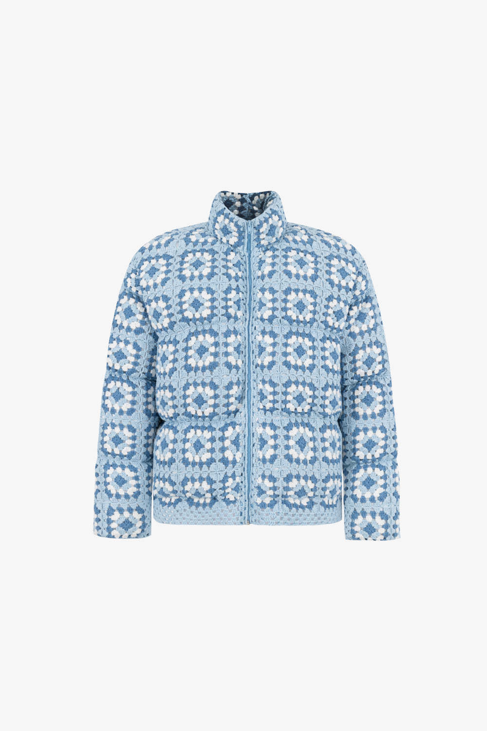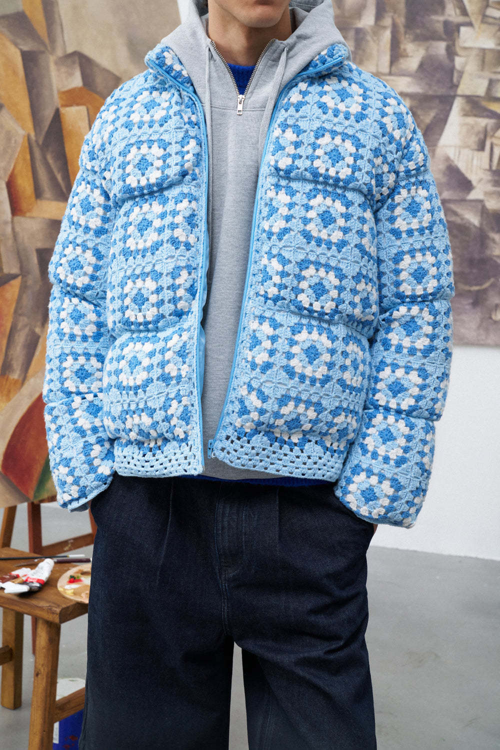 The outer layer is hand-crocheted using classic granny square techniques, creating a bold, textured design. Inside, it’s baffled with soft cotton filling, offering warmth and structure for colder days. A perfect harmony of craftsmanship and functionality.