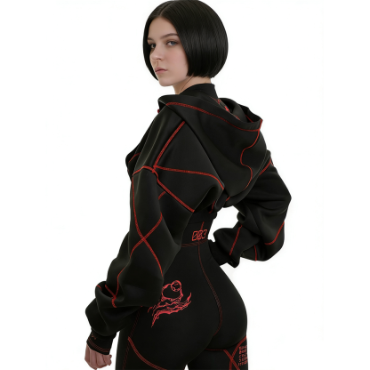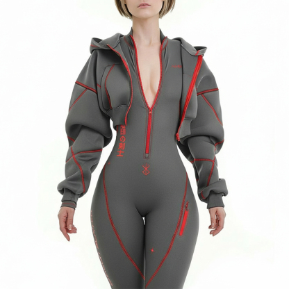 • Design Elements: Bold red accents, hooded design, side pockets with zippers