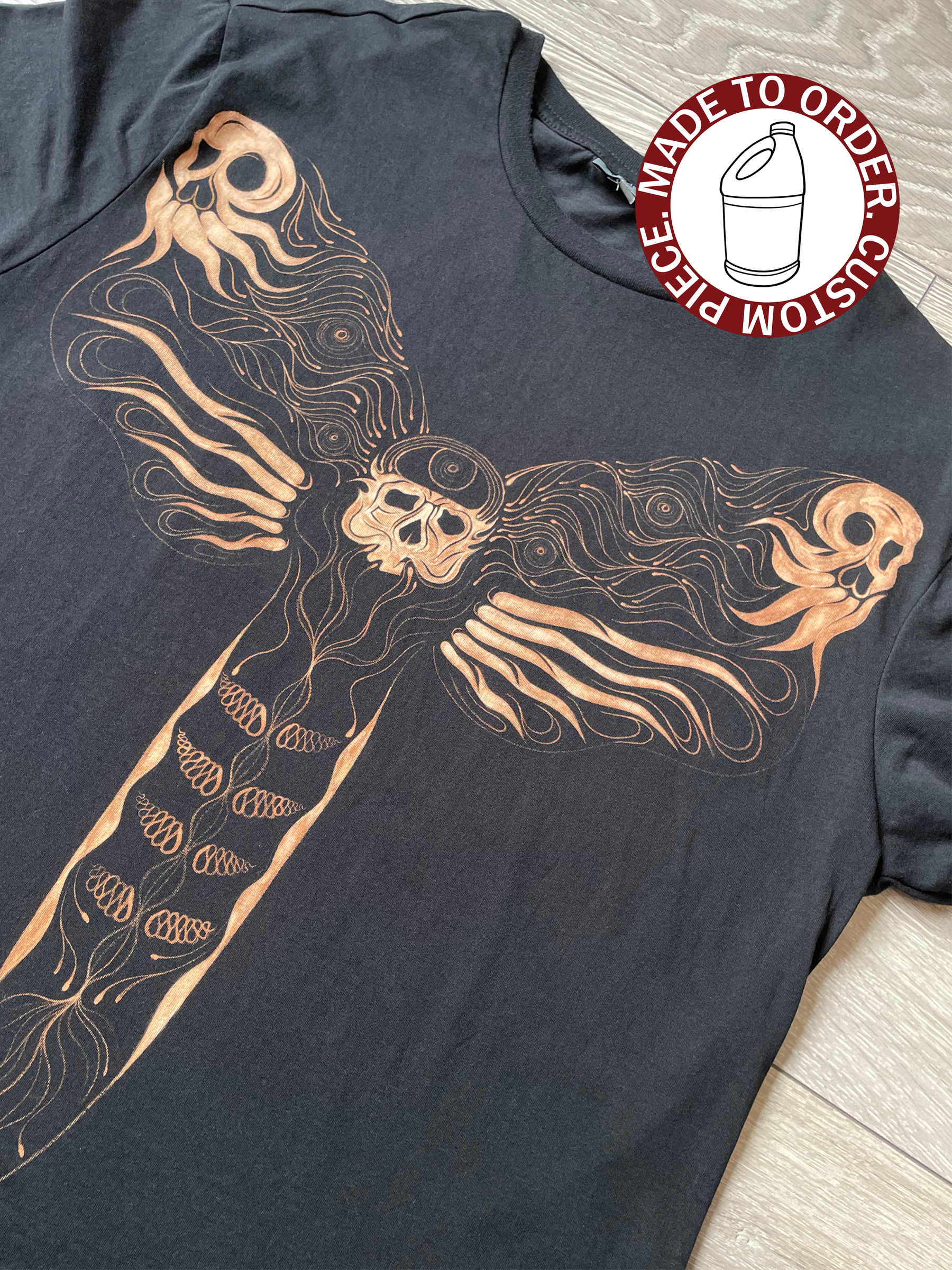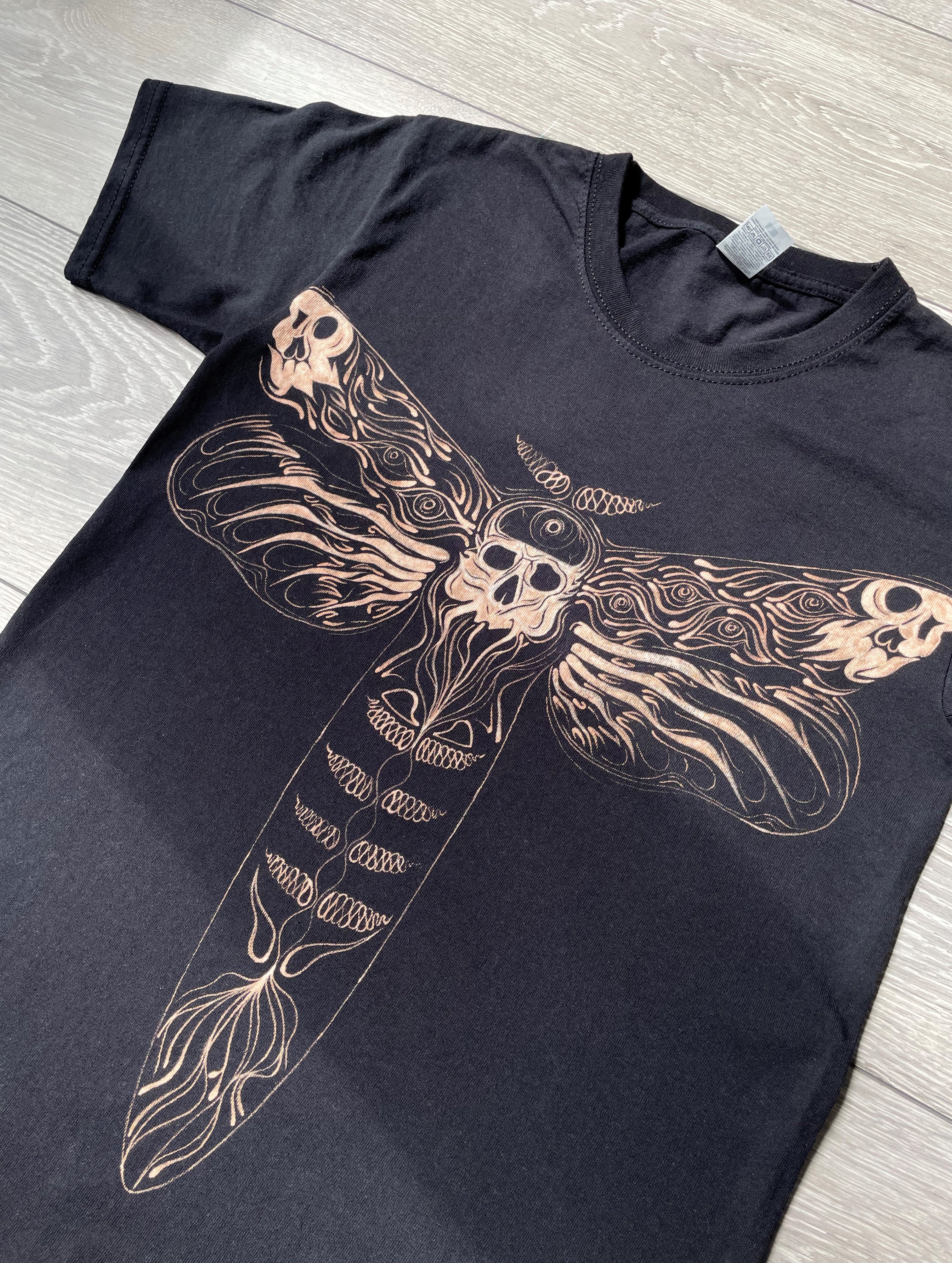 T-shirt painted with bleach. Original death moth design. Also available as a pullover hoodie!