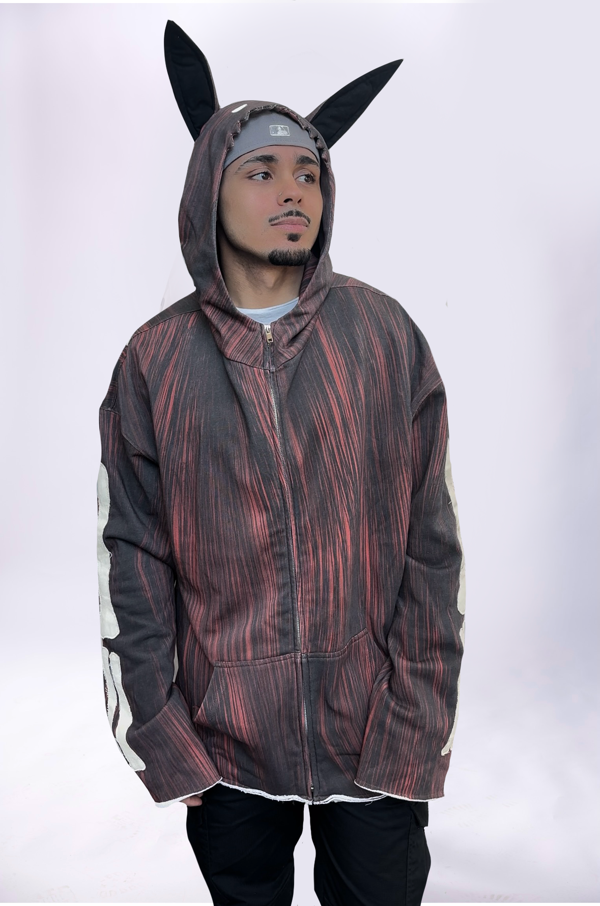 The DemonFox Hoodie is where edgy meets whimsical. With intricate bone stitching and playful fox ears, this hoodie is unlike anything else. Designed with an open, flowing fit thanks to its hem-free design, it offers both comfort and individuality.