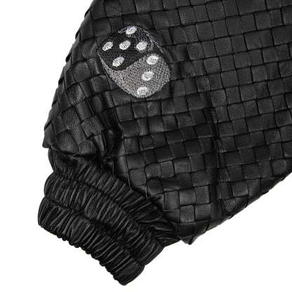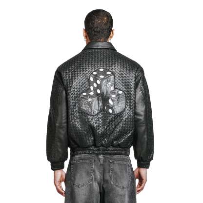 genuine woven leather / embroidered on sleeve / leather appliqué embroideries on front and back / with YKK zipper / fits true to size