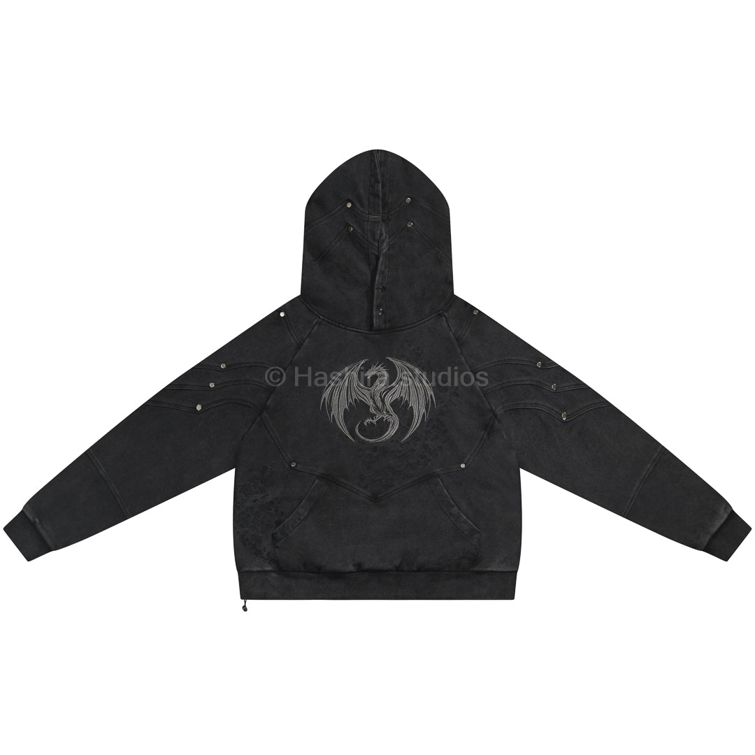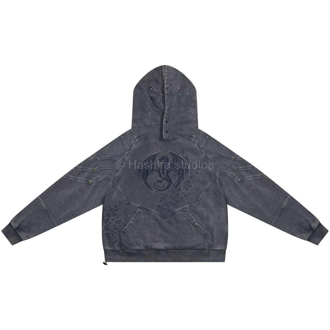 - Constructed sleeve, body and hood armored inspired paneling + metal rivet hardware.