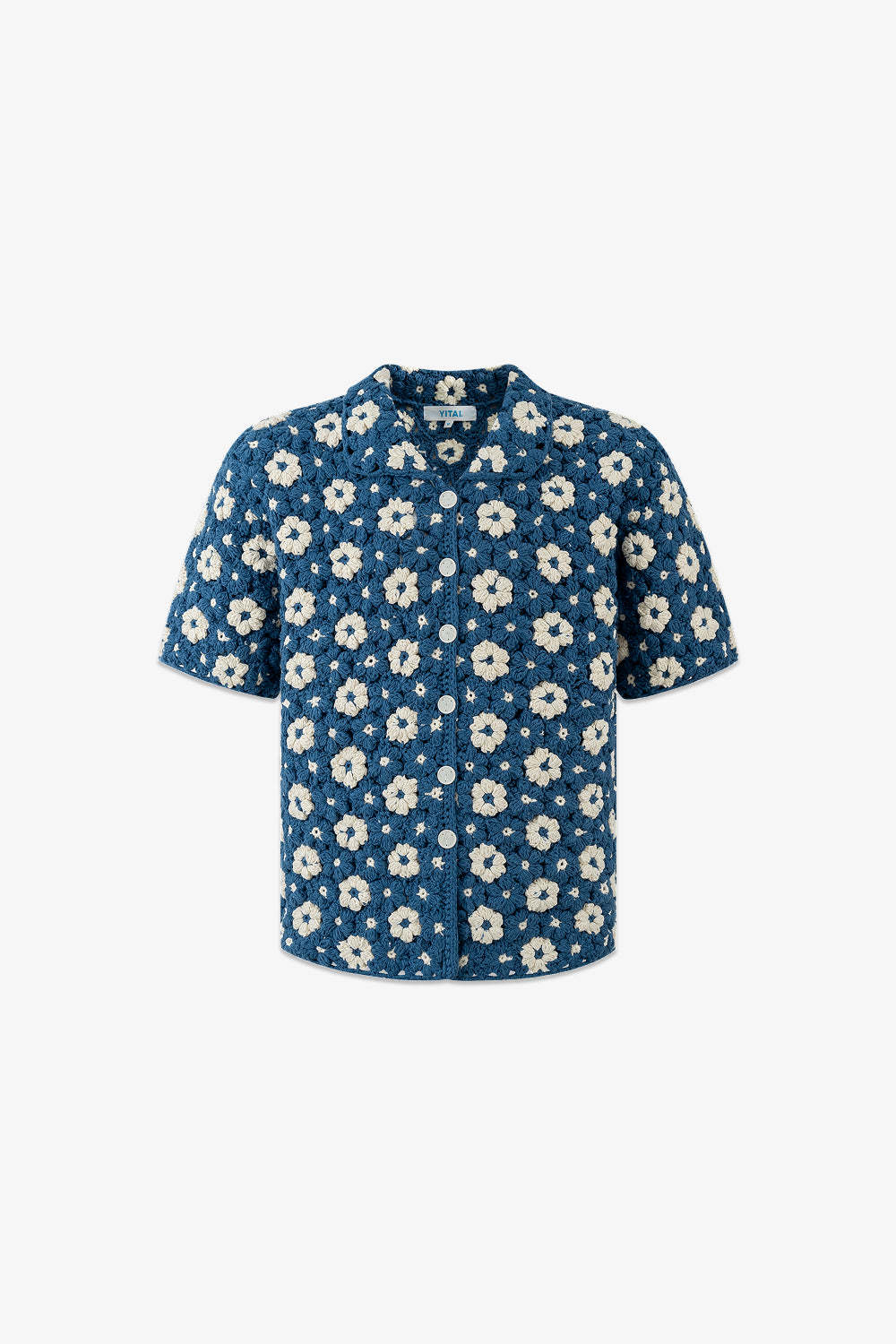 A labor of love that began last year, this shirt is entirely hand-crocheted and assembled by artisans using over 200 individually crafted floral motifs. Each flower is slightly unique, making every piece subtly one-of-a-kind.
