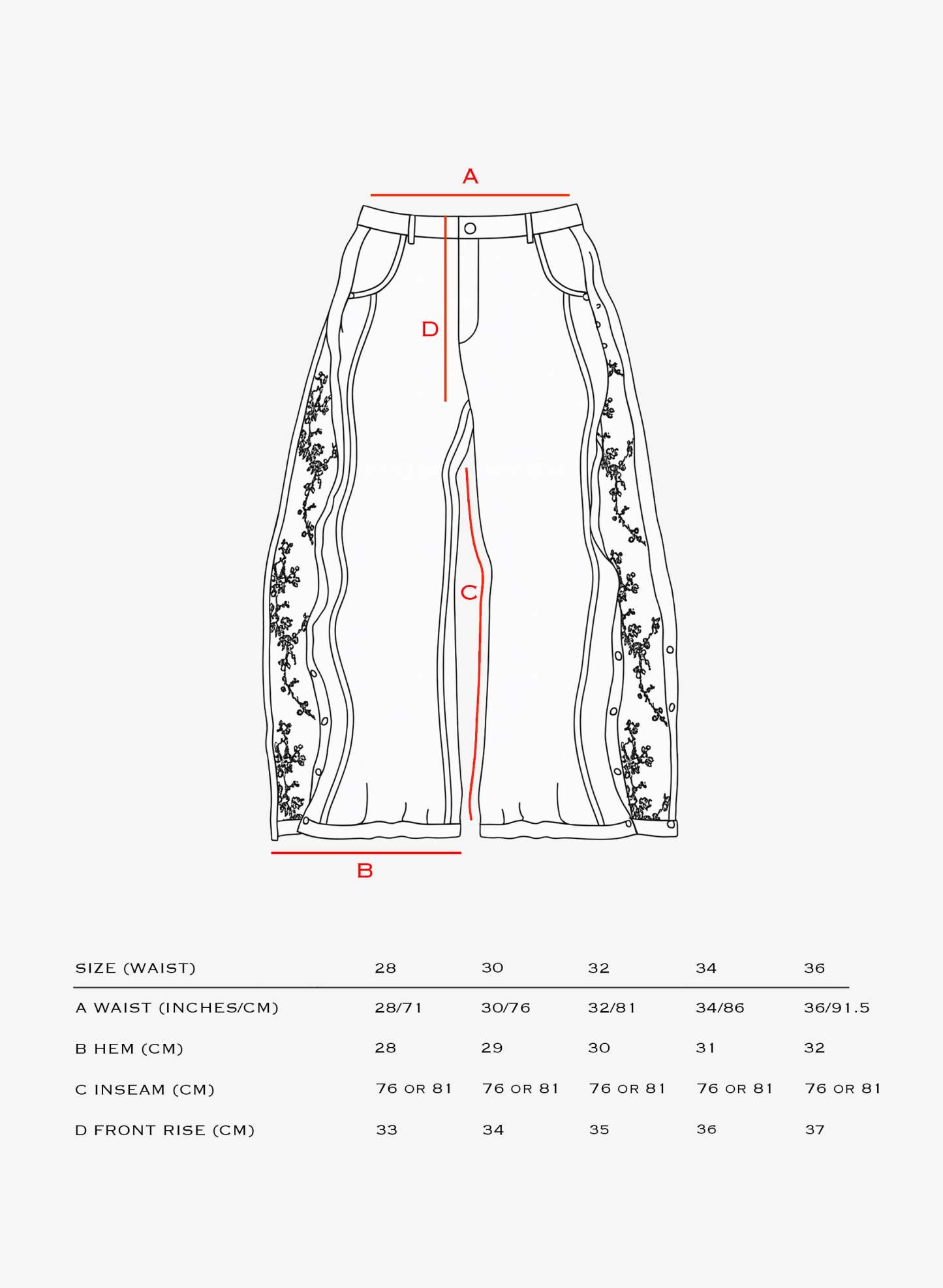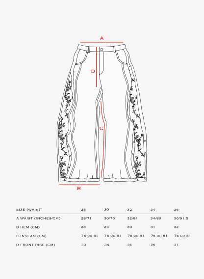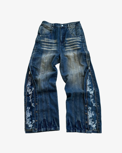 These jeans feature a hidden embroidered floral detail that can be revealed with a side zipper, along with front seam accents and metal stud detailing at the ankle.