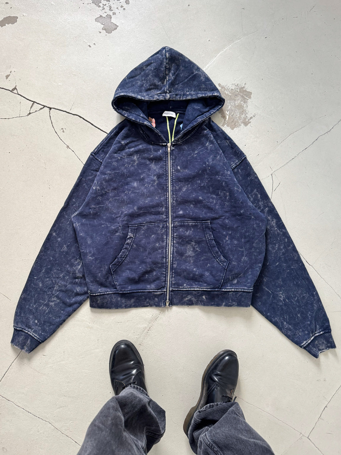 Note: Each hoodie has a unique, irregular wash pattern. Light spots can vary in intensity and position.