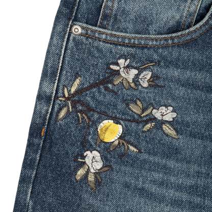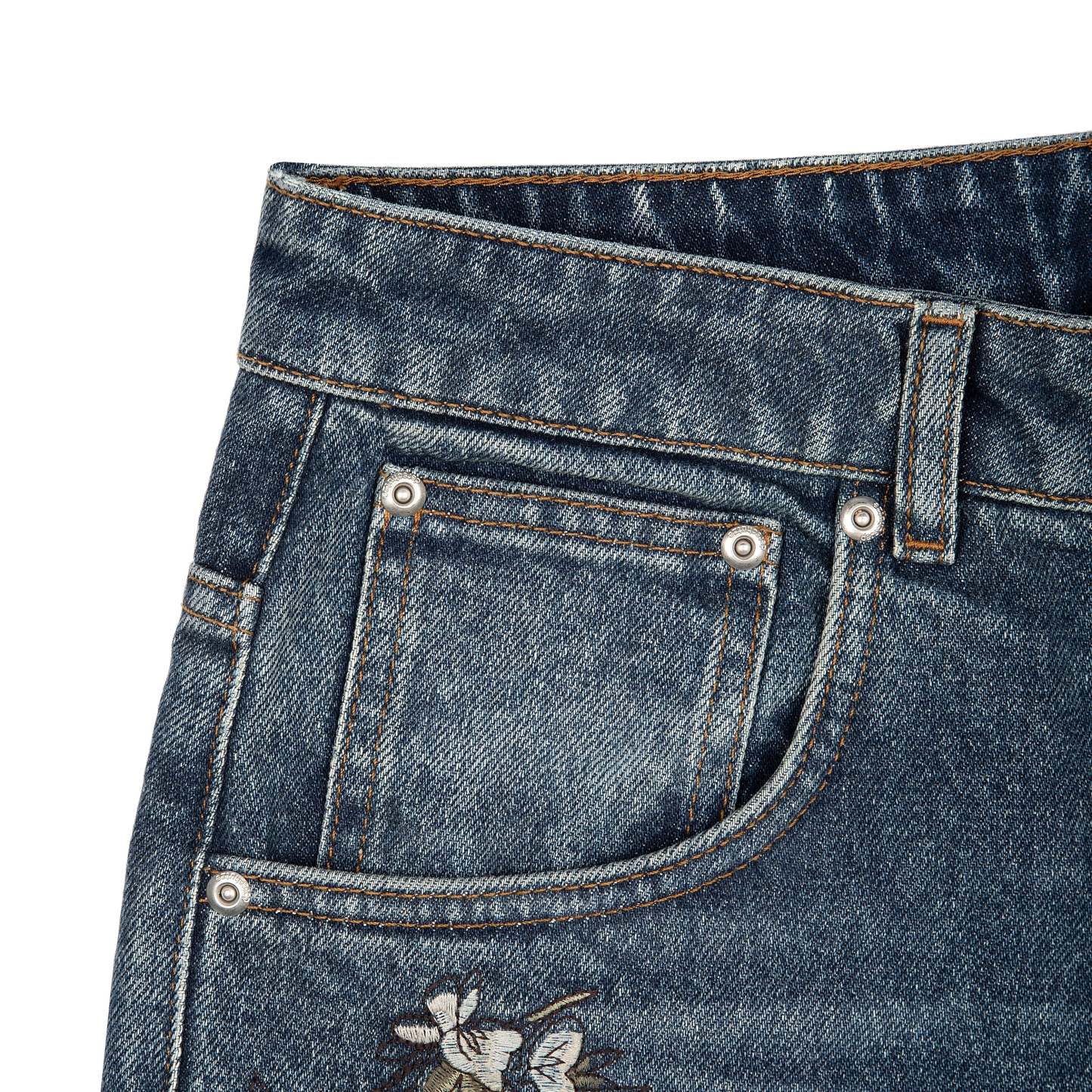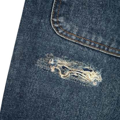 14,5oz denim / 100% cotton / embroidery on front and back / effect washing / distressing on front and back / custom button / baggy fit / fits true to size