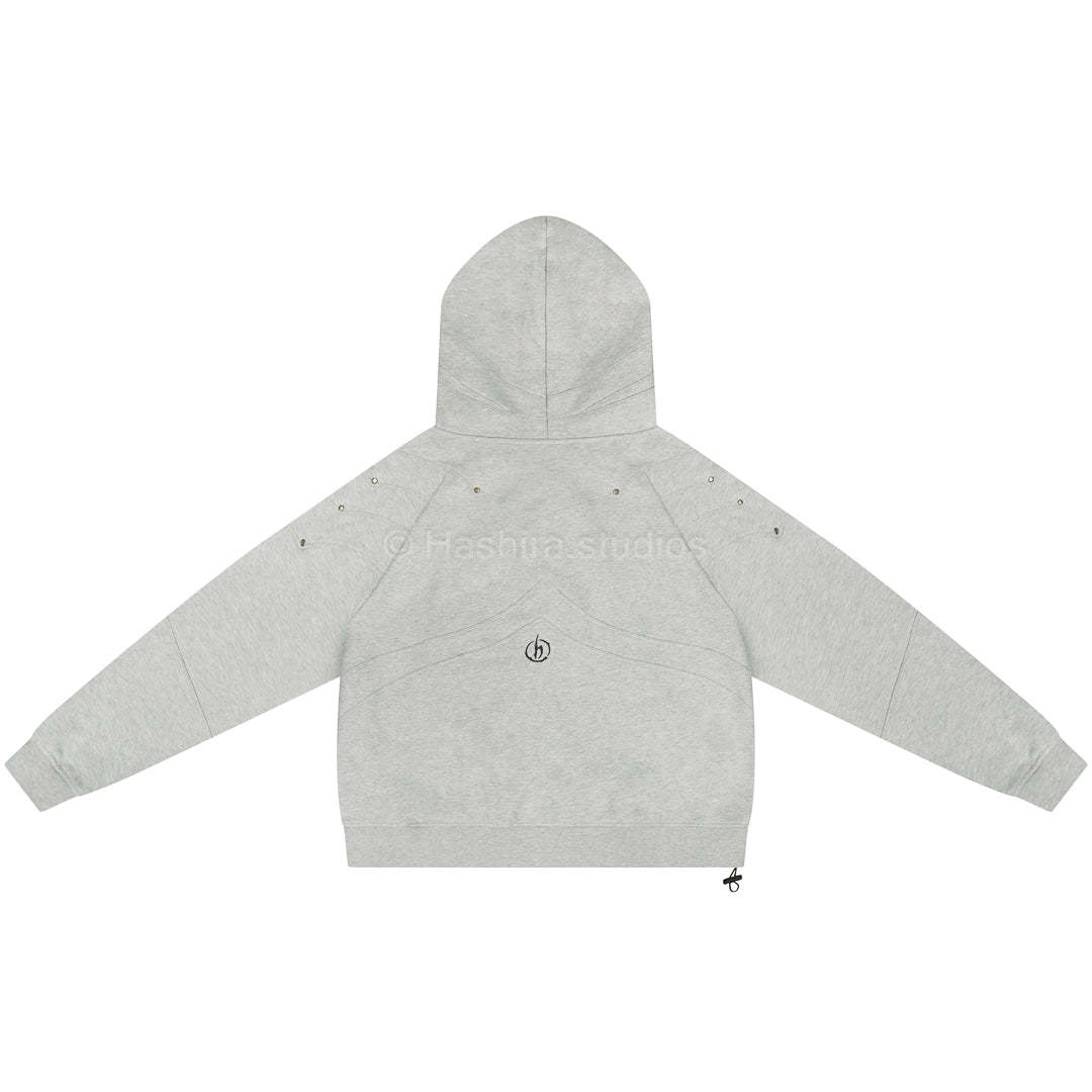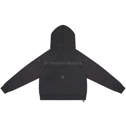 - Constructed sleeve and body armored inspired paneling + metal rivet hardware.