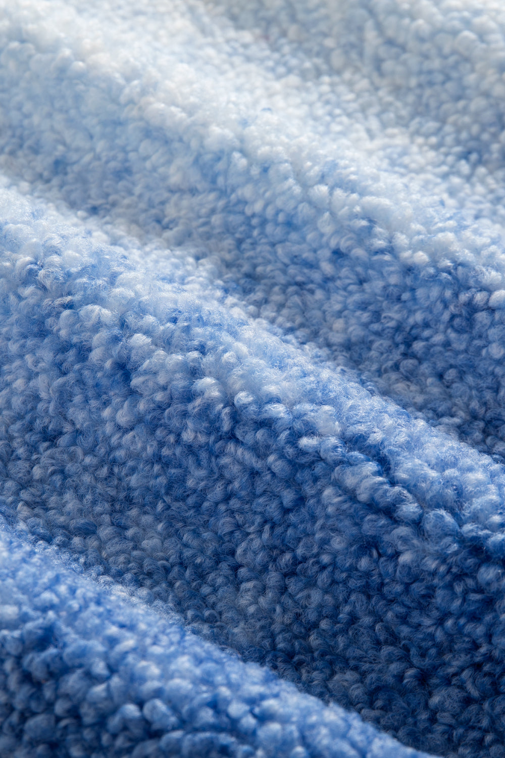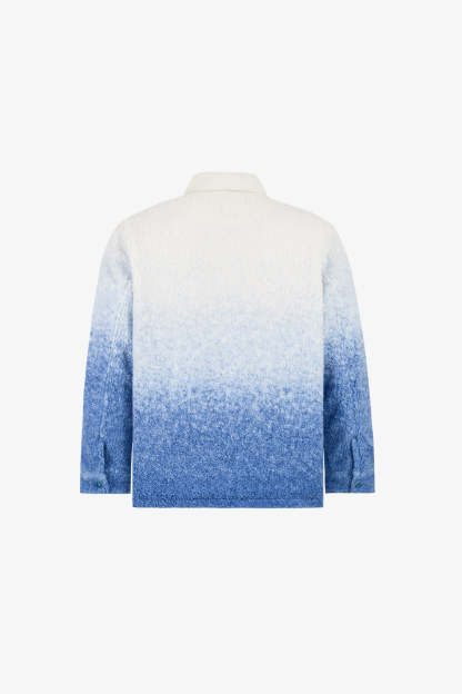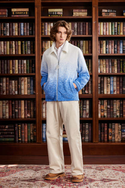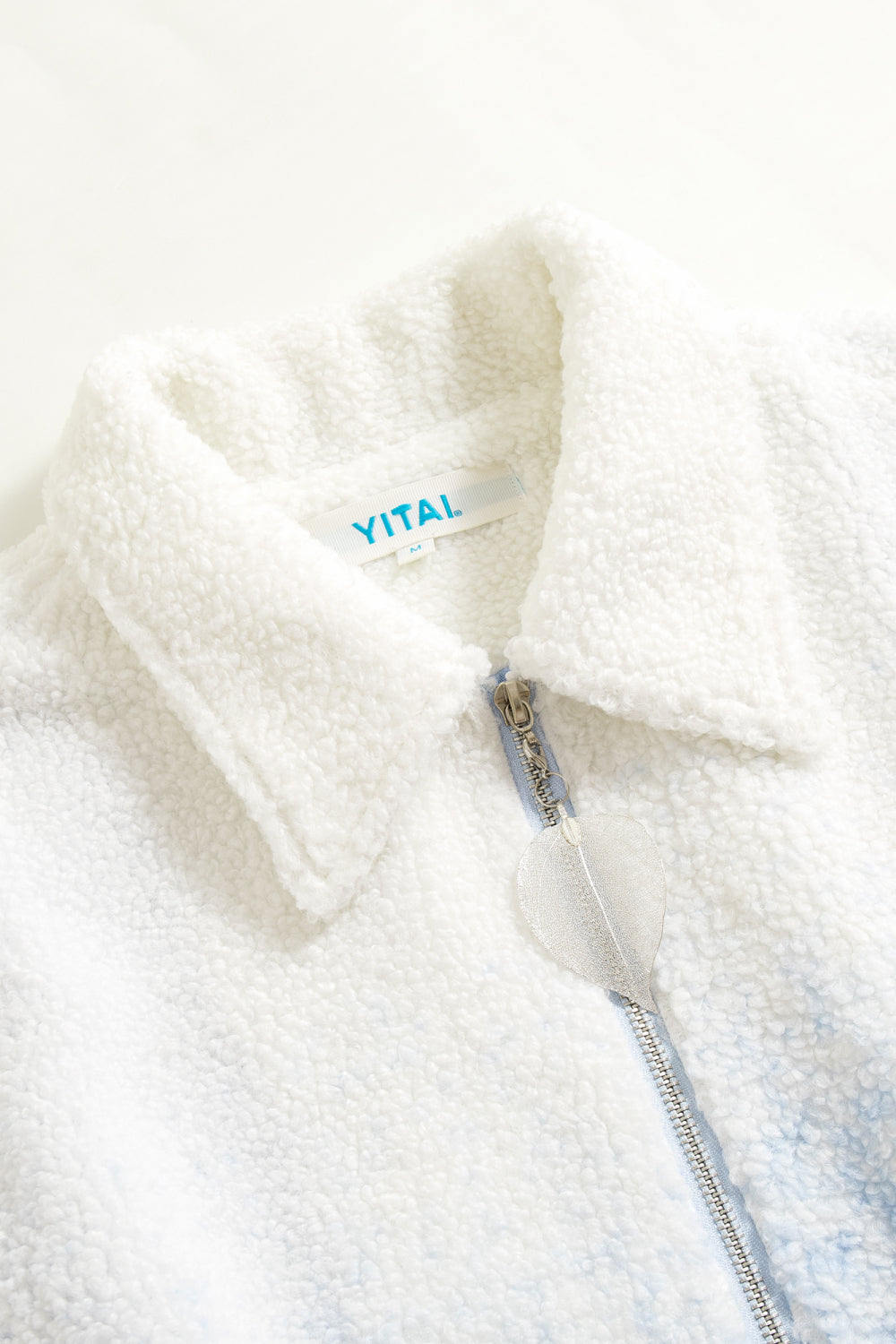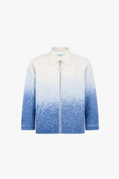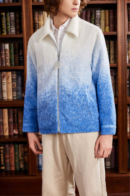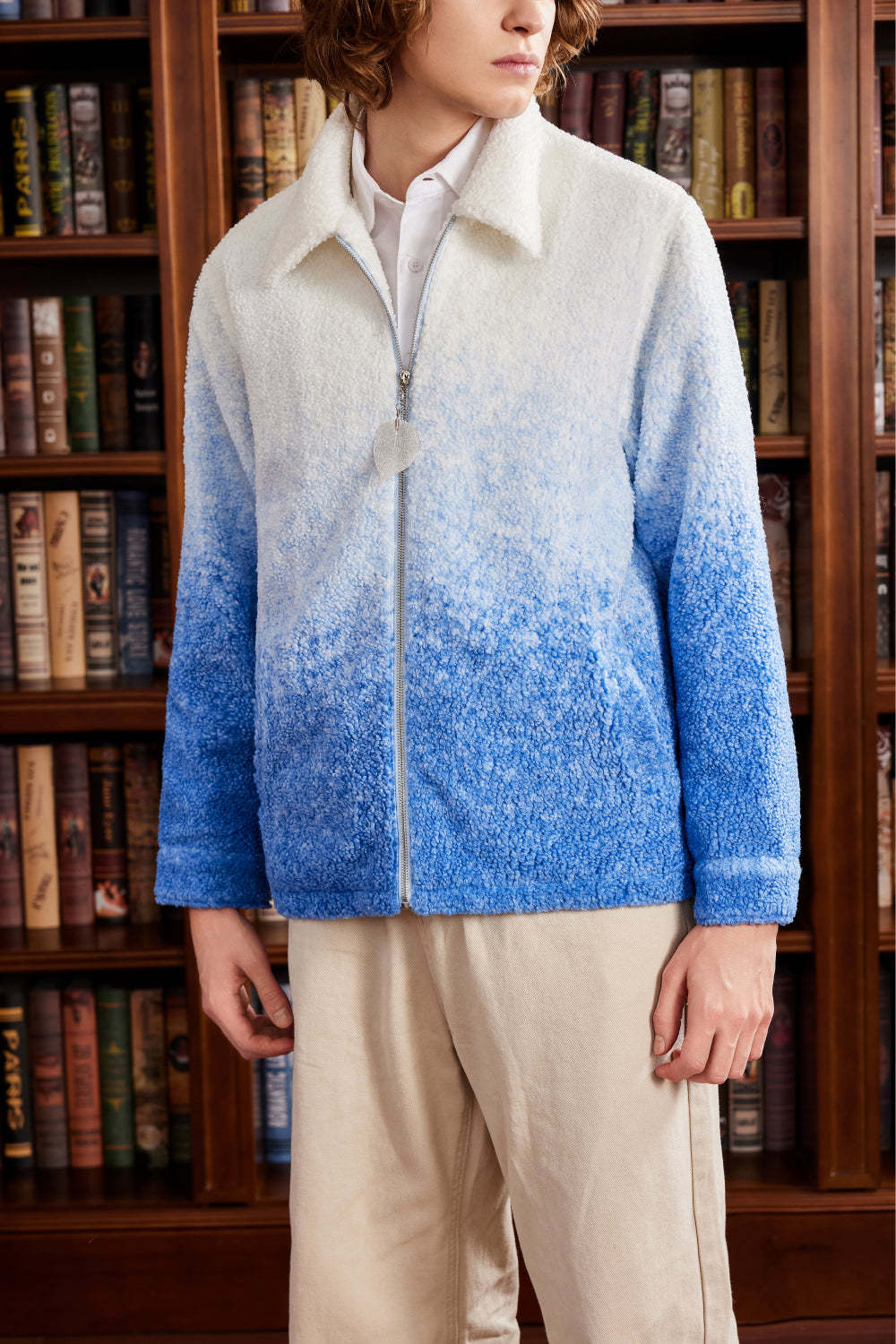 Inspired by the tranquility of snowy mountain peaks, this jacket features a stunning gradient that fades from pure white to deep mountain blue. Reflecting the serene beauty of winter landscapes, it’s equipped with a custom leaf zipper—a unique touch that celebrates the spirit of the season.