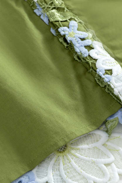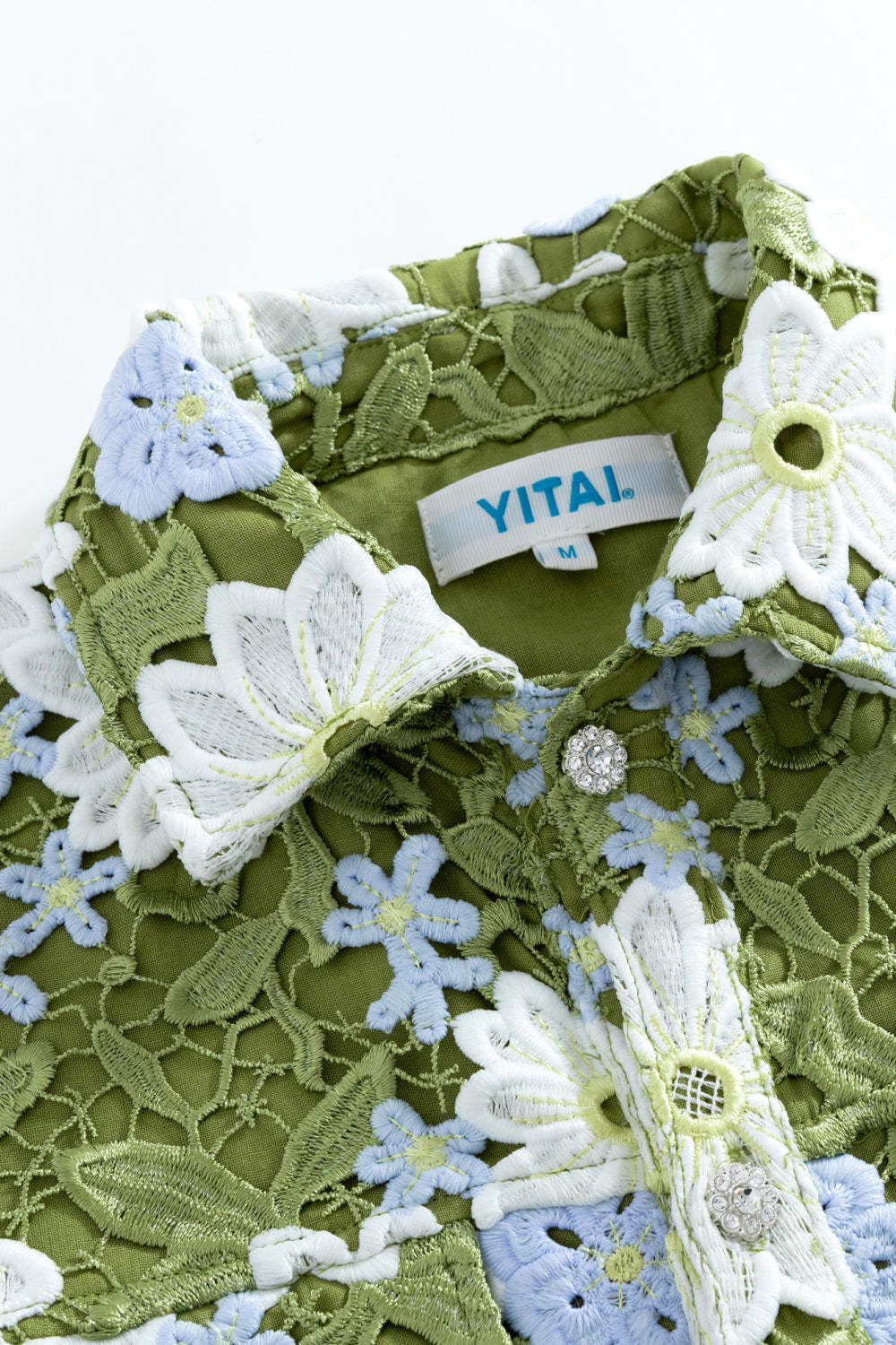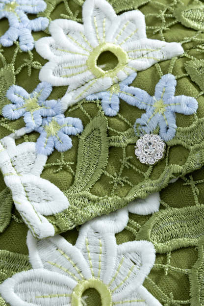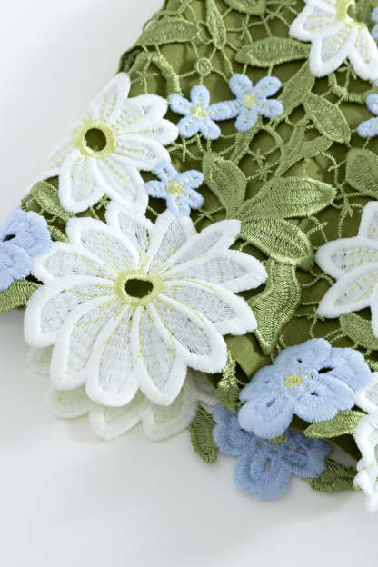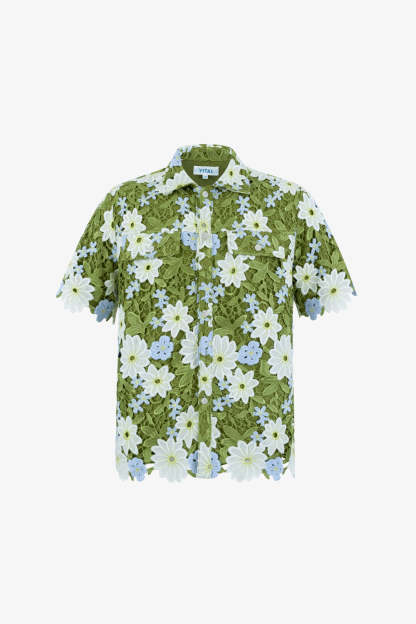 This piece is the result of nearly three months of meticulous design and sampling. Embracing nature's elegance, guipure embroidery lace fabric intricately weaves flowers, leaves, and branches to evoke a sense of movement and blossoming. Perfect for summer adventures, its vibrant ivory and blue hues contrast beautifully against lush greens, symbolizing the transition of growth from spring to summer. To further embody the fluidity and flow of nature’s bloom, along every hem is the natural, raw edge of each floral motif. Gemstone buttons catch and reflect light beautifully while creating contrast against the shirt. Made with cotton linen lining, it ensures a soft, breathable experience for the summer season's warmth. Pair with the matching to complete the set.