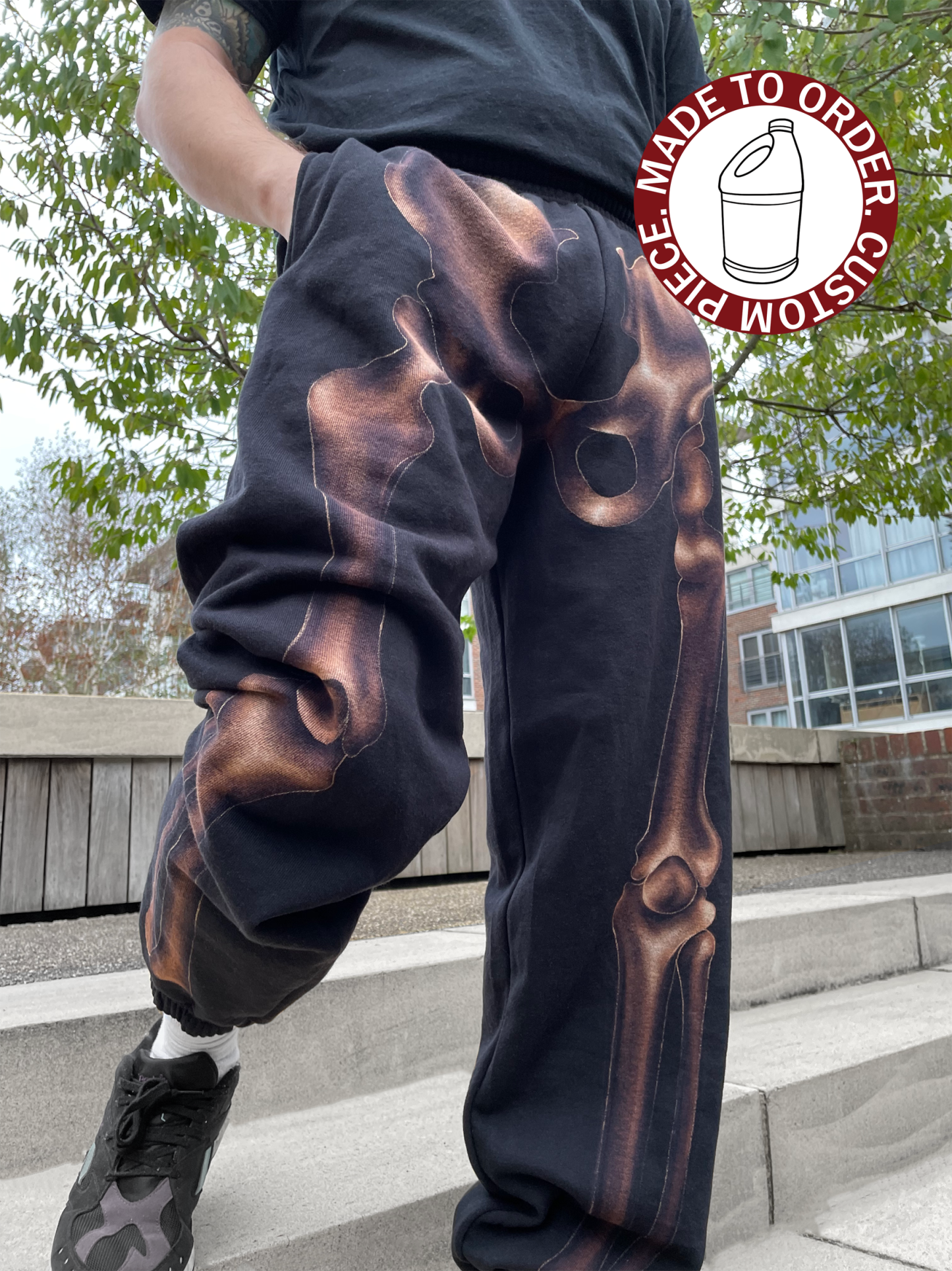 Custom joggers painted with bleach. Skeleton design painted by me.