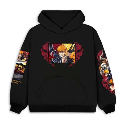 Immerse yourself in the world of Soul Reapers with this premium Bleach anime hoodie. Crafted from high-quality fabric, this black hoodie features iconic imagery from the beloved series, perfect for dedicated fans and casual enthusiasts alike. The comfortable fit and durable construction make it ideal for everyday wear, whether you're heading out or relaxing at home. Express your passion for Bleach with a piece that combines style, comfort, and authentic anime fandom. A must-have addition to any anime wardrobe.