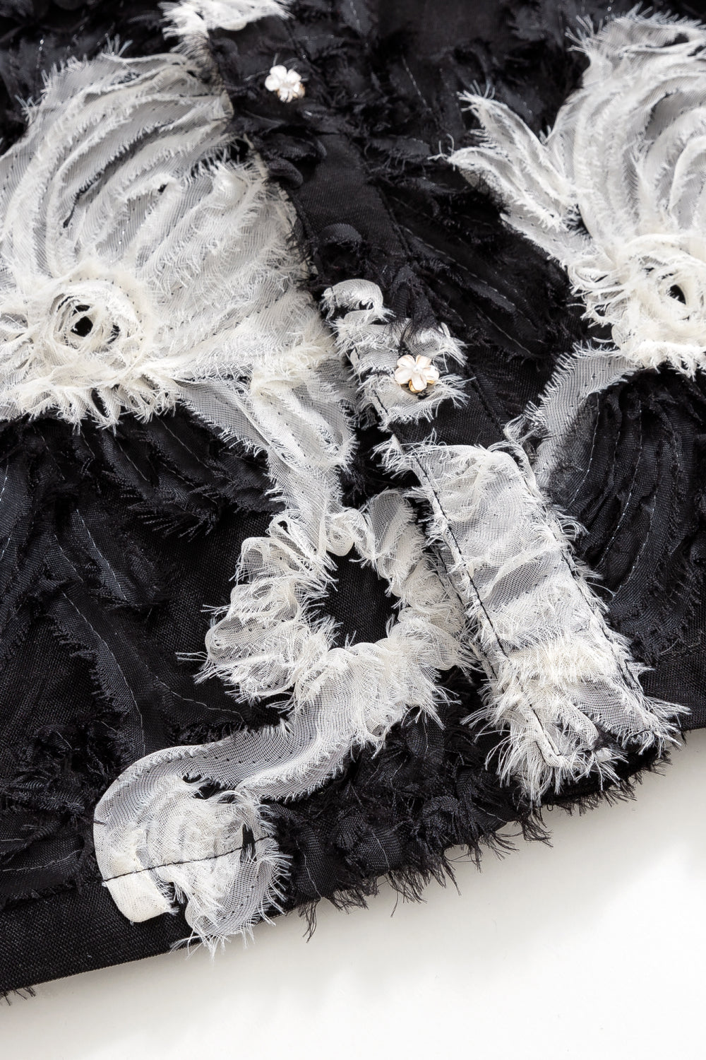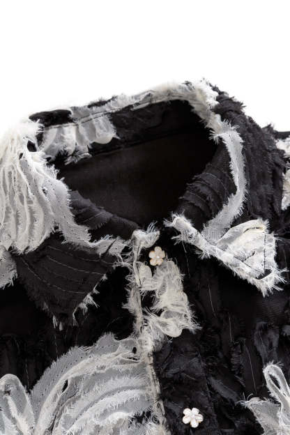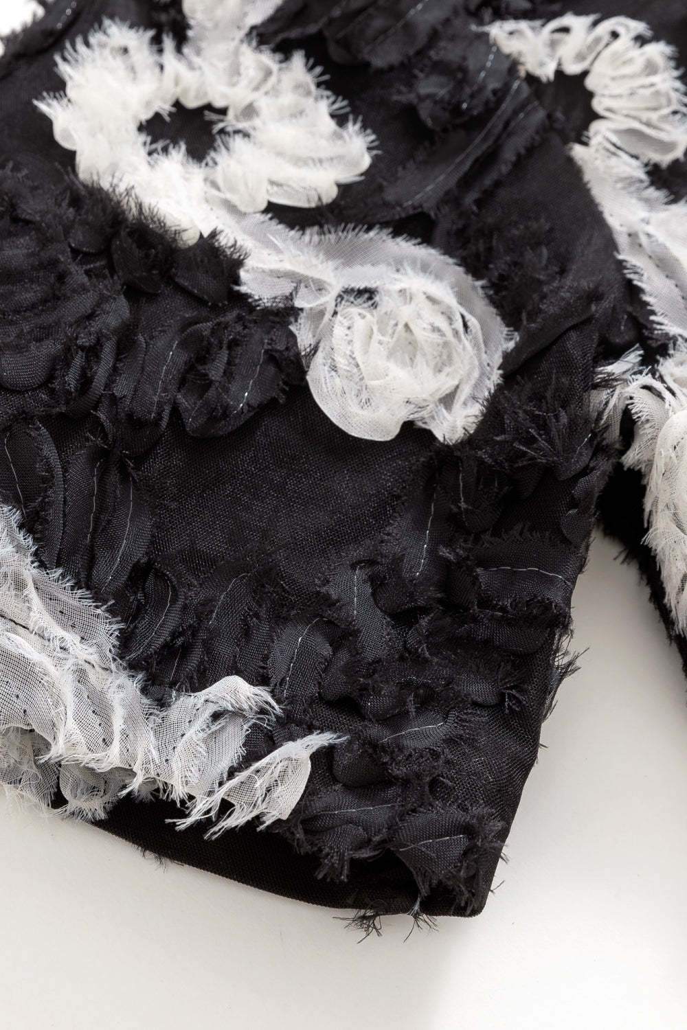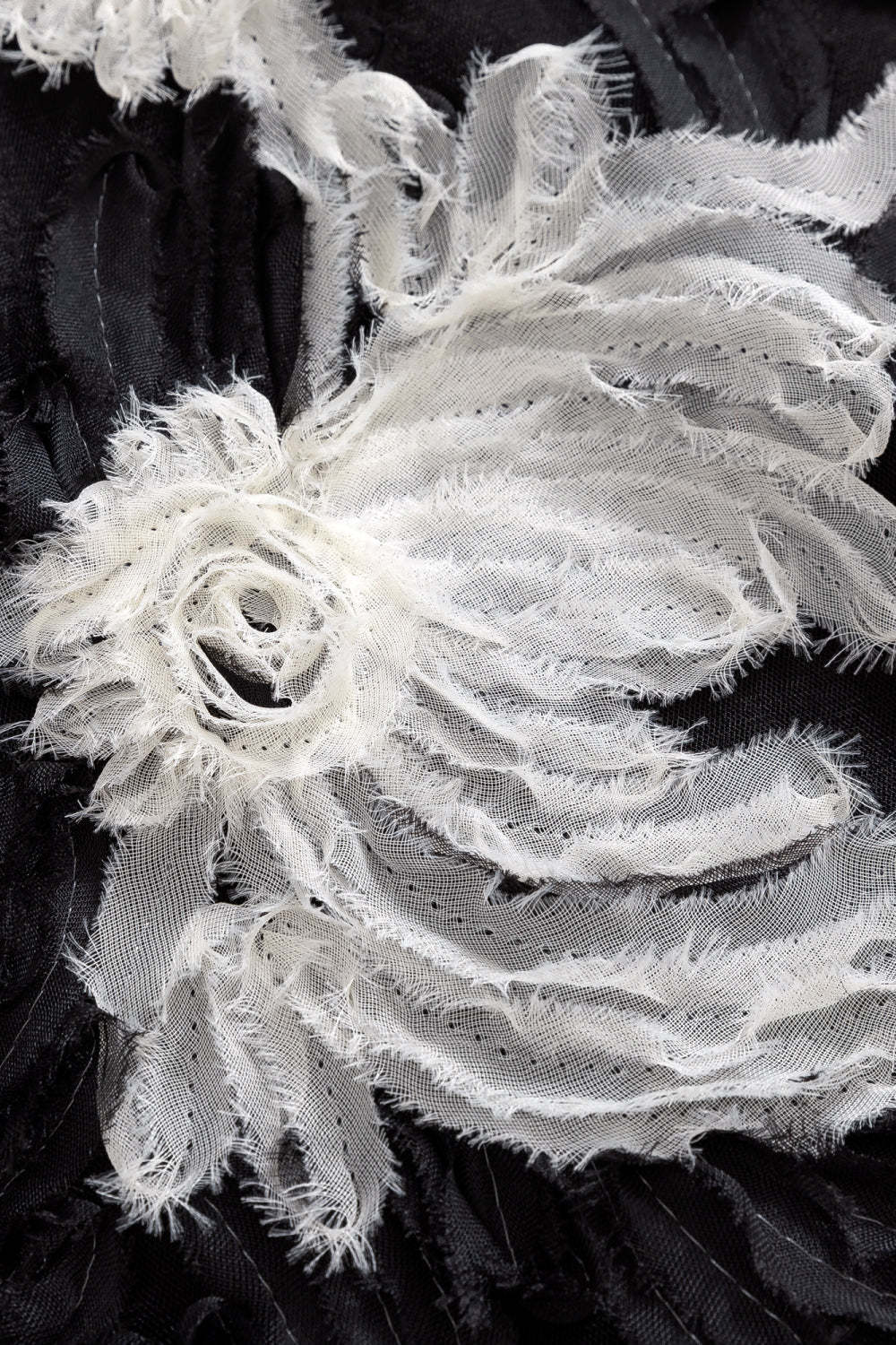 Inspired by Chinese Ink Wash Painting, an often monochromatic watercolor art, I wanted to create a design that depicts the organic sway of flowers in motion. The entire shirt is delicately embroidered with narrow strips of lightweight fabric to shape the flowers, with edges I frilled to mimic the way petals naturally fold and flow.