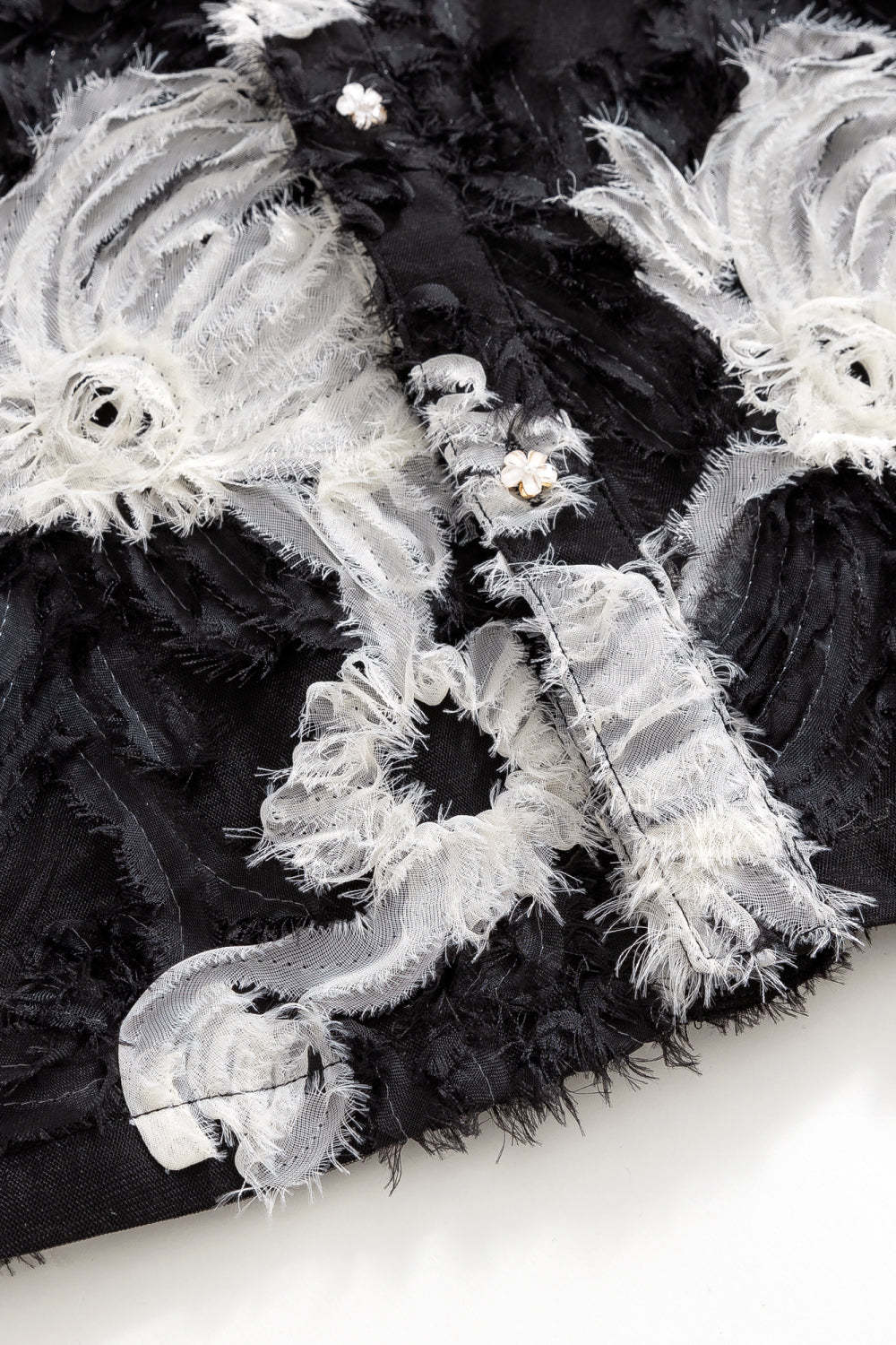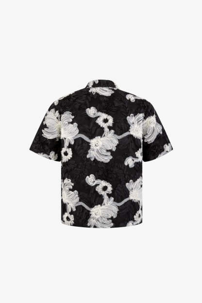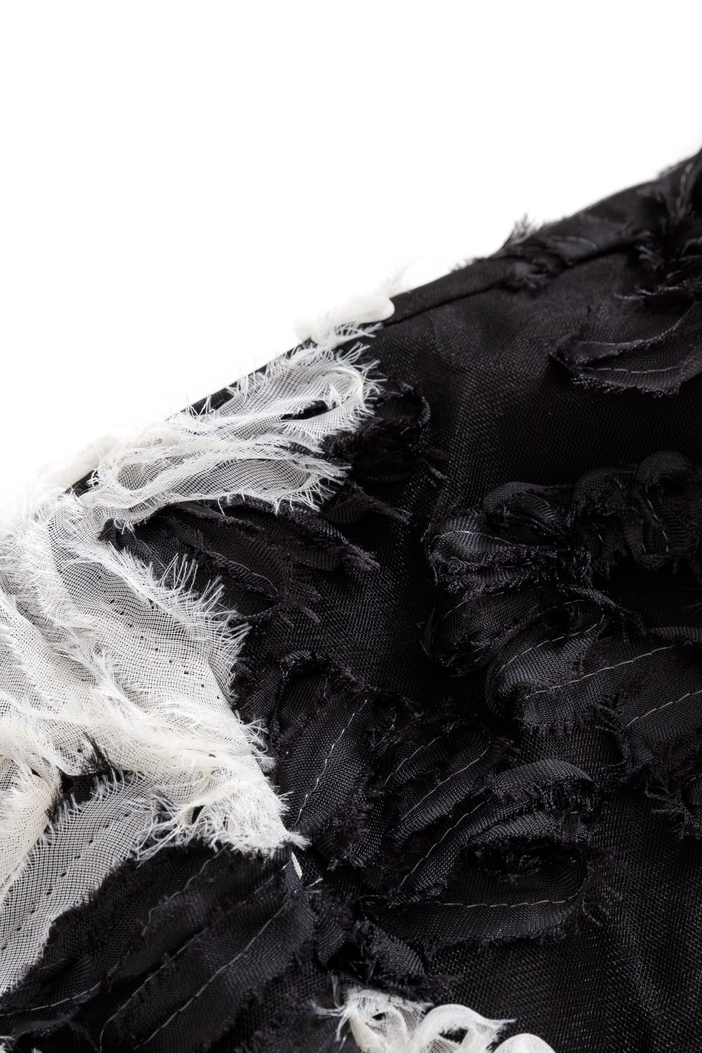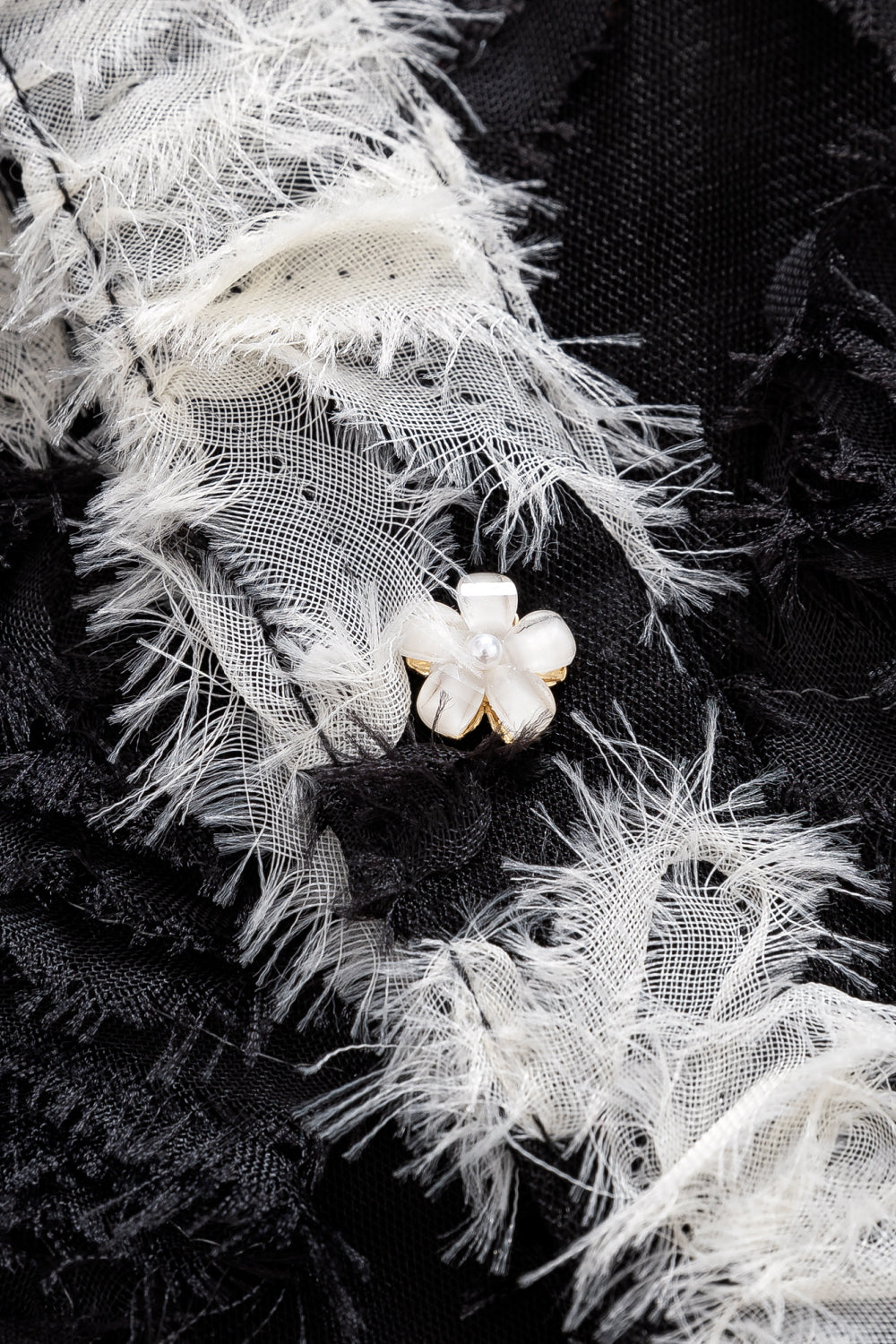 Inspired by Chinese Ink Wash Painting, an often monochromatic watercolor art, I wanted to create a design that depicts the organic sway of flowers in motion. The entire shirt is delicately embroidered with narrow strips of lightweight fabric to shape the flowers, with edges I frilled to mimic the way petals naturally fold and flow.