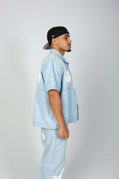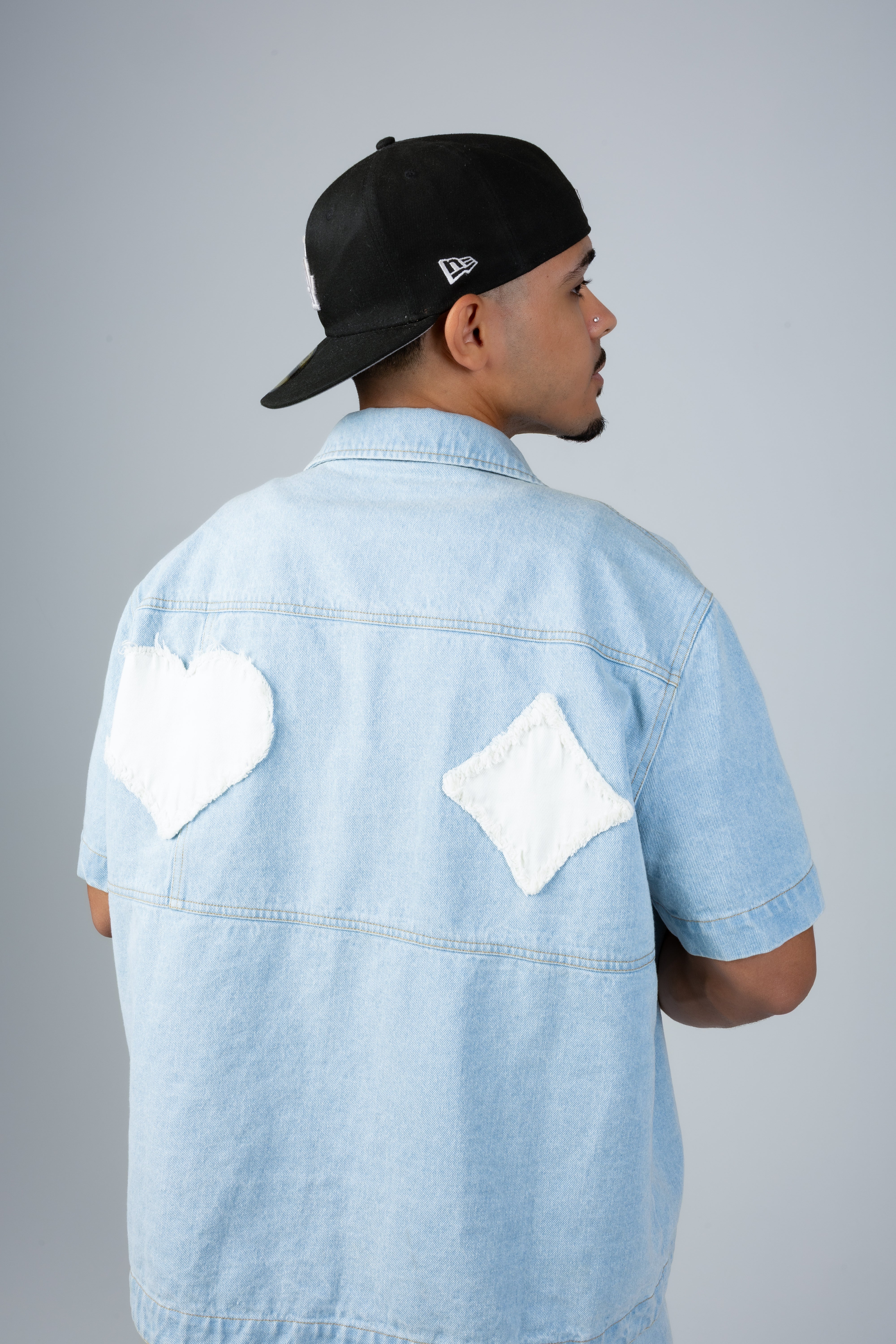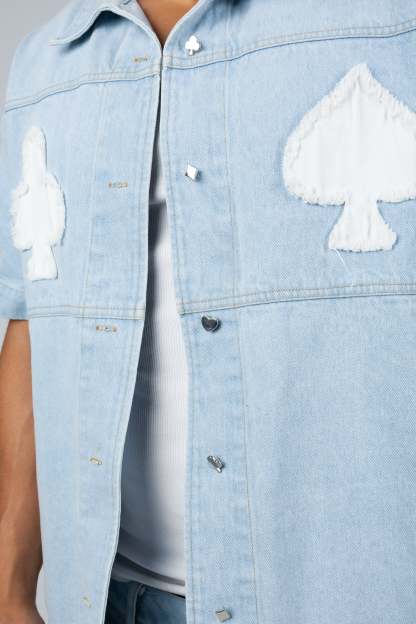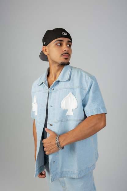 A light blue denim two-piece with distressed patches shaped into card-suit symbols, a direct nod to classic anime motifs. The jacket and pants feature custom buttons and a clean, tailored cut, balancing the raw edge of distressing with a modern streetwear fit. Designed to capture the same aura of a certain joker without ever naming him.