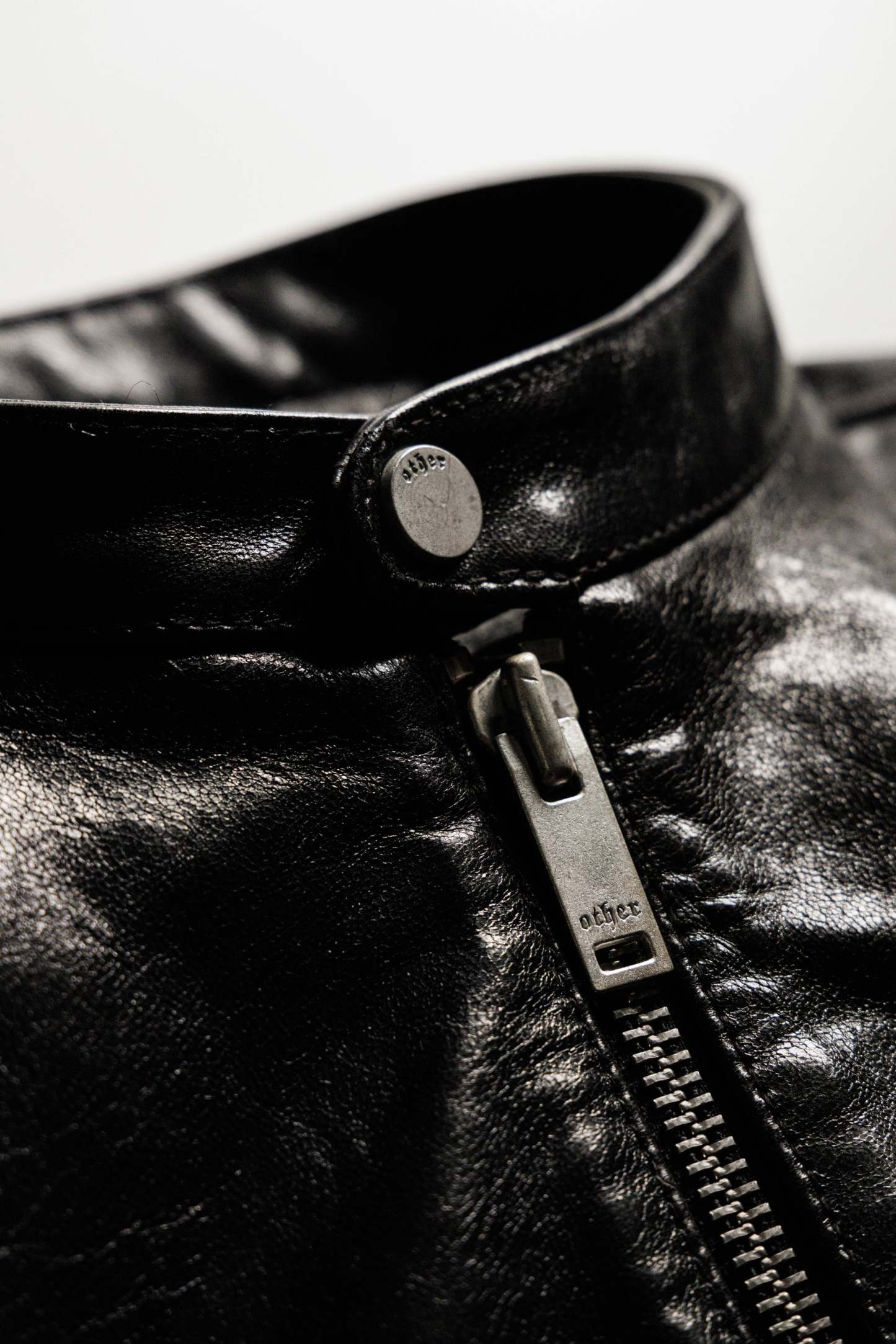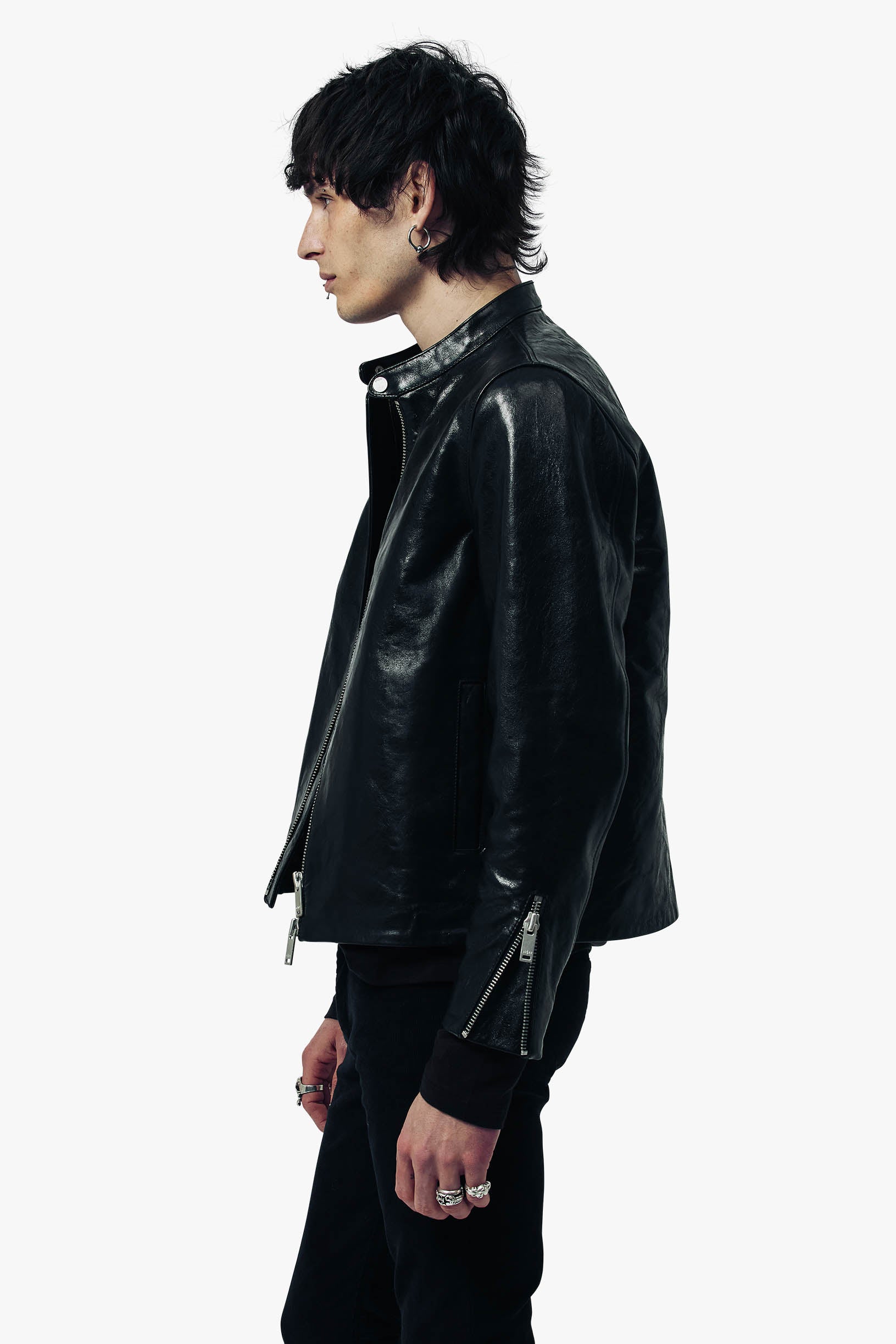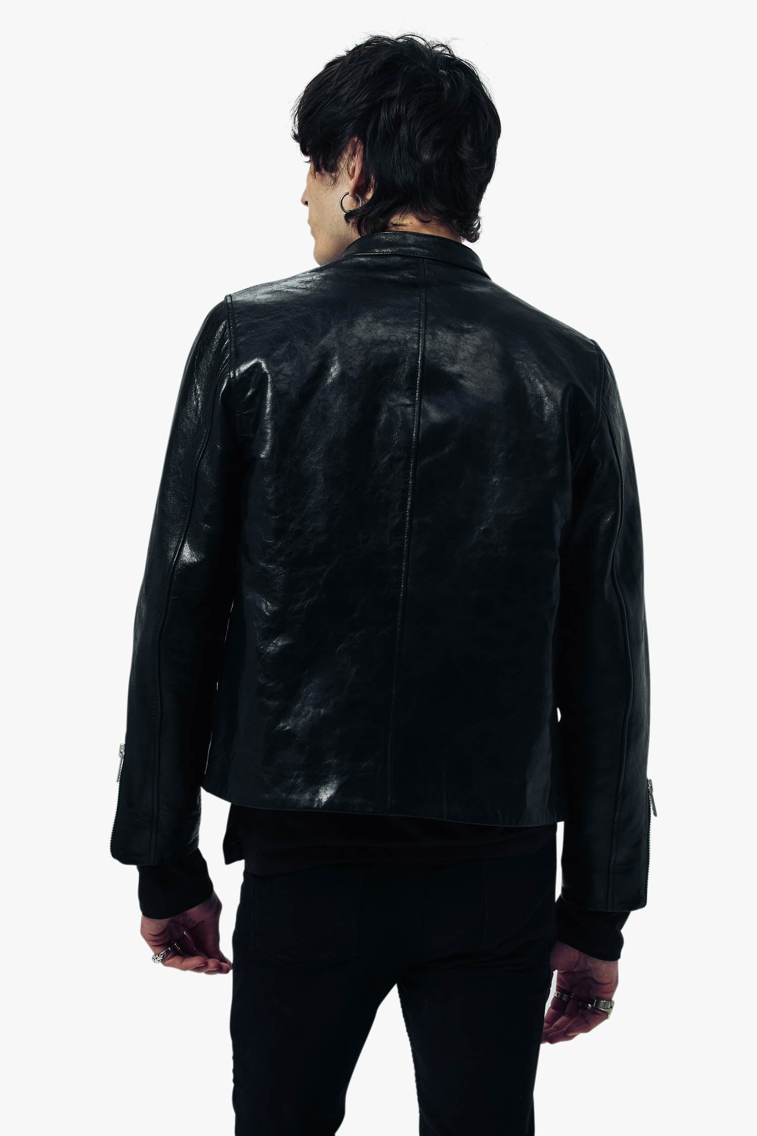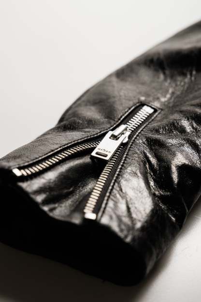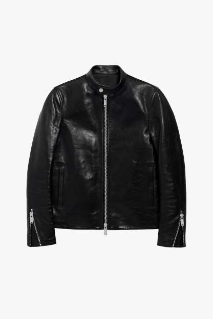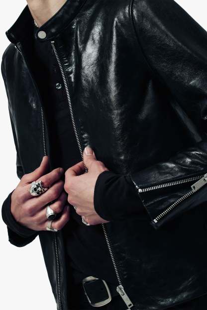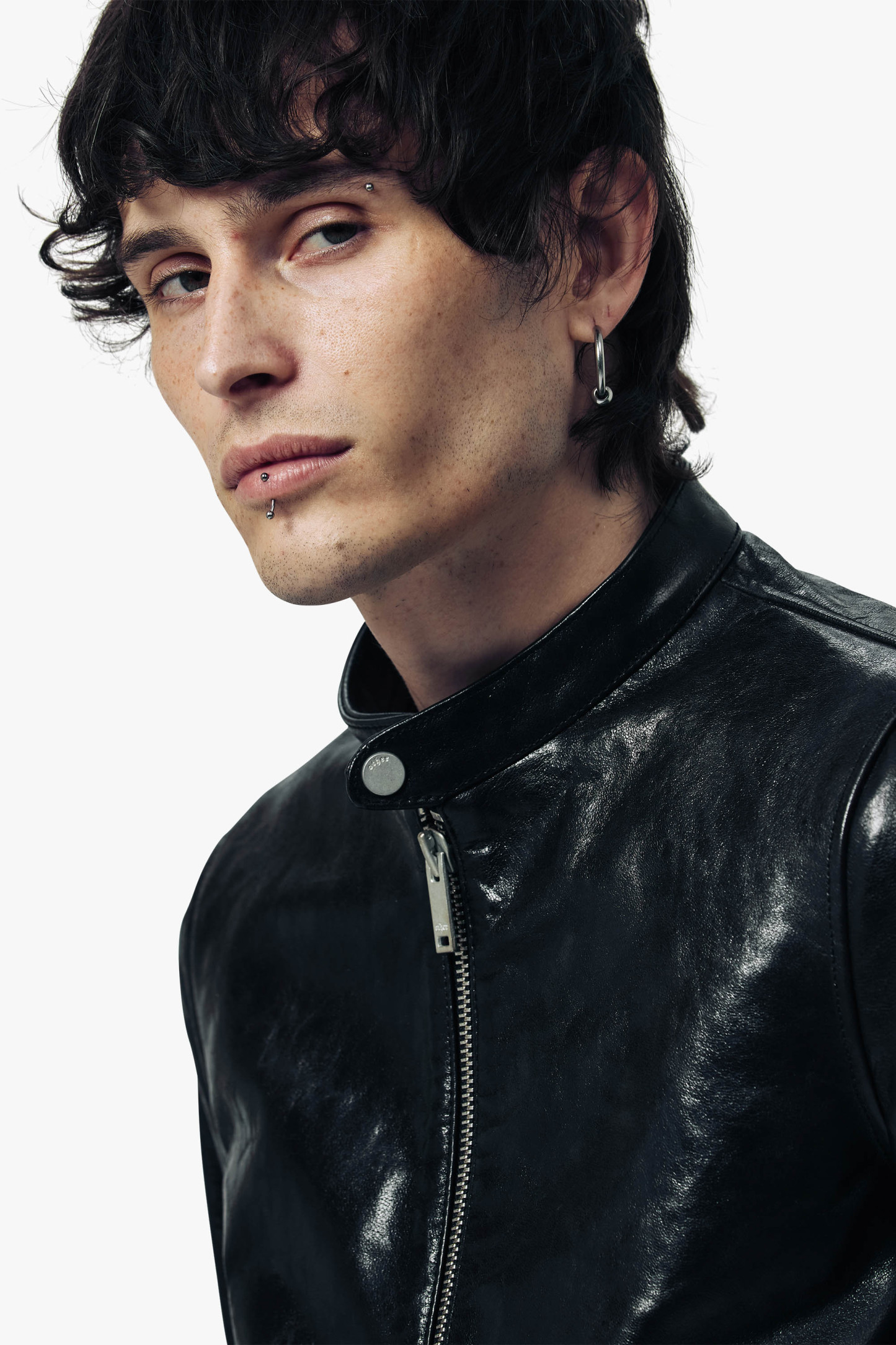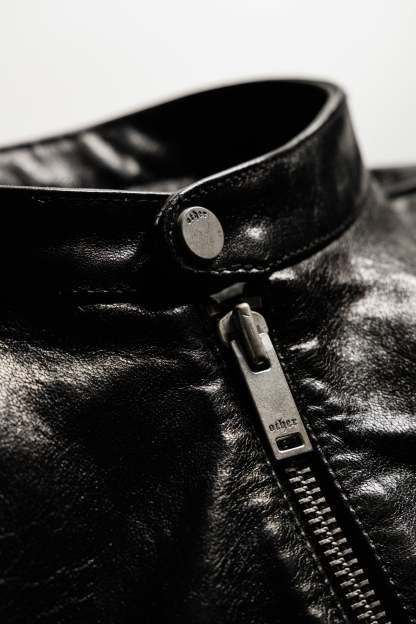 Cut from high-gloss, heavyweight leather with a distinctly vintage edge, this jacket channels the stripped-down attitude of late-‘90s moto culture. The silhouette is sharp. The fit, lean and unforgiving. Finished with raw silver signature hardware that catches the light like chrome on asphalt, every detail is deliberate, every seam designed to move like second skin.