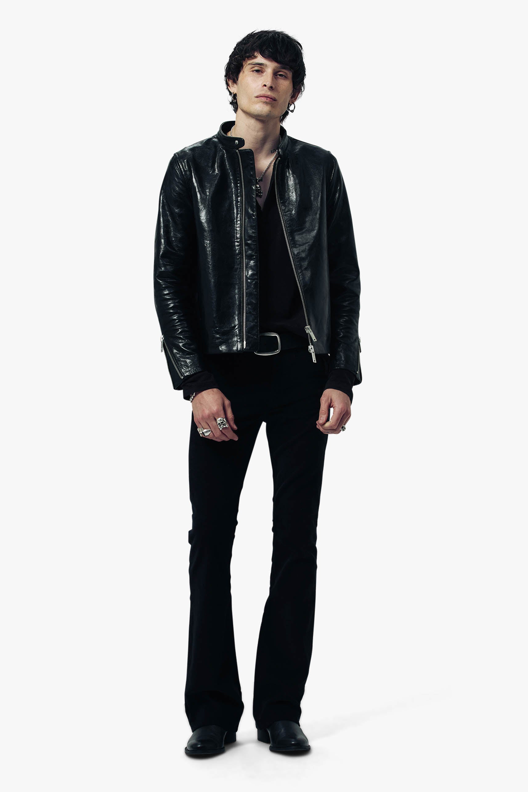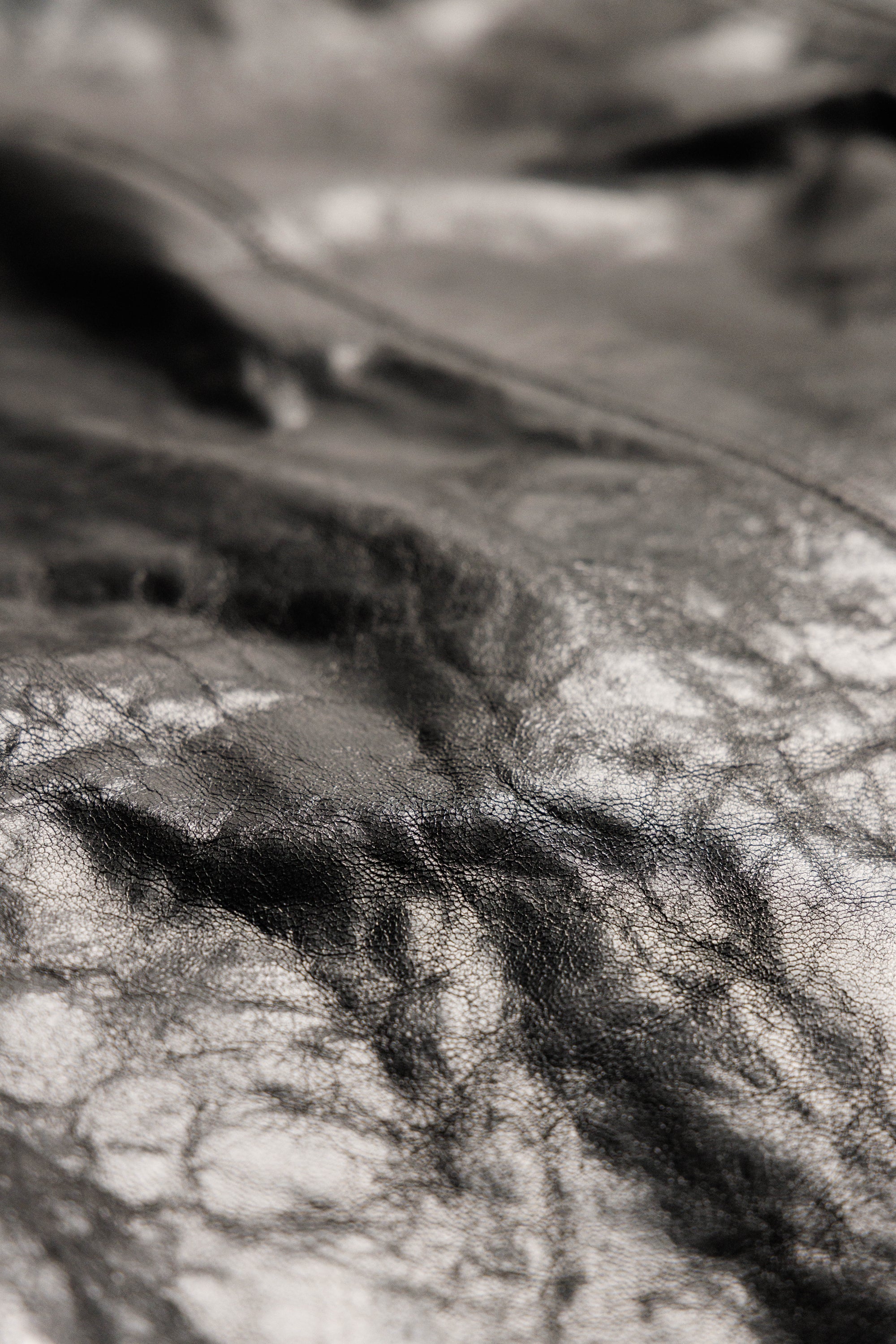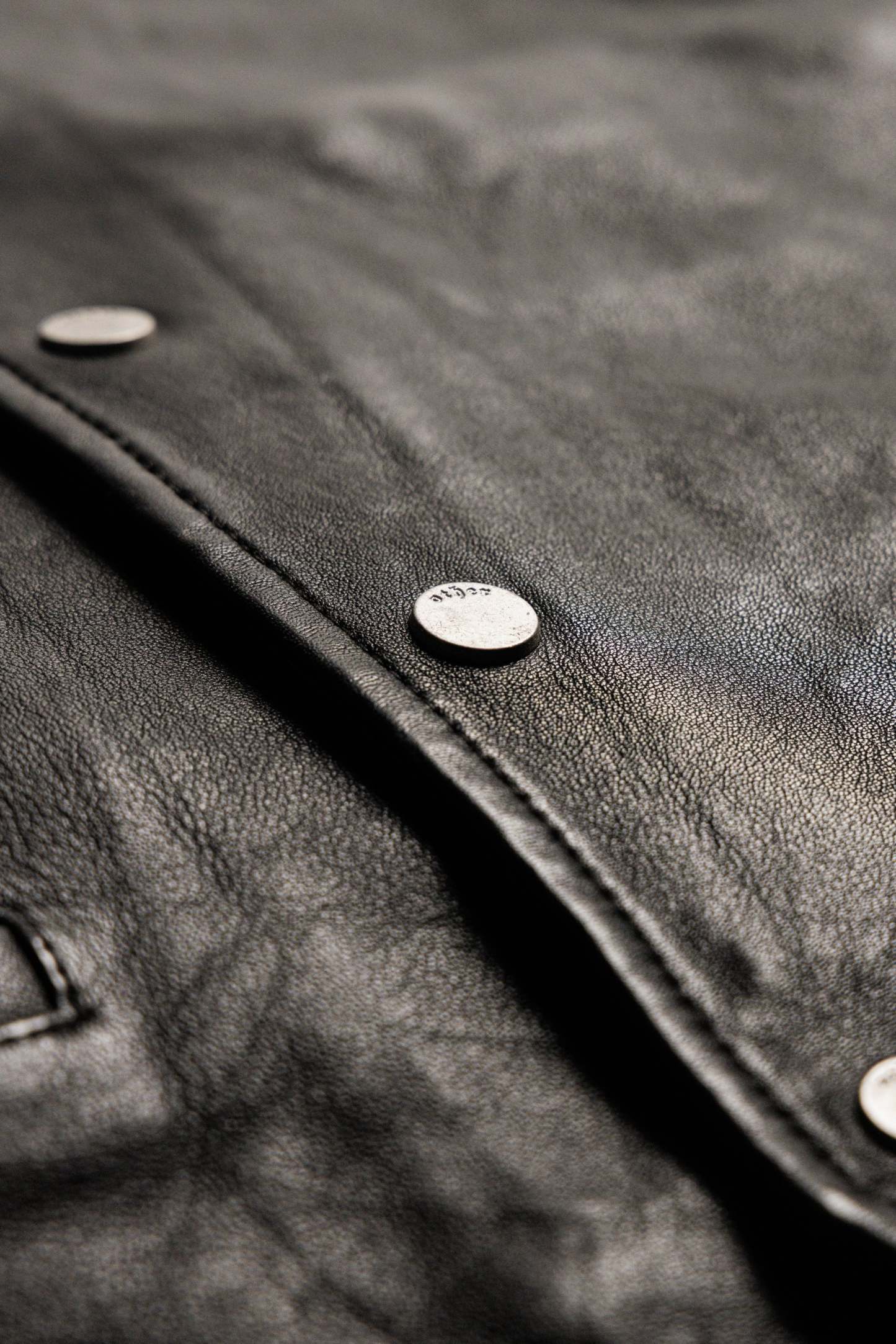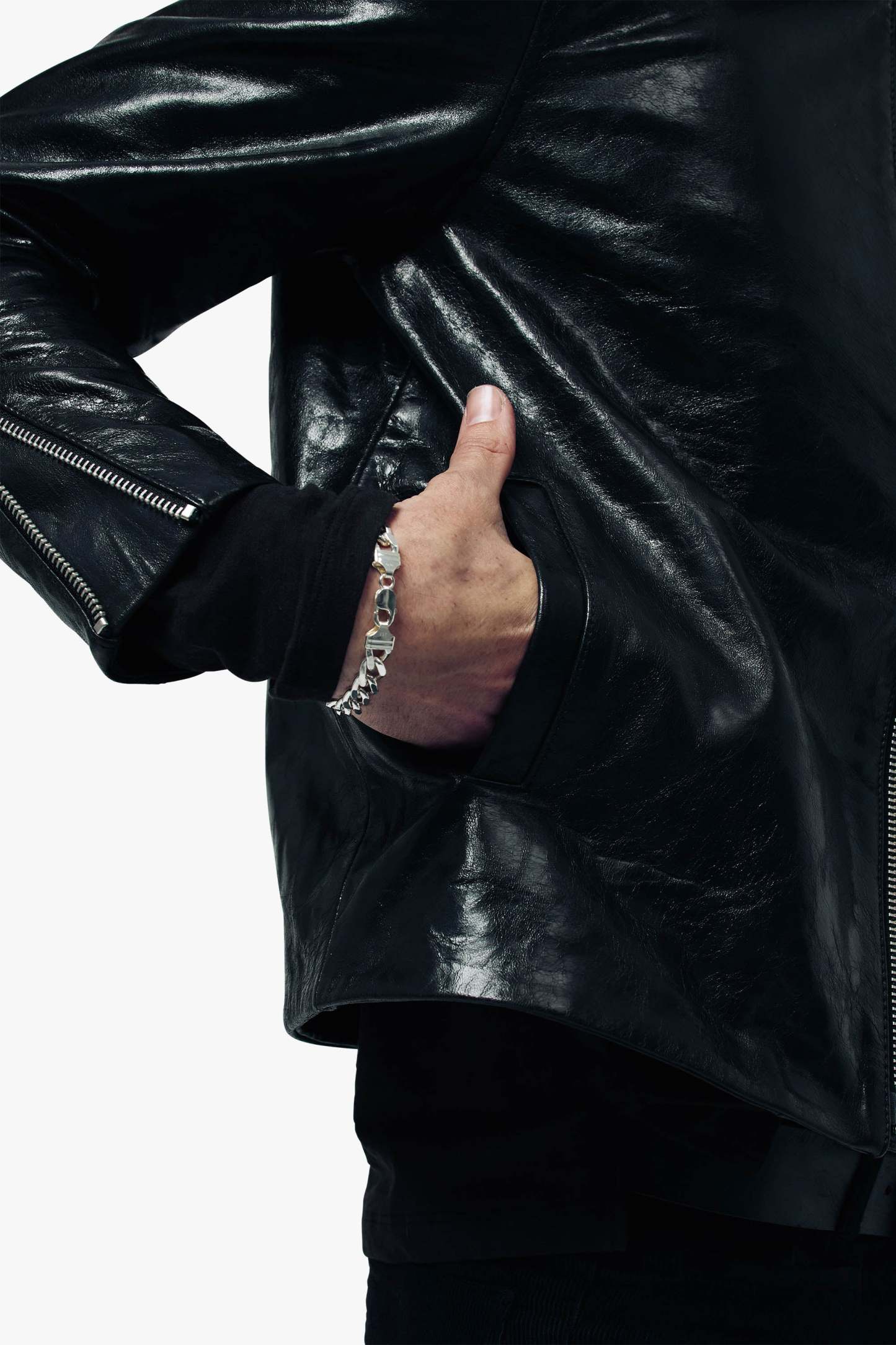 Cut from high-gloss, heavyweight leather with a distinctly vintage edge, this jacket channels the stripped-down attitude of late-‘90s moto culture. The silhouette is sharp. The fit, lean and unforgiving. Finished with raw silver signature hardware that catches the light like chrome on asphalt, every detail is deliberate, every seam designed to move like second skin.