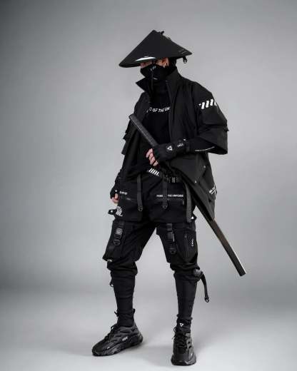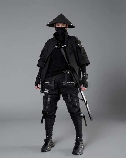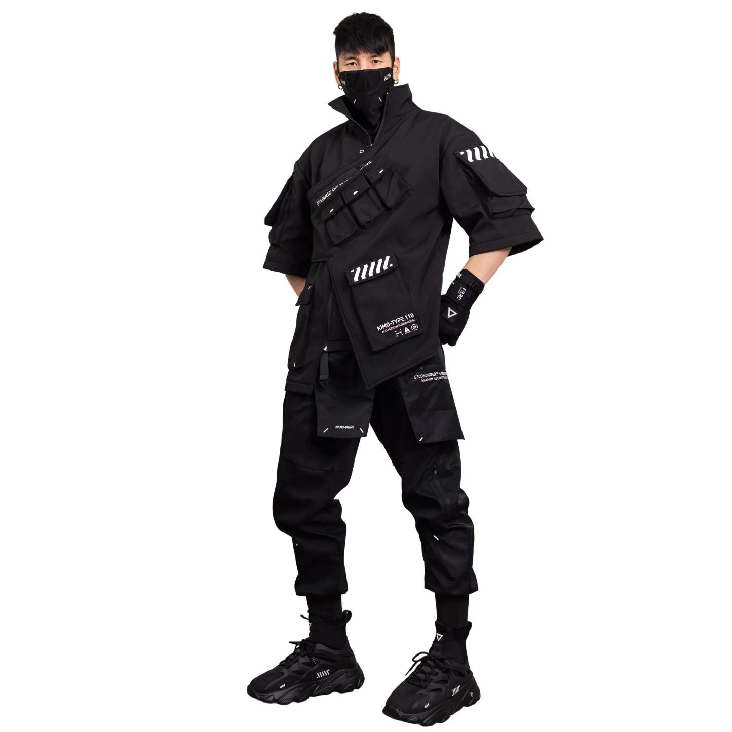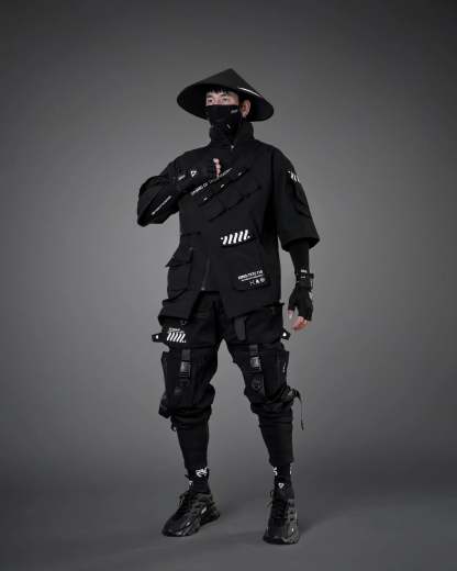 The Kimo-Type 110 Black Kimono Jacket boasts a look that is out of this world. Its asymmetrical layered design is crafted from durable, heavy duty materials. The broad shoulders and slight oversized fit create the perfect silhouette. With a tall collar and multiple cargo pockets adorned with signature logos, this jacket is both functional and stylish. No matter the weather, this jacket is designed to withstand the elements and serve you well for a long time.