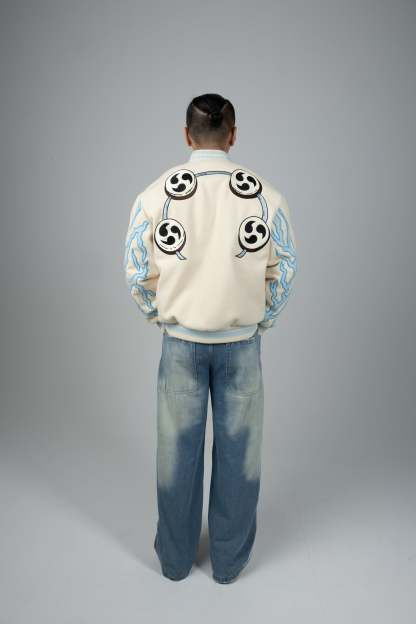 This varsity jacket that fuses timeless design with bold, anime-inspired artistry. Crafted in a warm beige tone, this jacket stands out through its meticulous detailing and unique cultural influences.