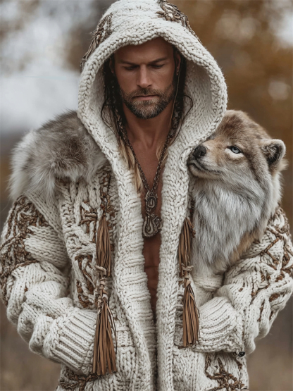 Men's Vintage Western Wild Wolf Chunky Hooded Cardigan