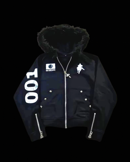 Black full-zip hoodie with a faux-fur hood, metal hardware, and utility details—“001” sleeve hit, chest patches, pyramid-stud pocket corners, and zippered cuffs. Mid-heavy feel, relaxed fit, split kangaroo pockets, and ribbed trims. High quality cotton blend, true to size, and ready to ship.