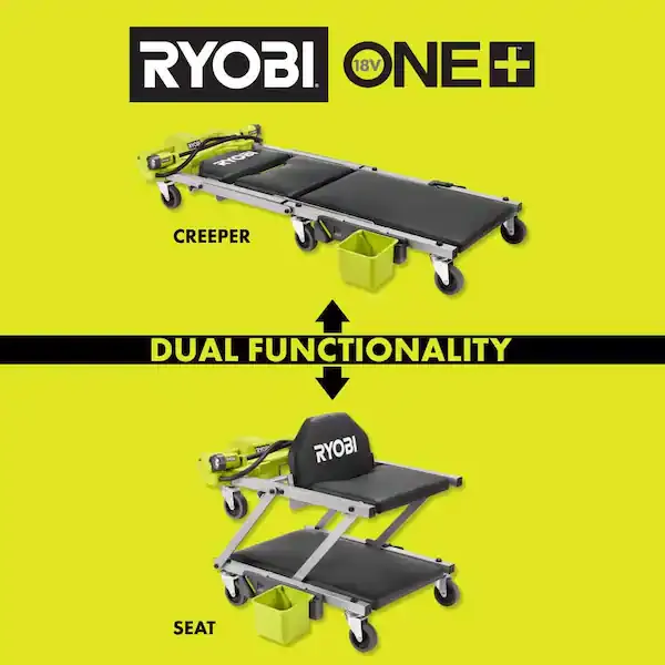 The RYOBI 18V ONE+ Dual Function Lighted Creeper/Seat is the ultimate solution for a variety of tasks. Offering multi-position versatility, seamlessly transition from a creeper for undercar work to a comfortable seat for use around the workshop, garage, and more with just one touch. Equipped with two on-board LED lights delivering up to 800 lumens, this product ensures maximum visibility even in low-light environments. These flexible lights feature both flood mode and spot beam for precise and customizable lighting placement. The 5-position adjustable headrest/backrest provides comfort and support for every job. Featuring chemical resistant cushions and heavy-duty 3" casters, this product offers both durability and smooth mobility. The integrated storage compartments keep your bits, hand tools, and small parts neatly organized and within easy reach. Plus, the included LINK accessory rail and single organizer bin makes additional storage quick and efficient. Best of all, it is part of the RYOBI ONE+ System where any 18V ONE+ battery works with any 18V ONE+ product. This 18V ONE+ Dual Function Lighted Creeper/Seat is backed by the RYOBI 3-Year Manufacturer’s Warranty and includes a LINK Bin, Hardware Pack and Operator's Manual.