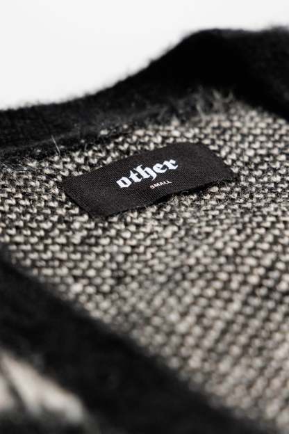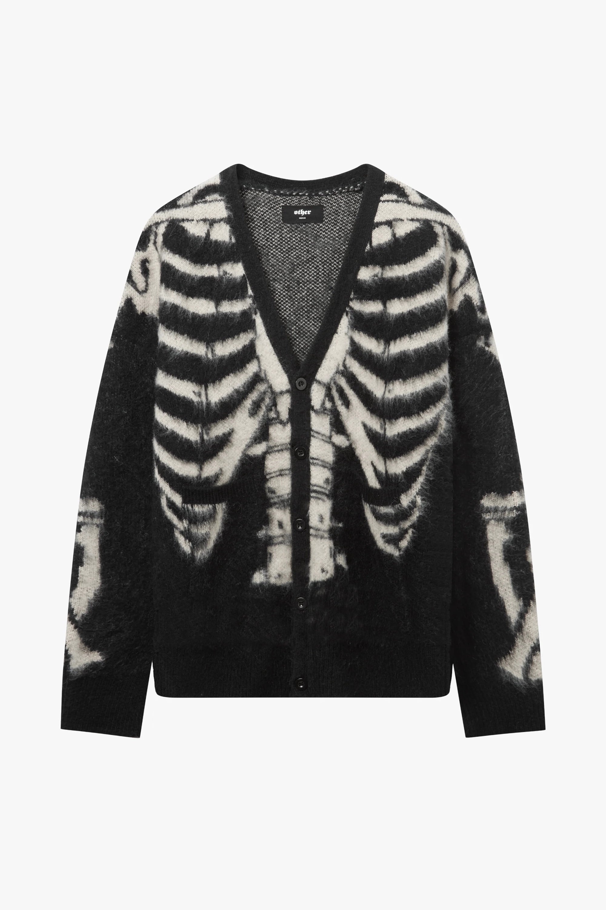 Crafted from a premium brushed wool and mohair blend, this oversized cardigan delivers a soft, luxurious feel with a rebellious edge. The bold skeleton graphic channels classic rock energy, while the ribbed placket, cuffs, and hem bring structure to its relaxed silhouette. Finished with front pockets for attitude and ease, a statement piece built for late nights, loud rooms, and life on the edge.
