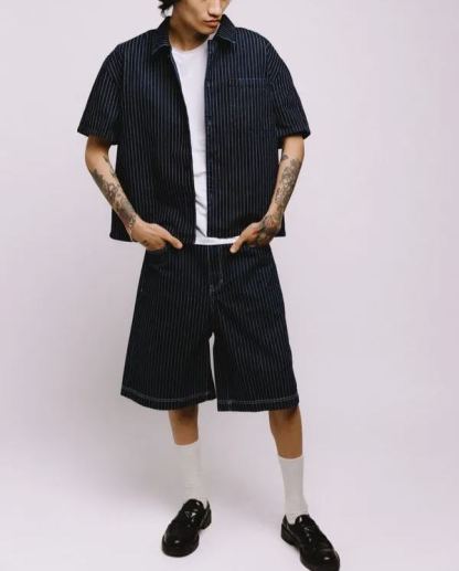 Introducing Our Short Sleeve Shirt in Blue With White Pinstripes. The shirt features one chest pocket with our signature logo embroidered into the upper left side. Cut to a refined boxy, slightly cropped fit making our short sleeve an outerwear essential.