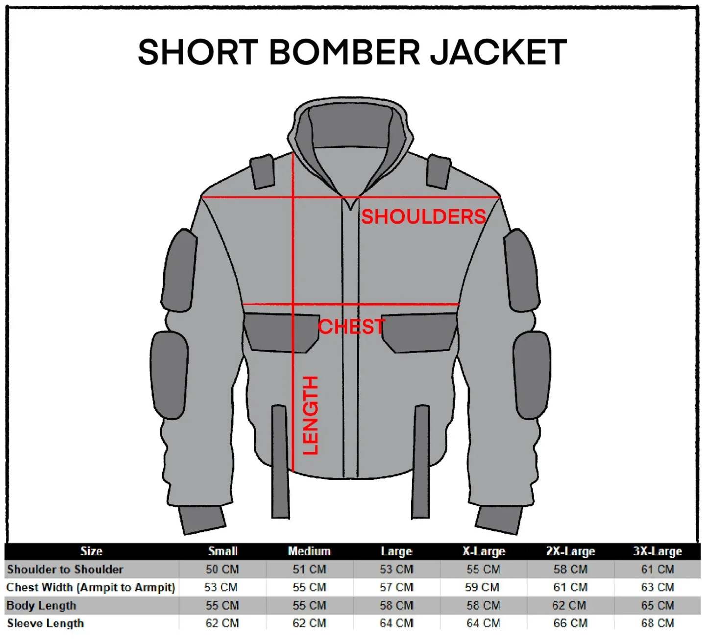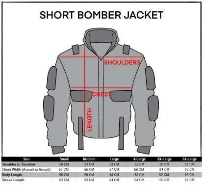 Fitted torso, broad shoulders and 10 cm shorter than regular bombers.