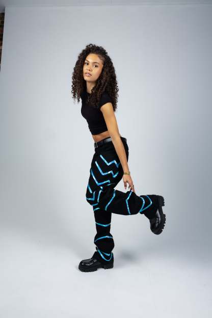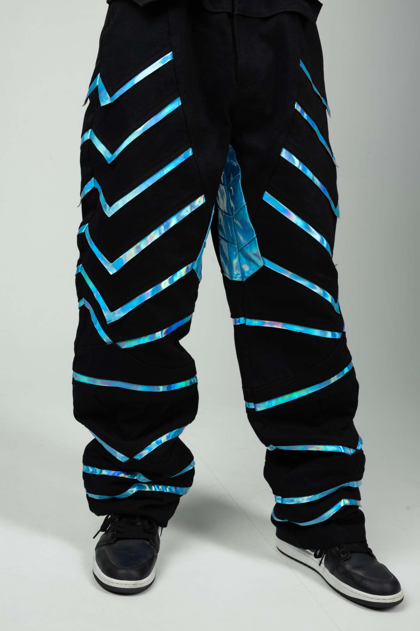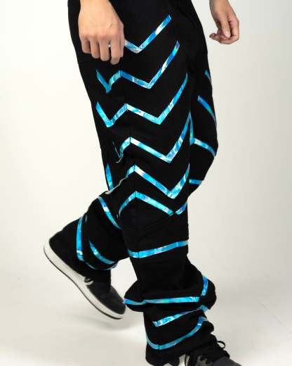 The Shadow Warrior Pants bring a sharp streetwear edge with a tight, secure waist that drops into a looser, baggy fit at the bottom. Made from reflective blue fabric, they catch the light to give off a subtle glow that stands out without trying too hard. Layered details run along the legs, drawing inspiration from armor plating, adding structure and depth to the design.