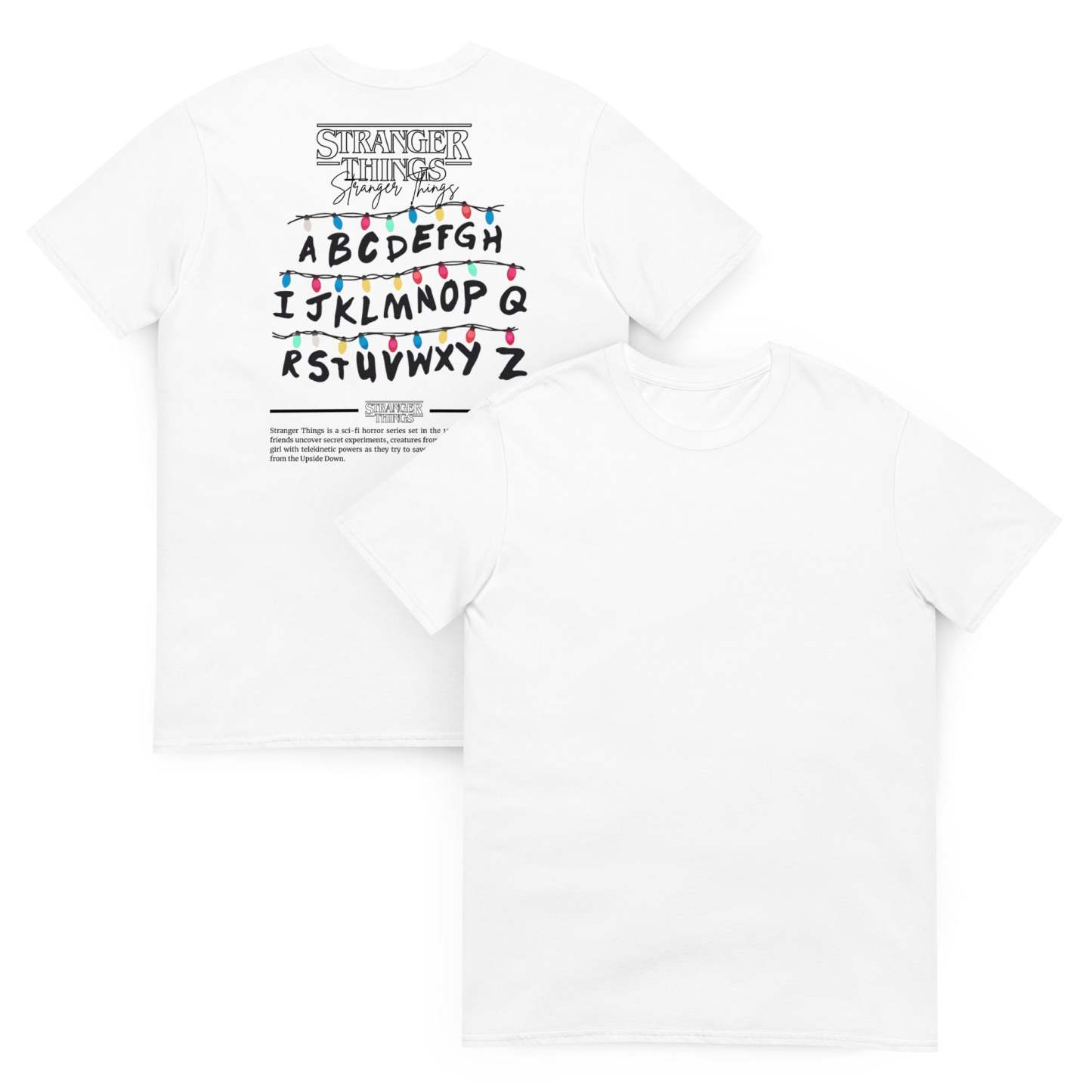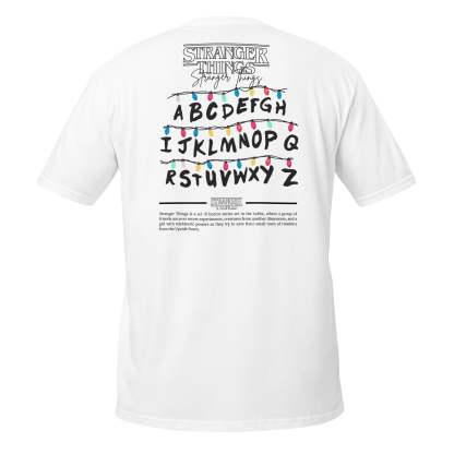 Sumérgete en el misterioso mundo de Stranger Things con esta camiseta de edición especial Camiseta blanca de Stranger Things con diseño inspirado en las icónicas luces de Navidad de Joyce Byers de la primera temporada. En el centro, se muestra una hilera de bombillas de colores colgando sobre las letras del abecedario pintadas en la pared, tal como Joyce lo usó para comunicarse con Will desde el Upside Down.Perfecta para los verdaderos fans de Hawkins, combina estilo, comodidad y la esencia retro que ha conquistado a millones.