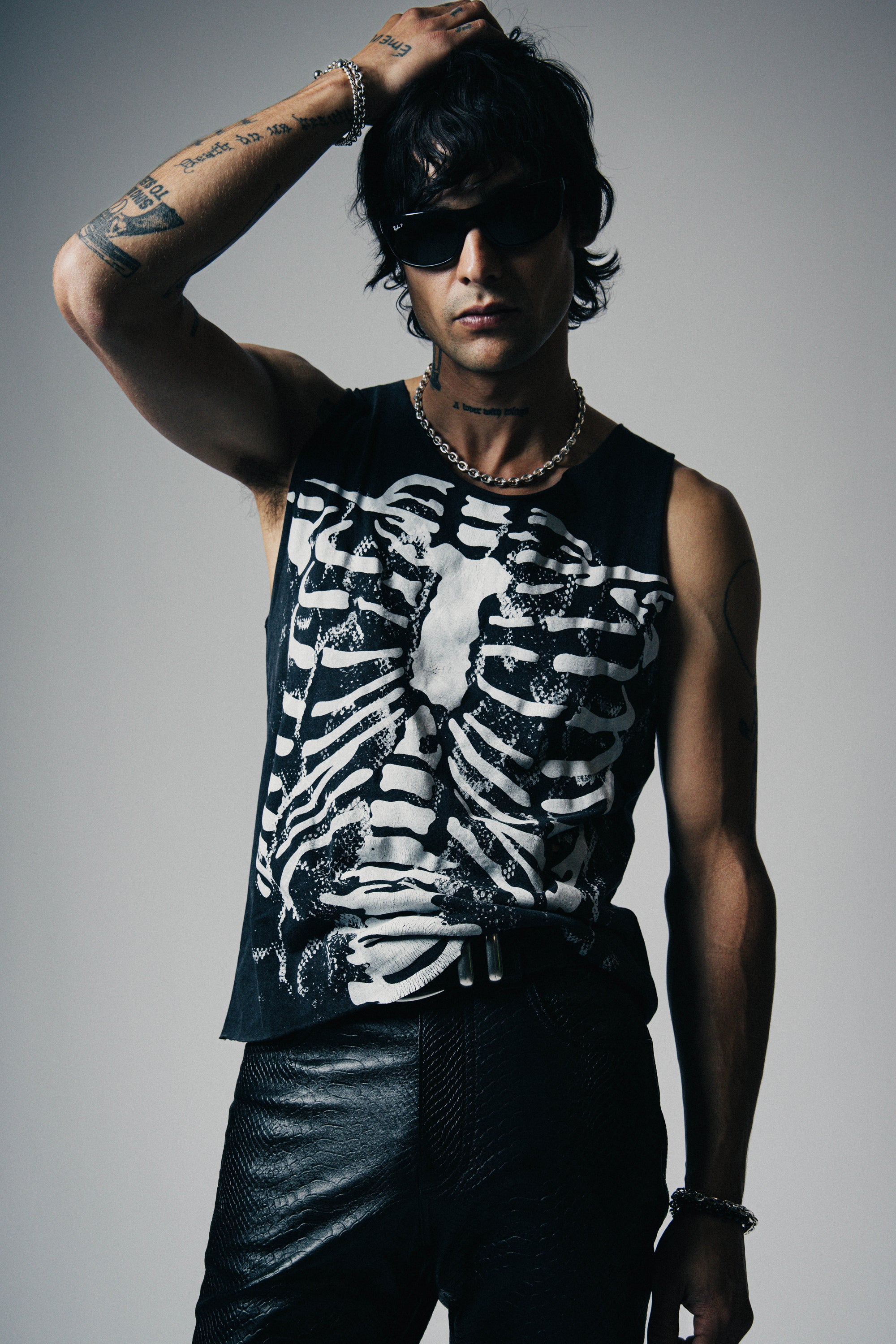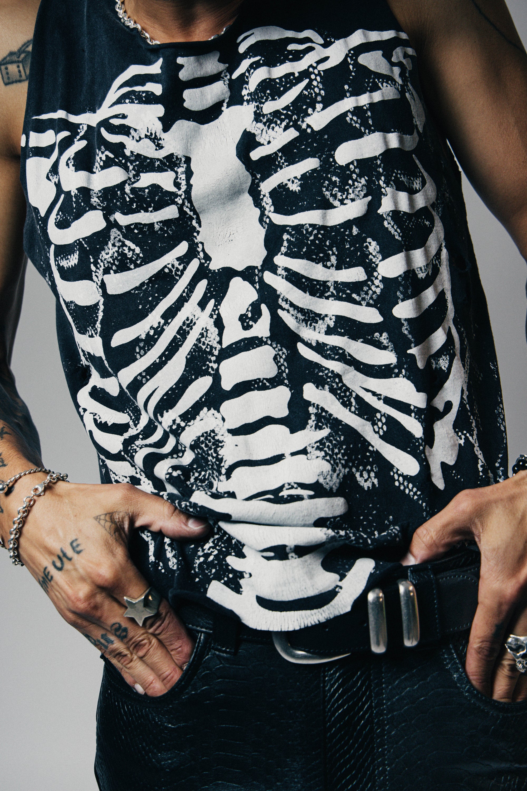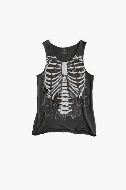 The Skeleton Destroyed Tank is crafted from 100% cotton and features a layered hand screen printed design with bold snake print and a punk rock skeleton graphic. Distressed, aged, and burnt for a perfectly worn-in, rock 'n roll look that stands out from the crowd