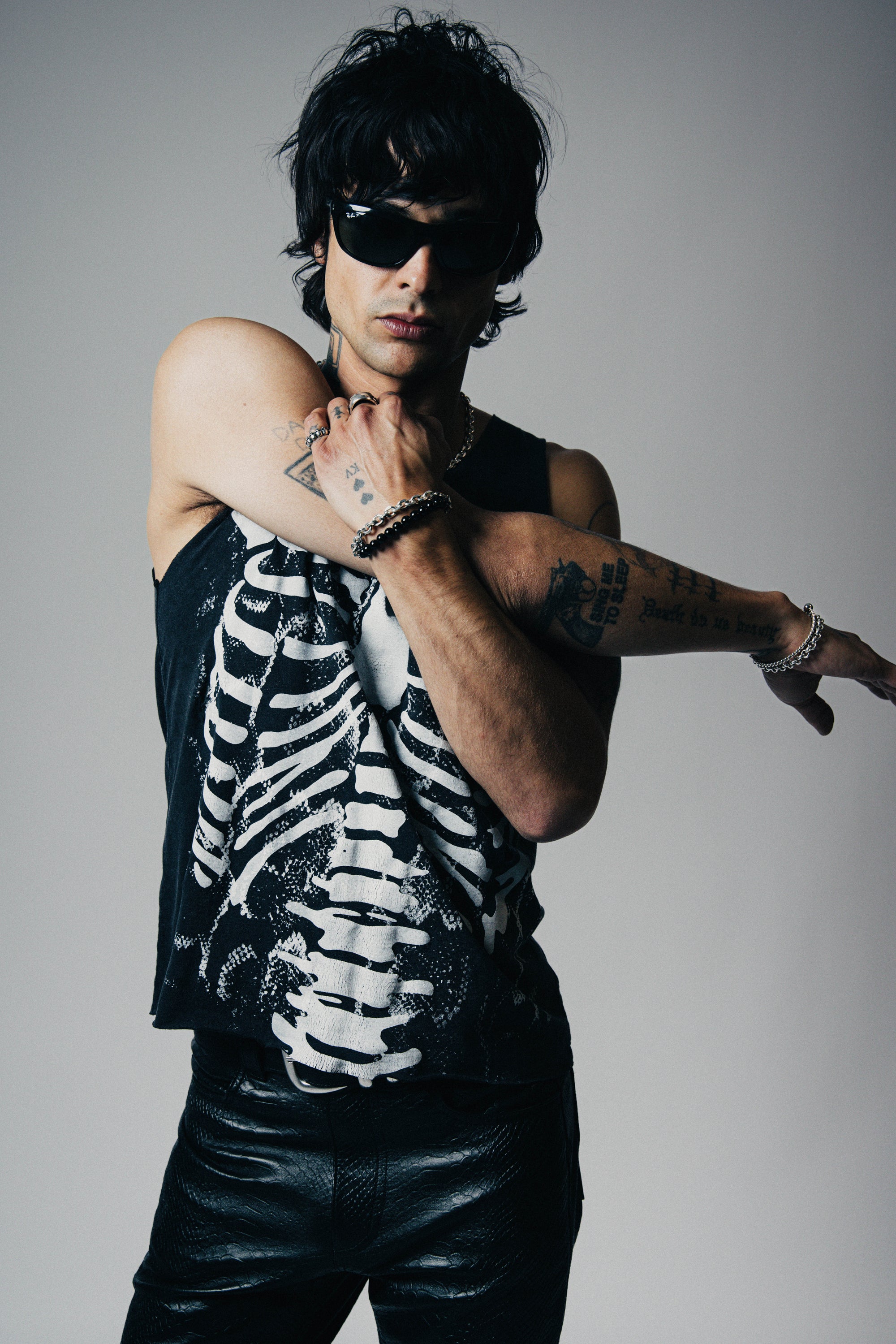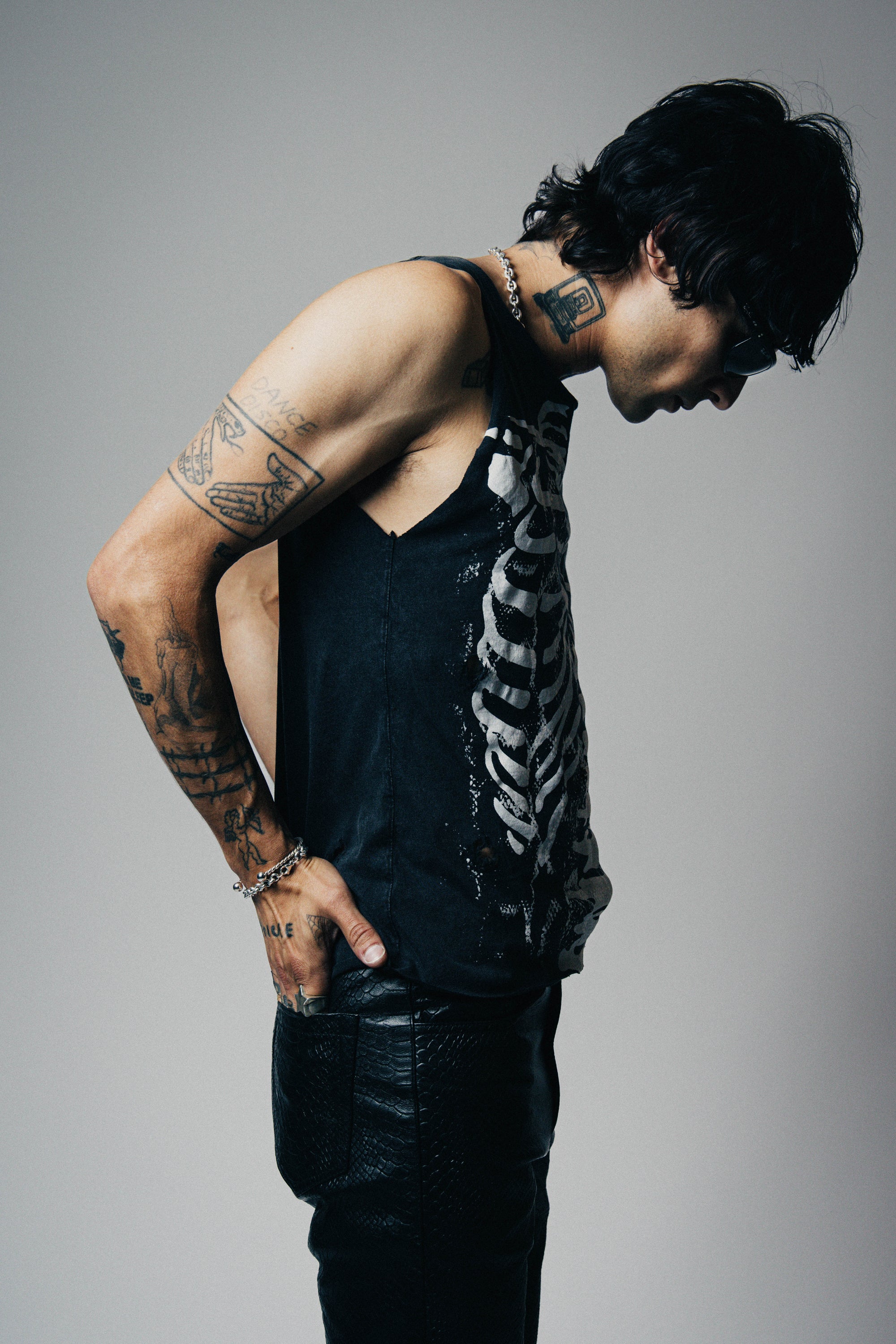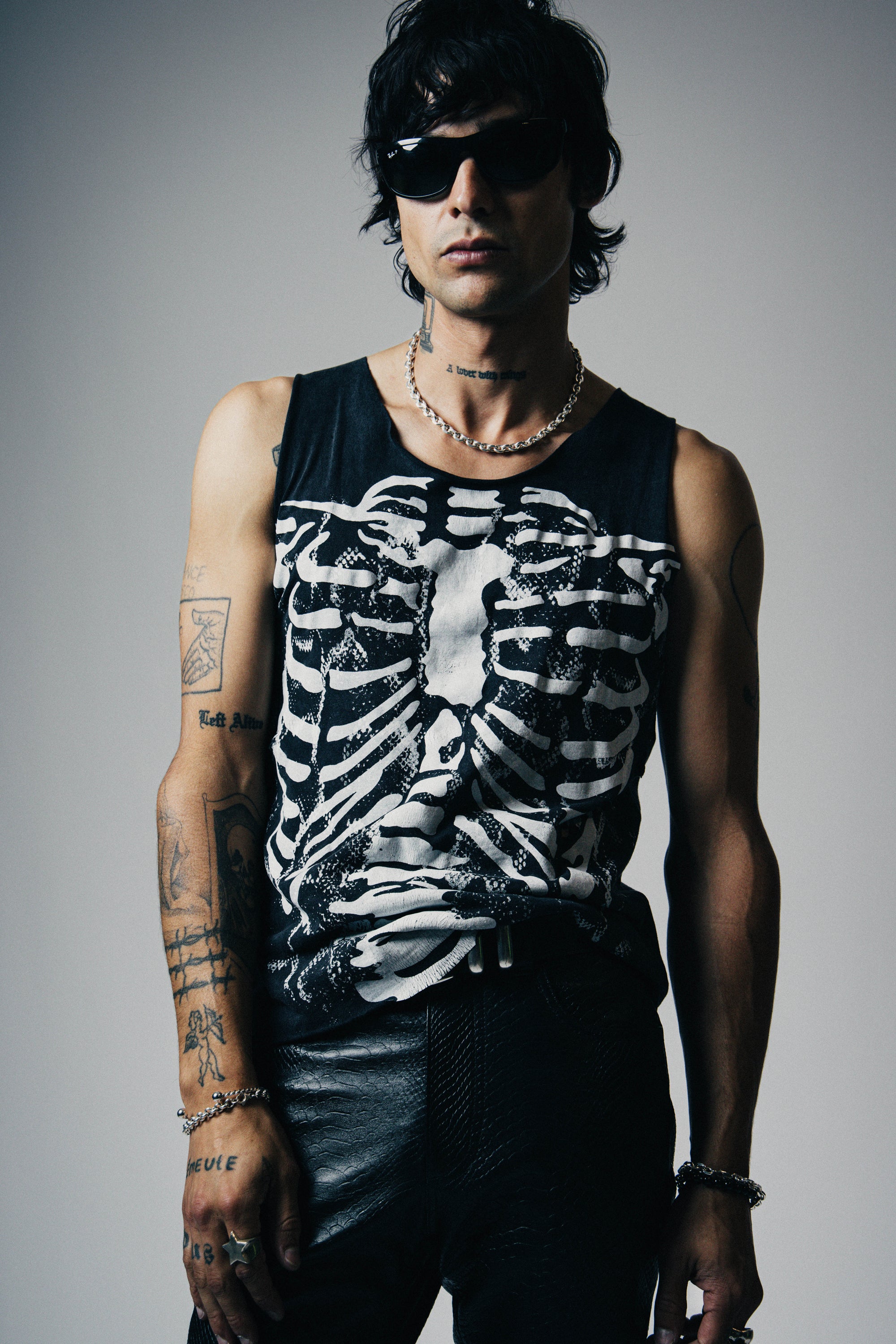 The Skeleton Destroyed Tank is crafted from 100% cotton and features a layered hand screen printed design with bold snake print and a punk rock skeleton graphic. Distressed, aged, and burnt for a perfectly worn-in, rock 'n roll look that stands out from the crowd