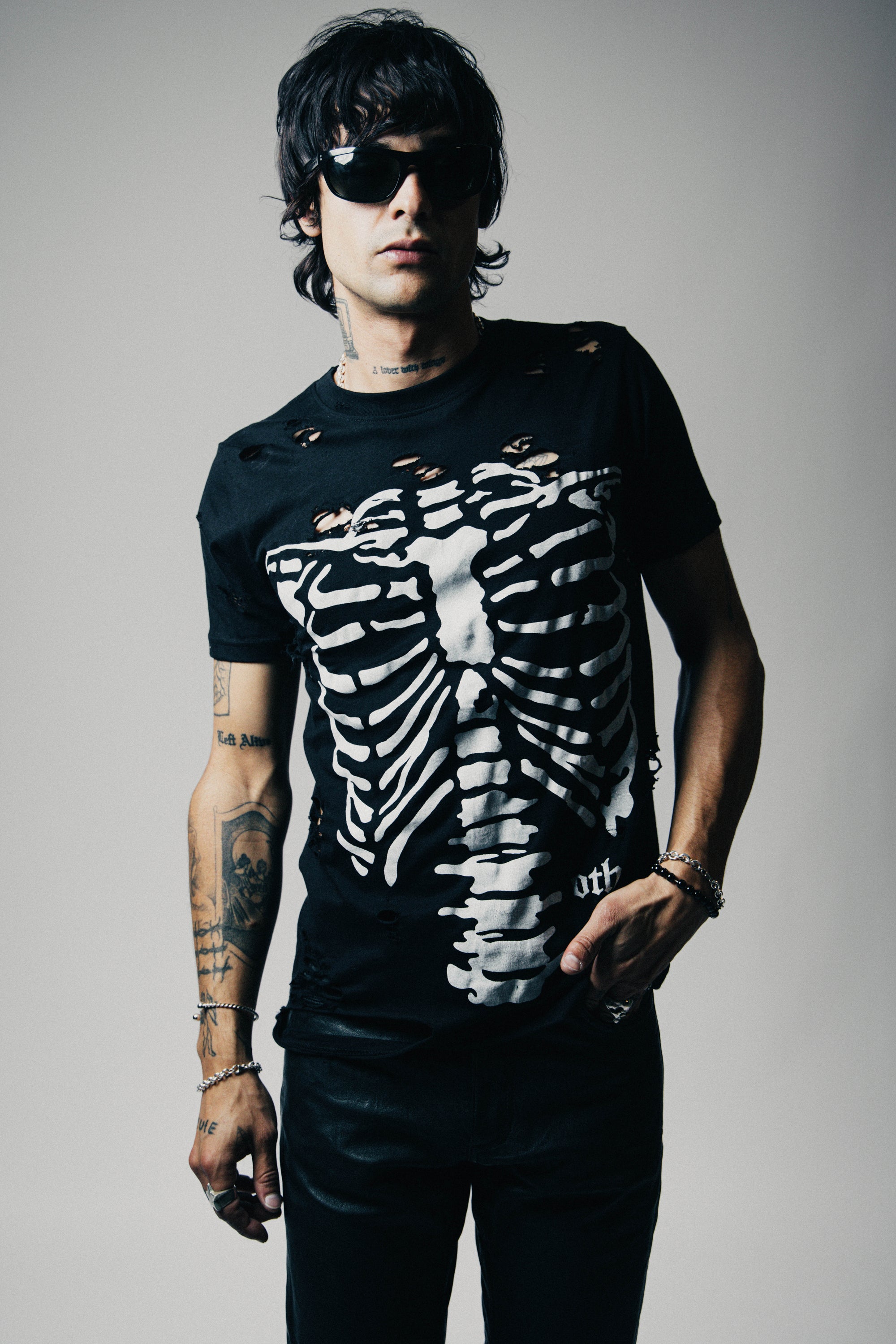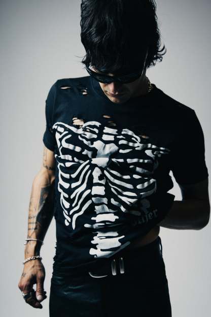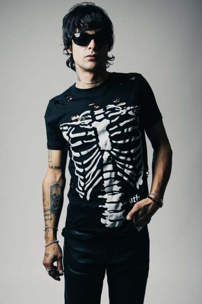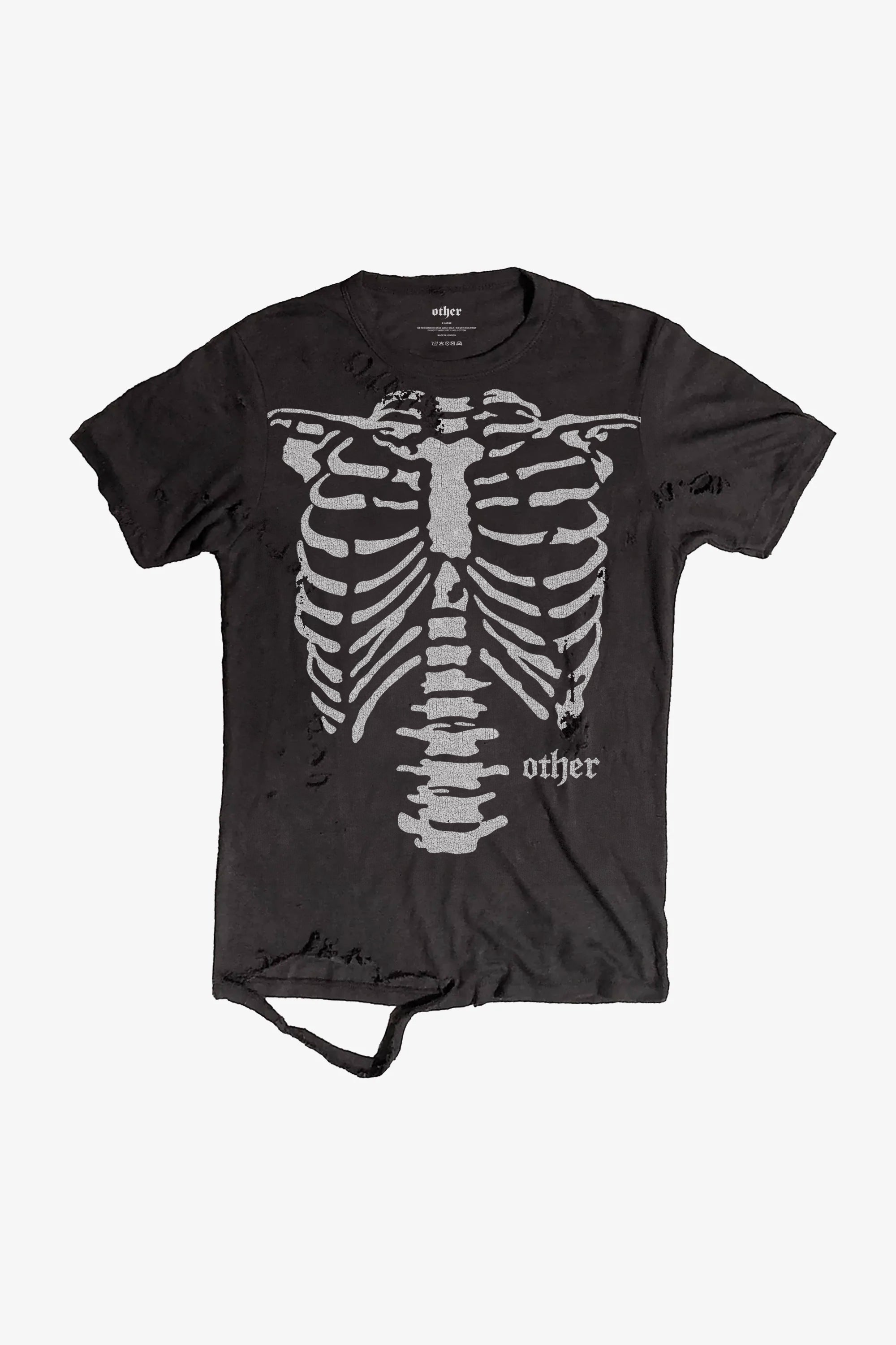 The Thrasher Tee is a timeless icon of rebellion. Crafted in a regular fit with a classic crew neck, this piece is hand-distressed in our studio for a truly unique finish. Made from 100% cotton, it carries the essence of raw, destroyed details that speak to the fearless spirit of rock 'n' roll. Featuring our new Other branded skeleton hand screen-printed graphic, each shirt is a one-of-a-kind creation, as individual as the soul who wears it.