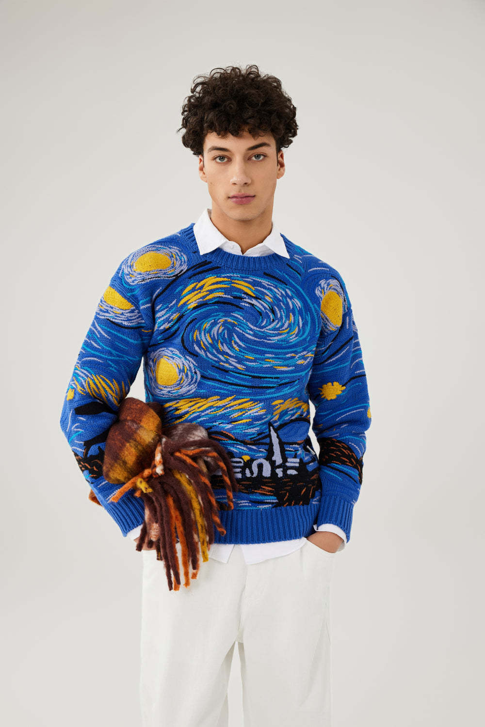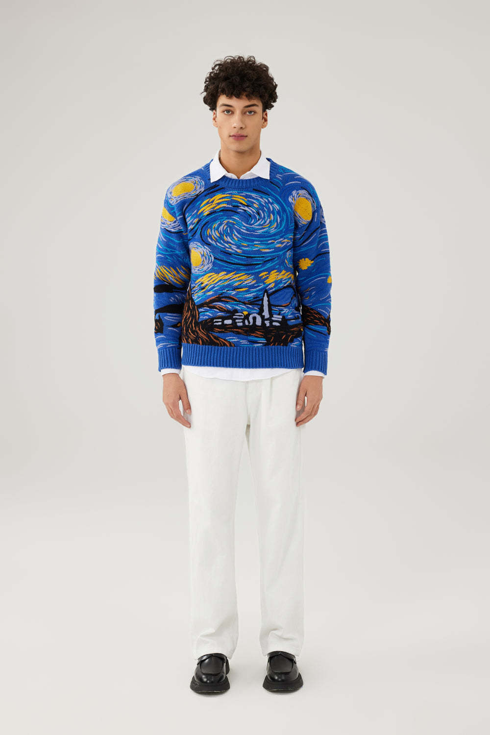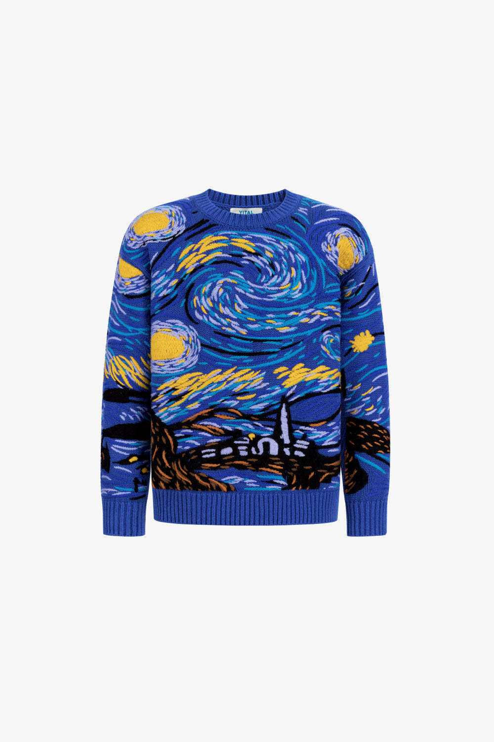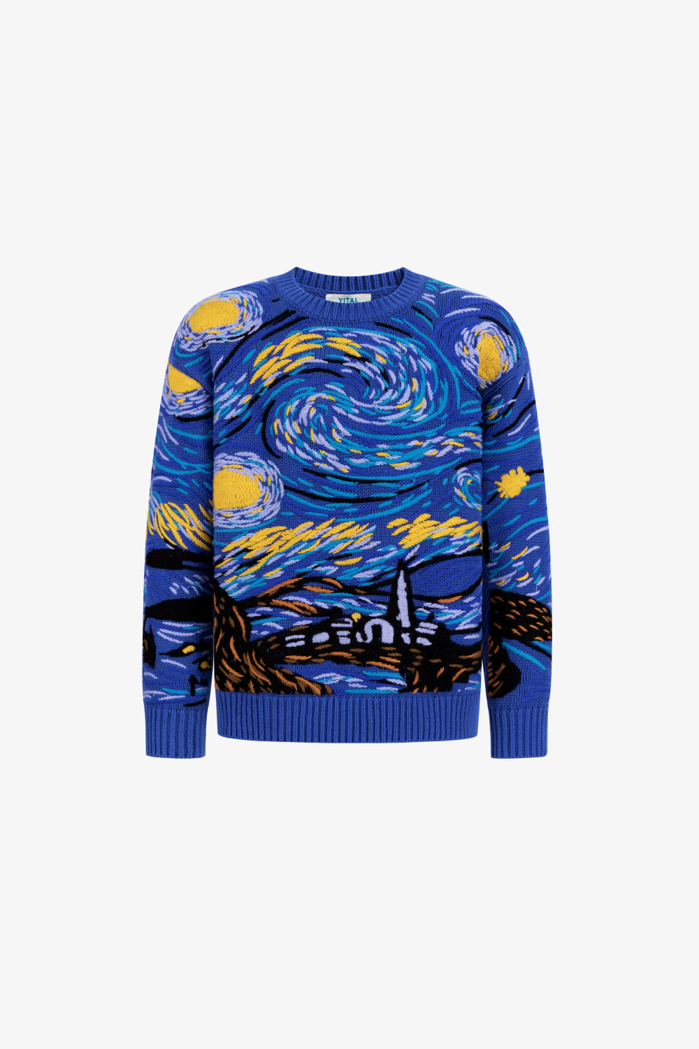 Each swirling motion of thread captures the emotional turbulence of the original painting—translated into textured motion across a 3-gauge 100% cotton knit.