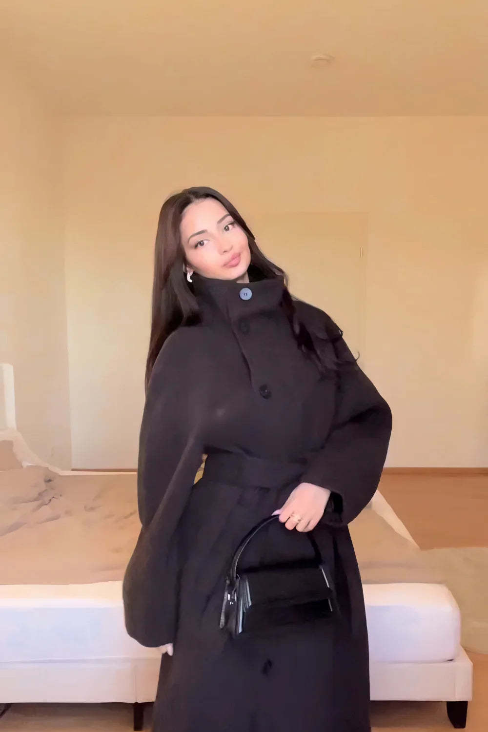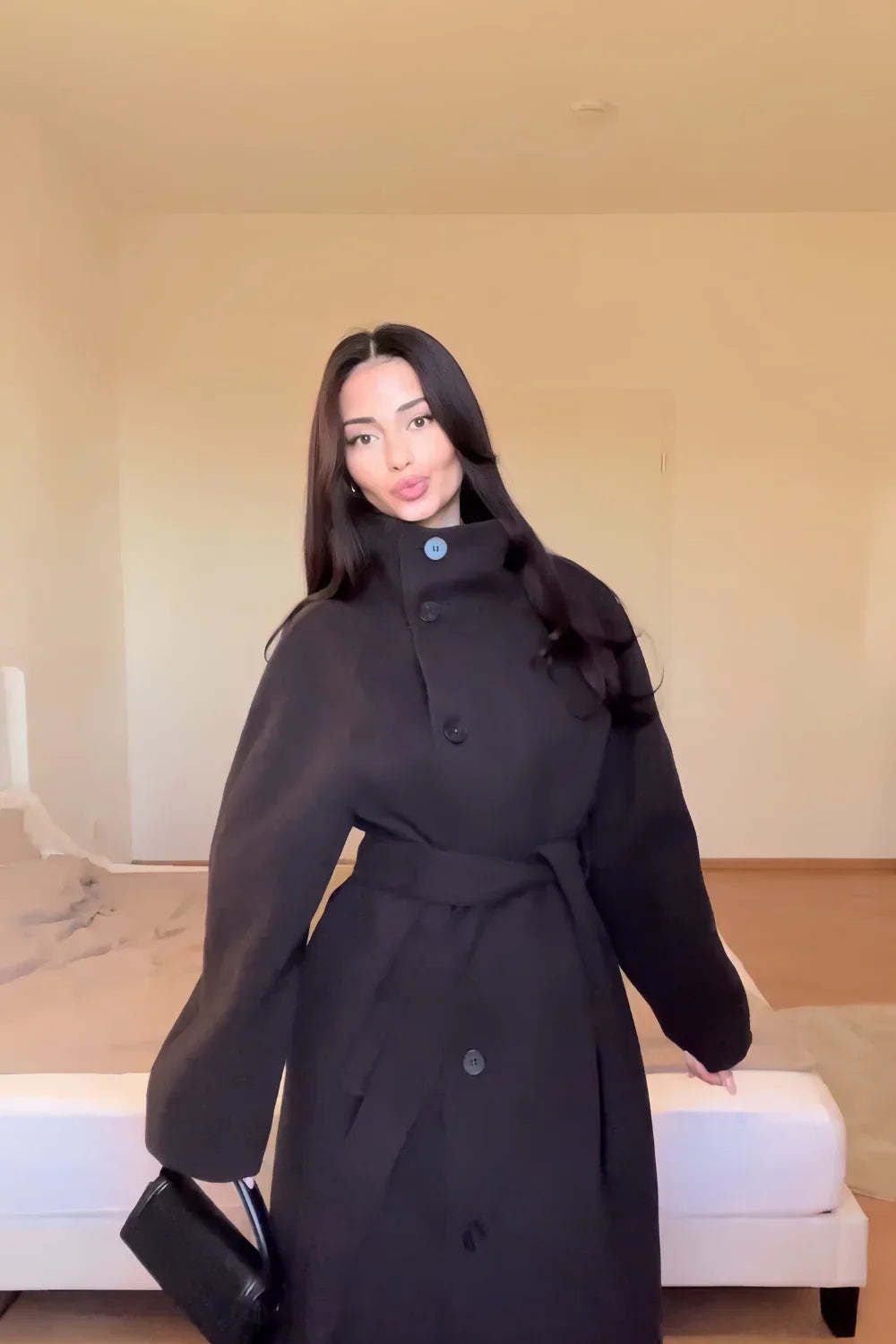 features a sculptural high neckline, refined button closure, and a self-tie belt that elegantly defines the waist.