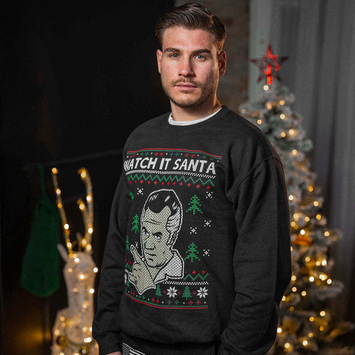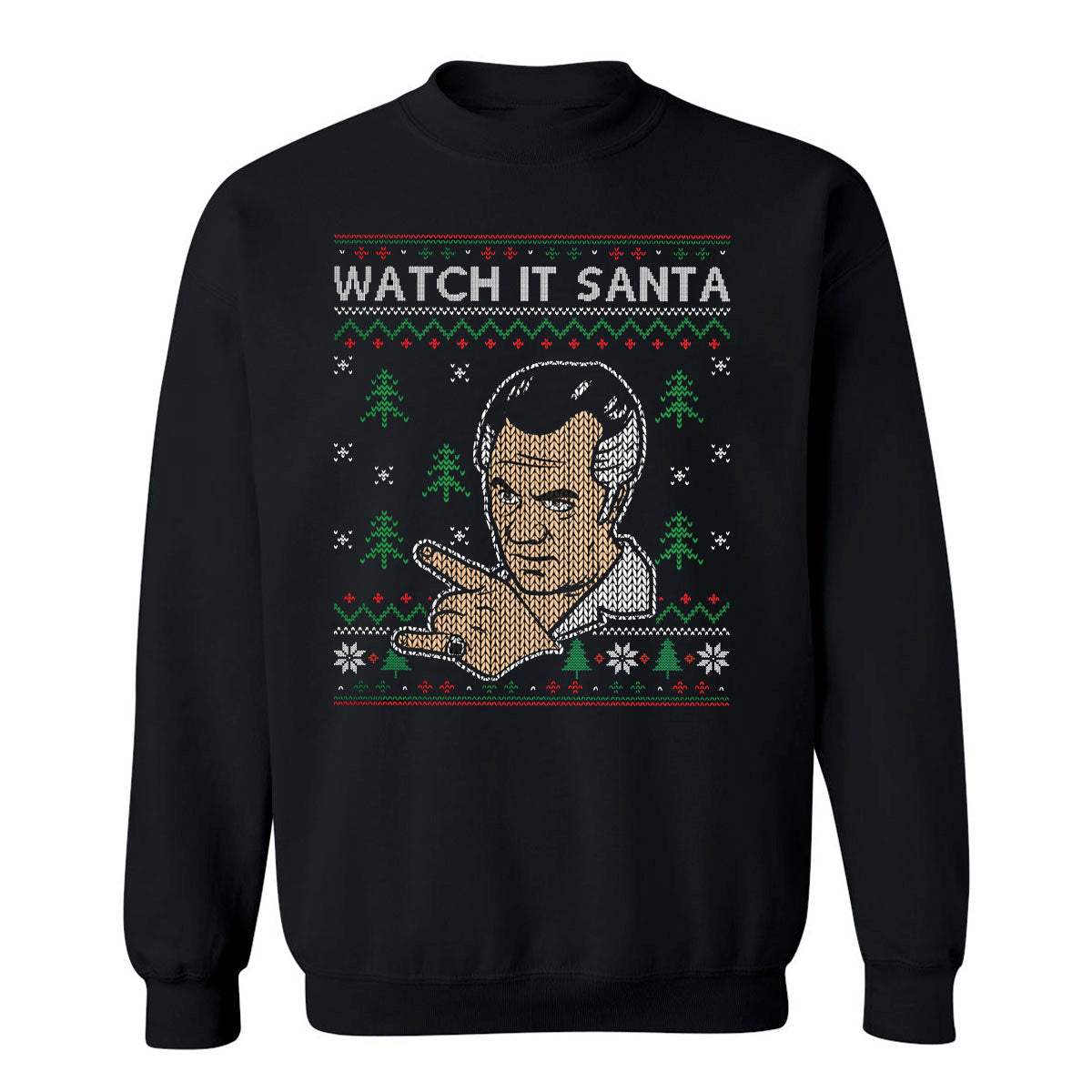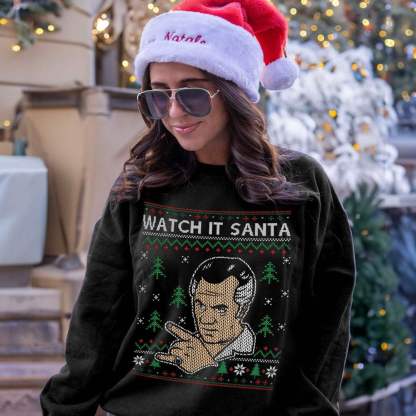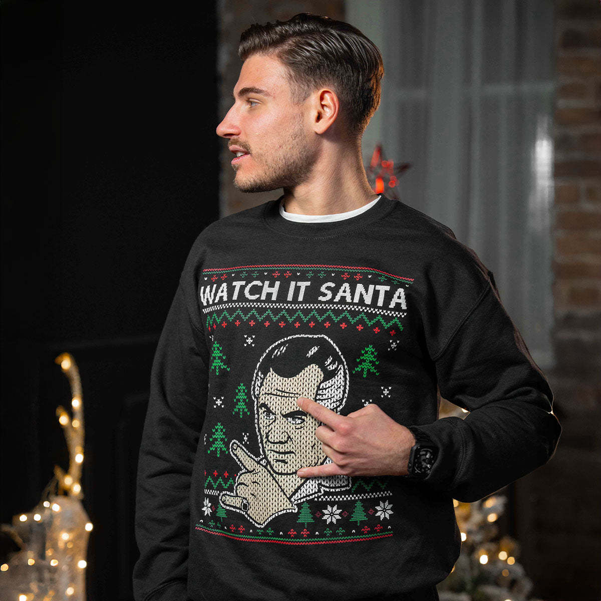 Add some tough-guy humor to your holiday wardrobe with the 'Watch It Santa' crewneck! This festive sweatshirt brings a bit of classic wiseguy charm to the Christmas season, perfect for anyone who likes to keep things merry with a little attitude – because when the boss says you're Santa Clause, you're Santa Clause!