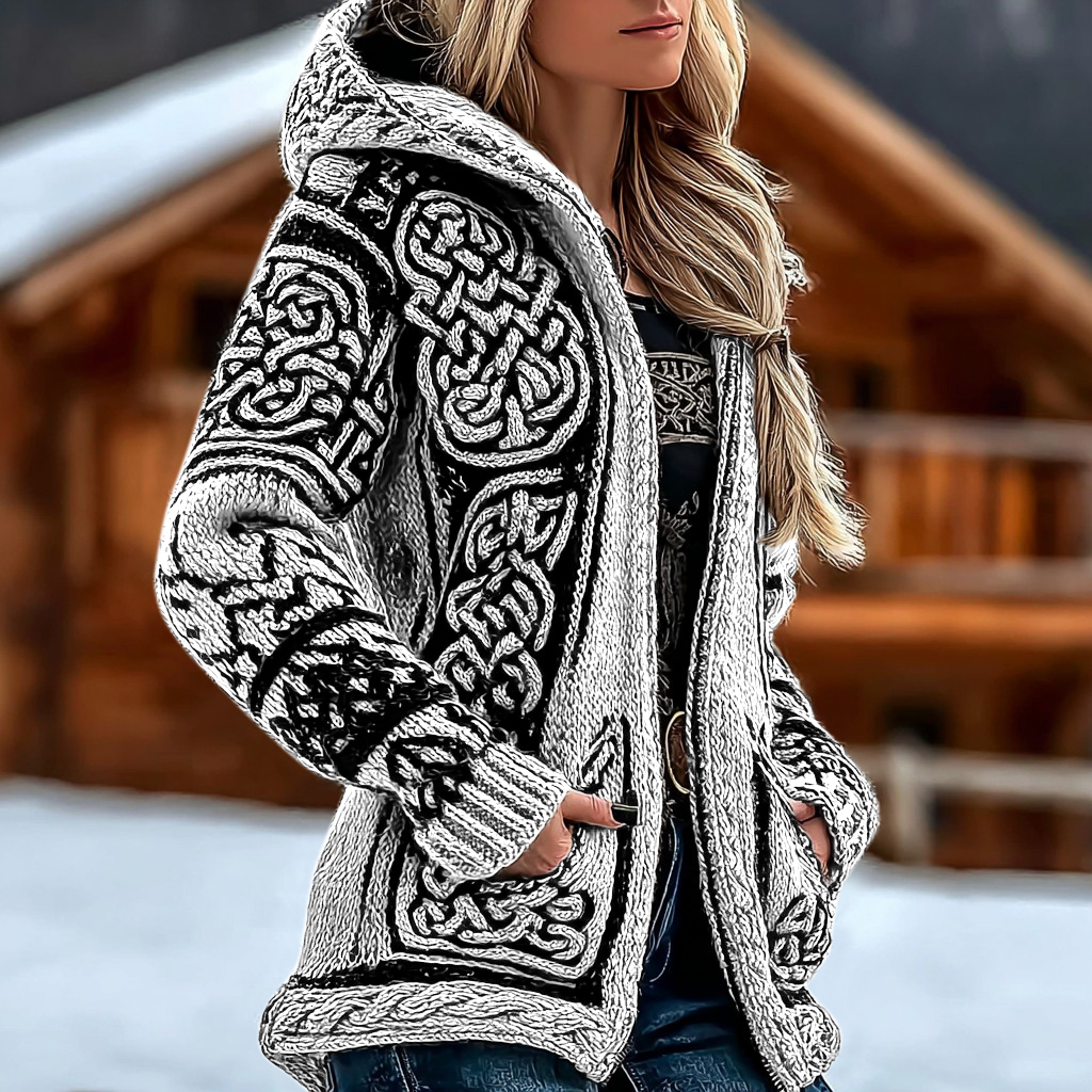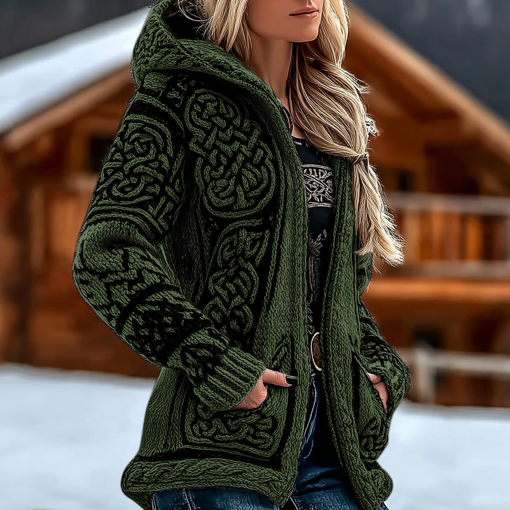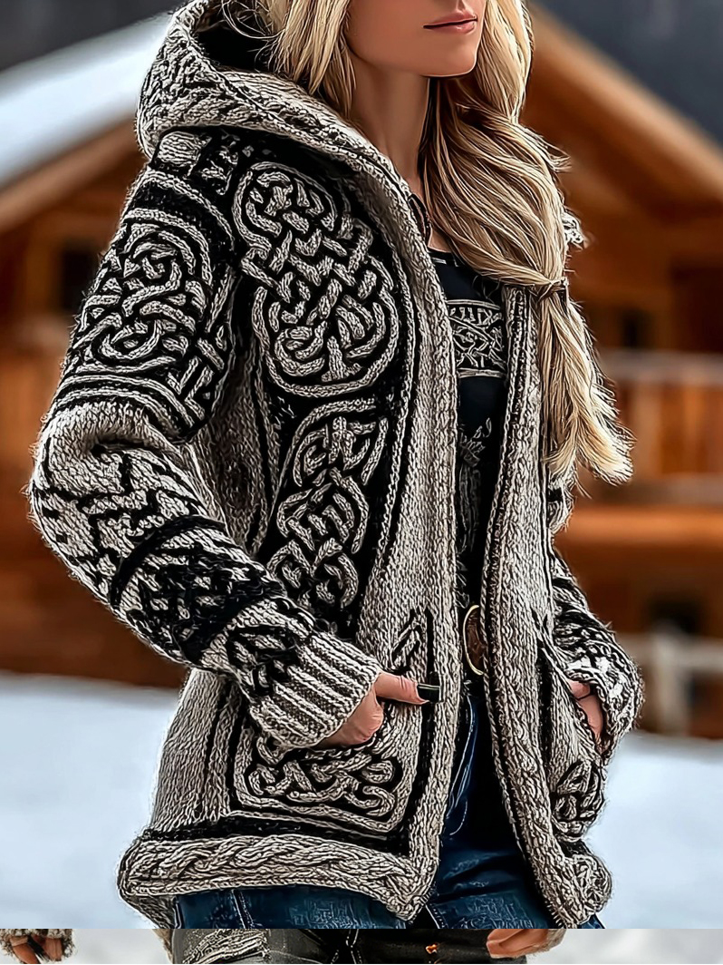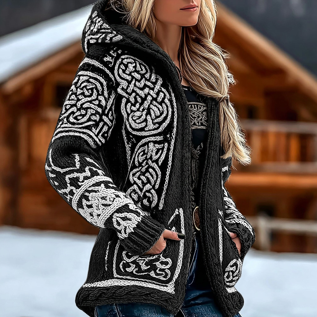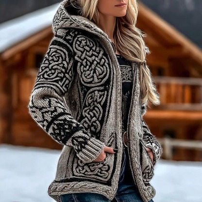 Women's Retro Viking Celtic Knot Jacquard Knit Zip-up Hooded Sweater