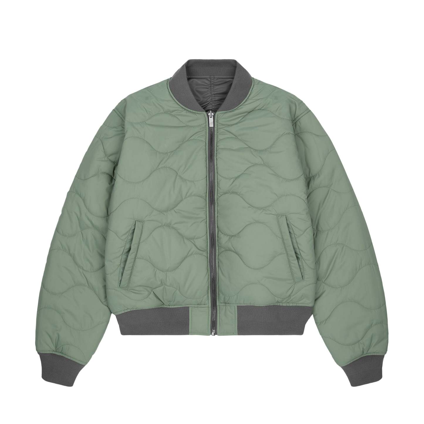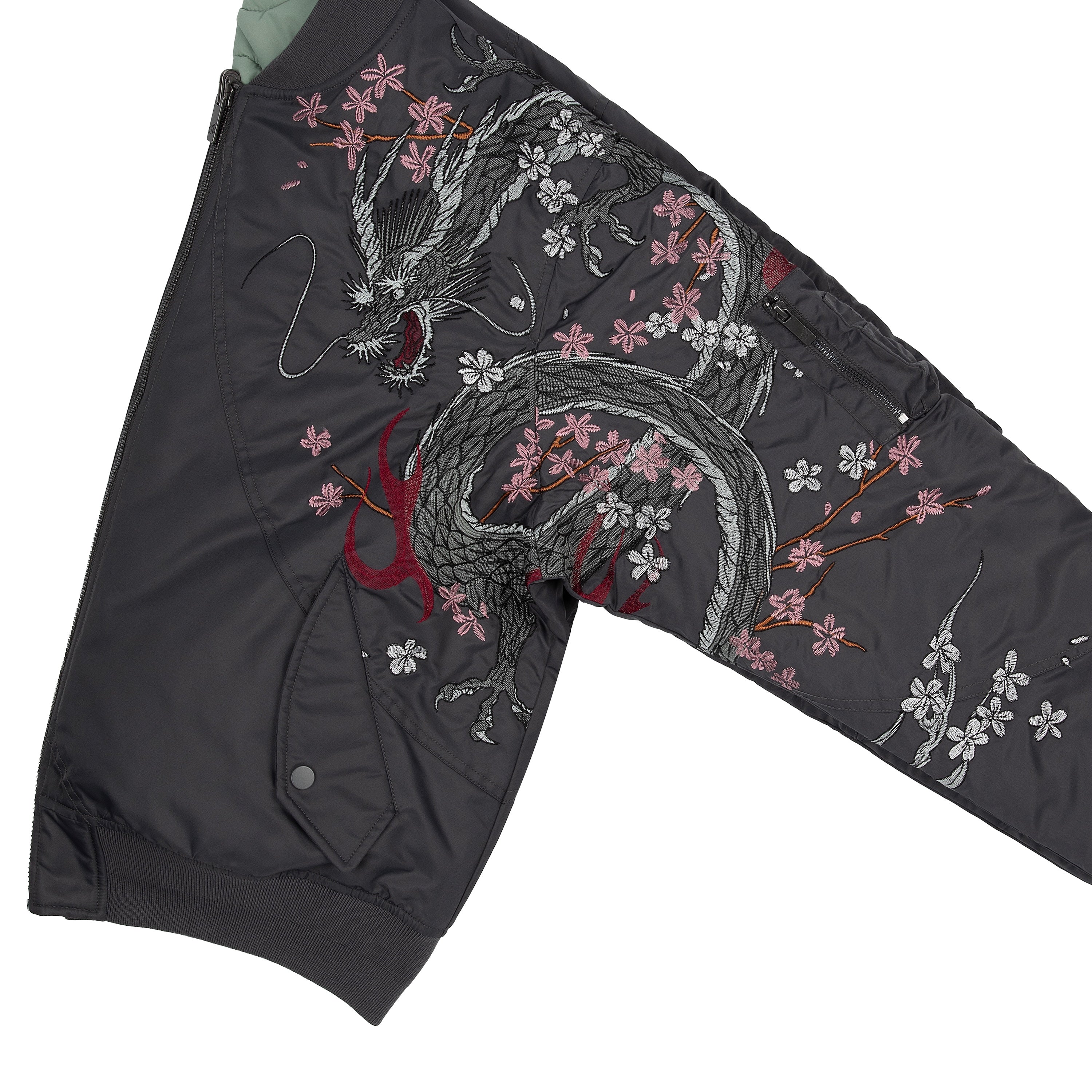 160gsm parachute fabric / 100% nylon / wind- and waterproof / capitone polyester lining / fiber filling / reversible / ribbed collar, hem and cuffs / embroidery on front, sleeve and back / diagonal-cut / with JKJ zipper / custom buttons / fits true to size